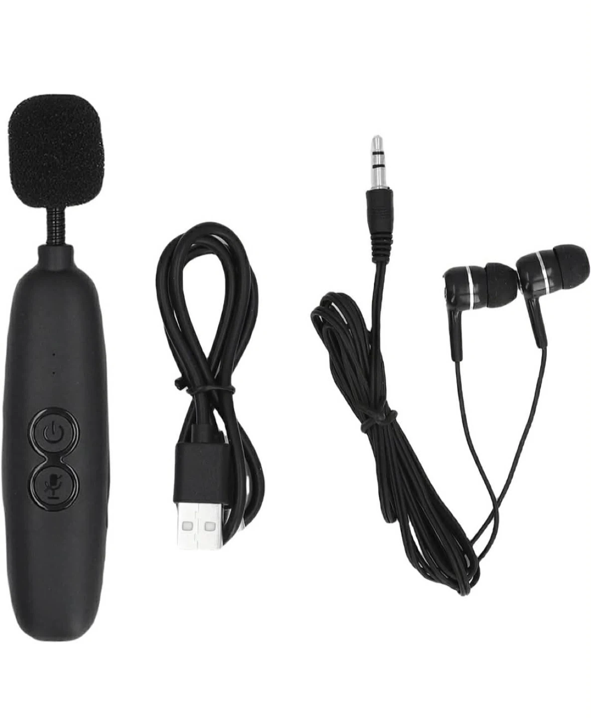 This is a black lavalier microphone with included earphones. It's lightweight and easy to operate. Includes a charging cable.