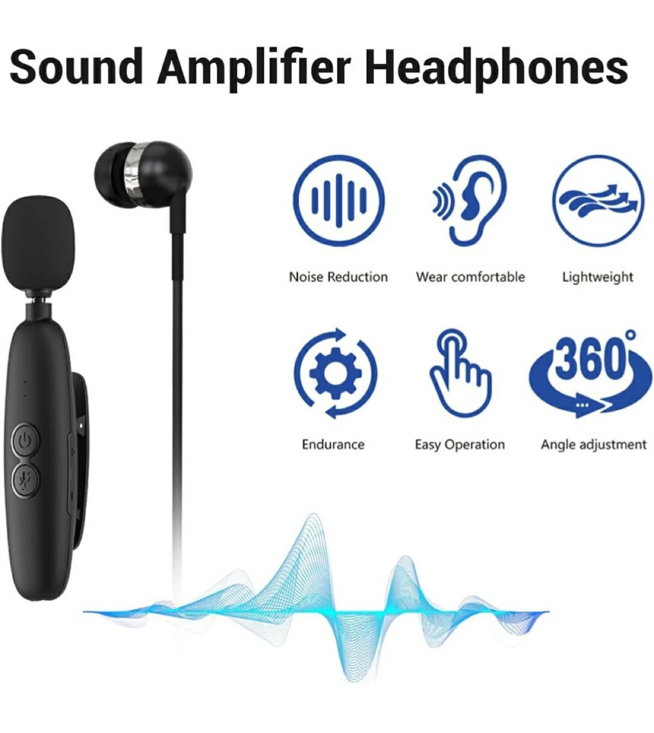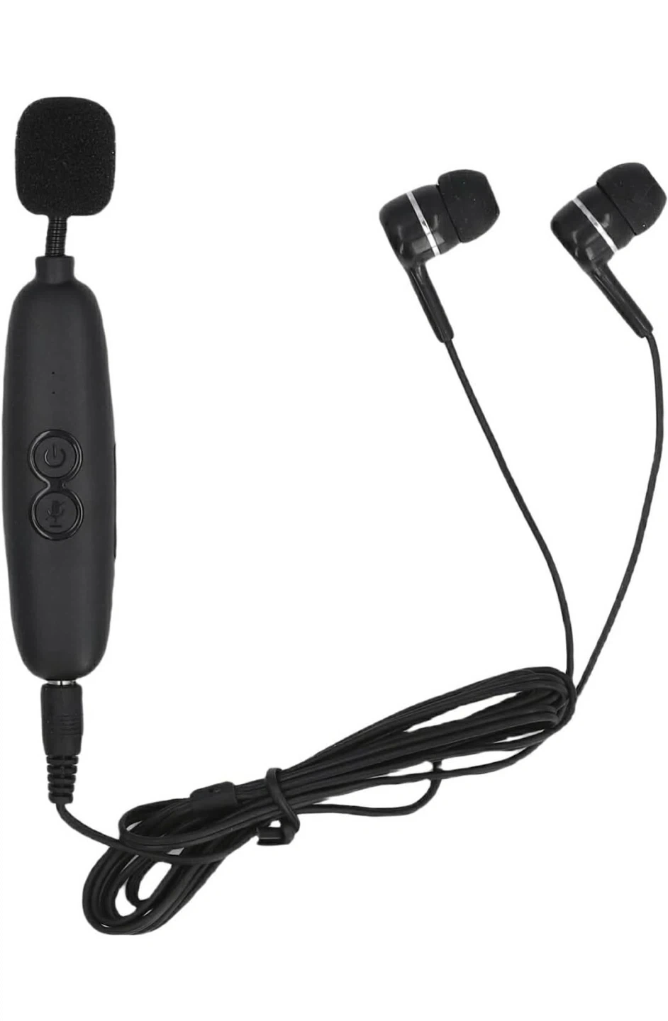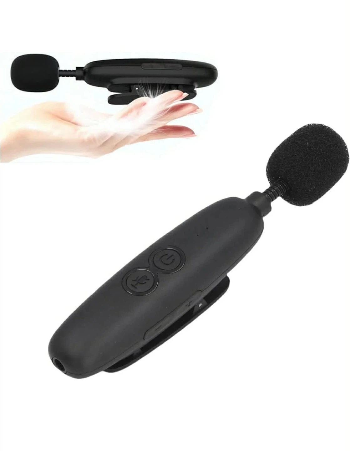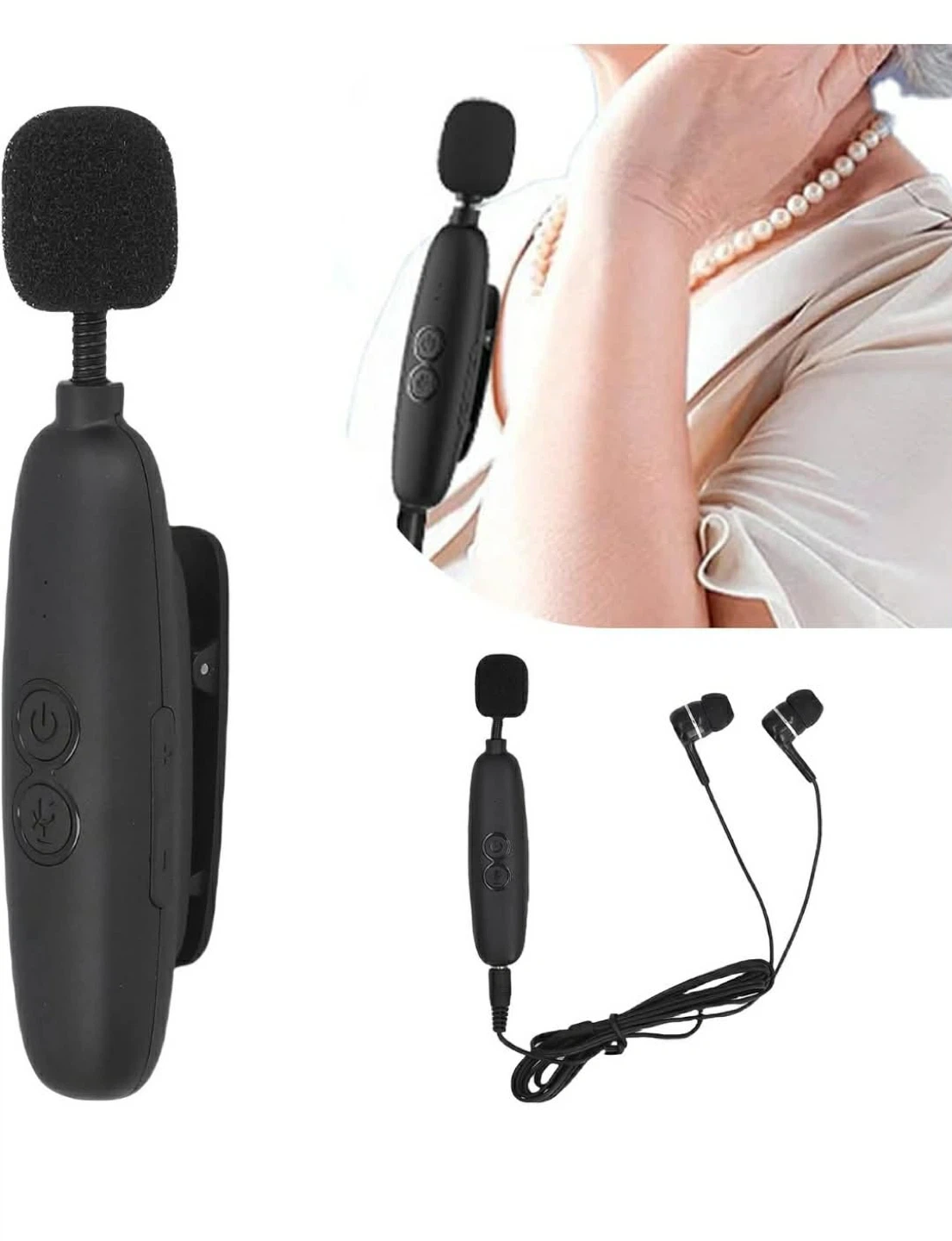 This is a black lavalier microphone with included earphones. It's lightweight and easy to operate. Includes a charging cable.
