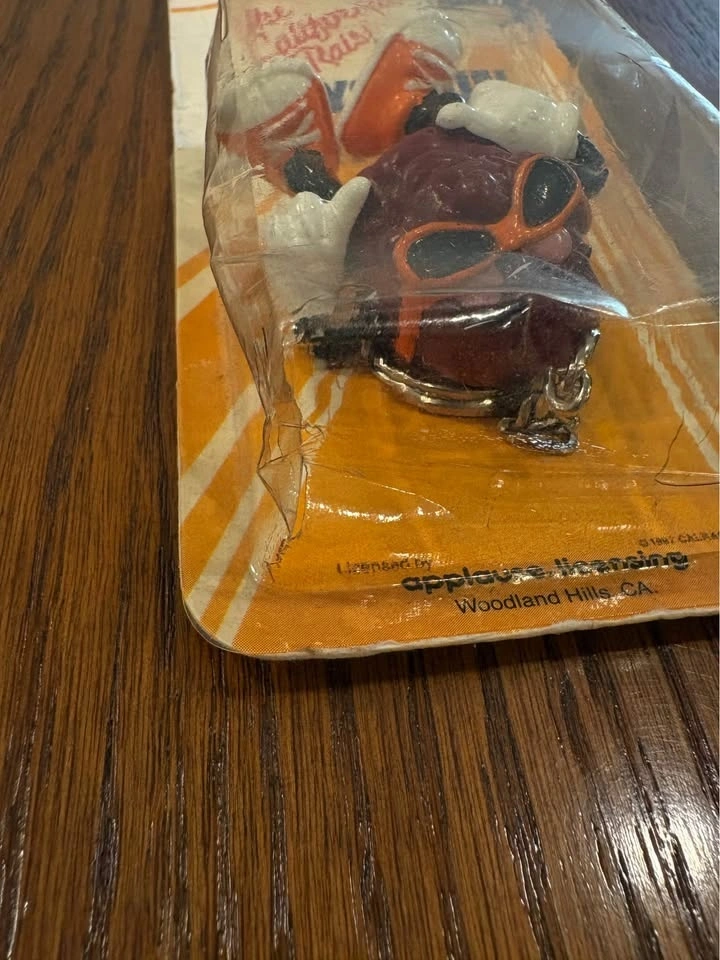 Original 1987 California Raisins keychain, still factory sealed on original backing card. Packaging shows age-related wear. Each corner of the card has small holes/edge damage, but the blister is intact and the keychain remains unopened and sealed. Great nostalgic 80s collectible for fans of The California Raisins or vintage promo merchandise. Sold as-is due to age.