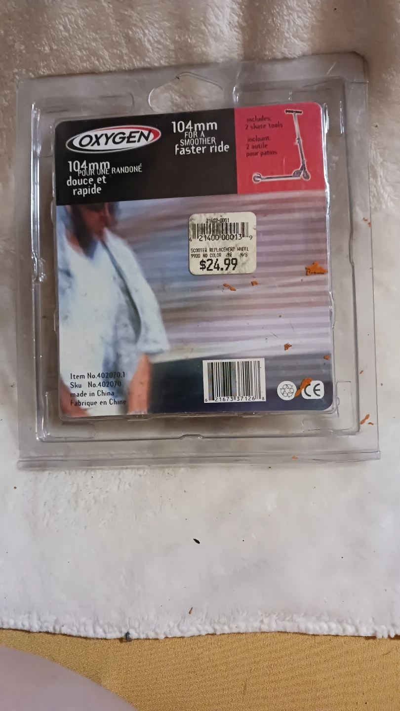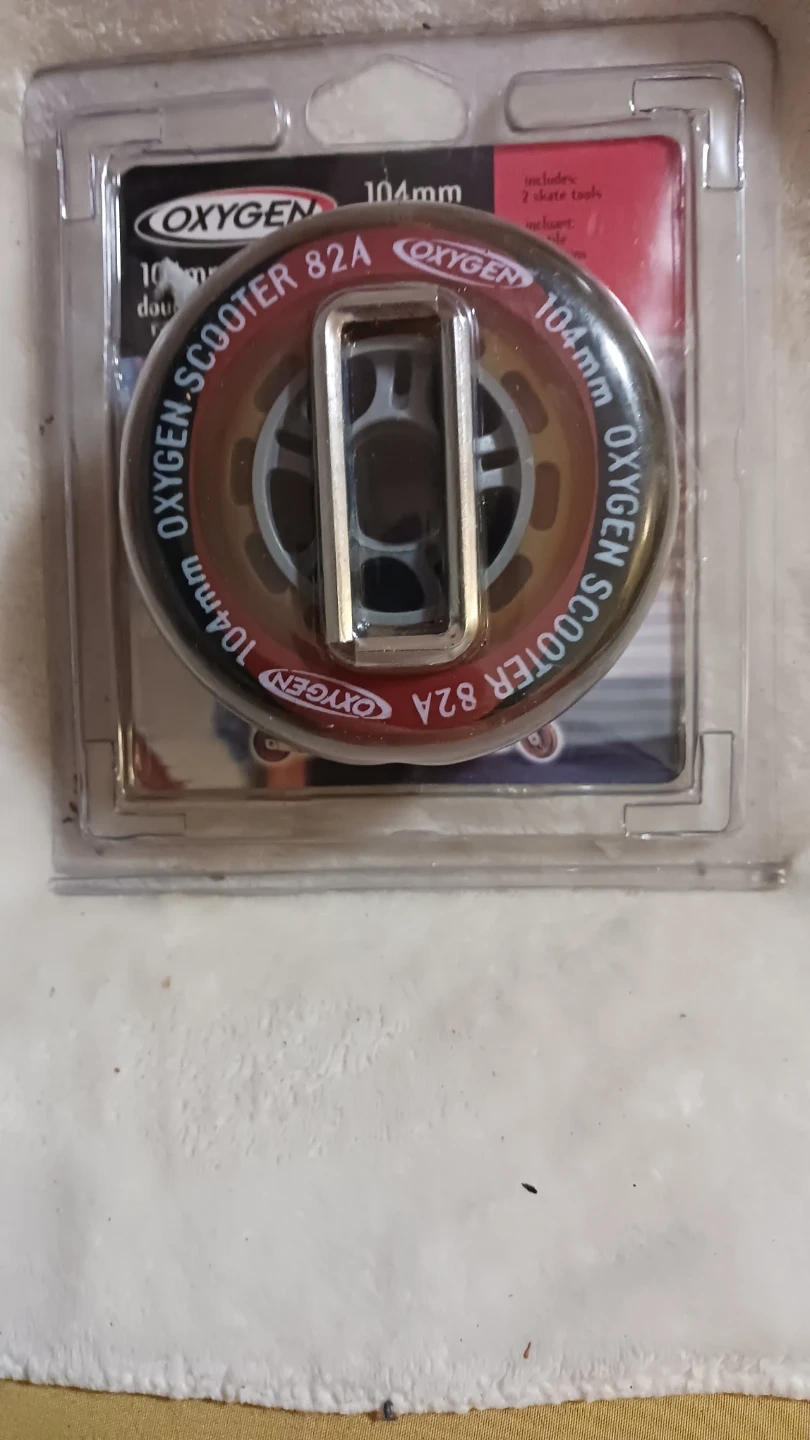 These are Oxygen 104mm scooter wheels with an 82A hardness rating. They are designed for a smoother and faster ride. Includes 2 skate tools. Brand new in package.... but vintage style!