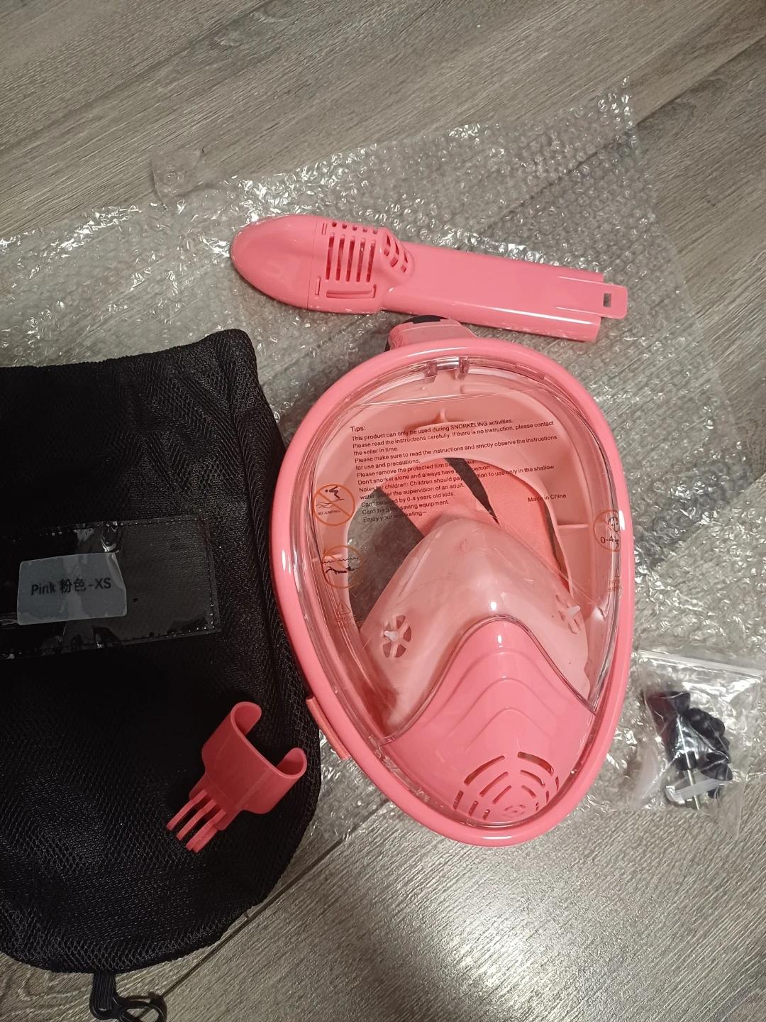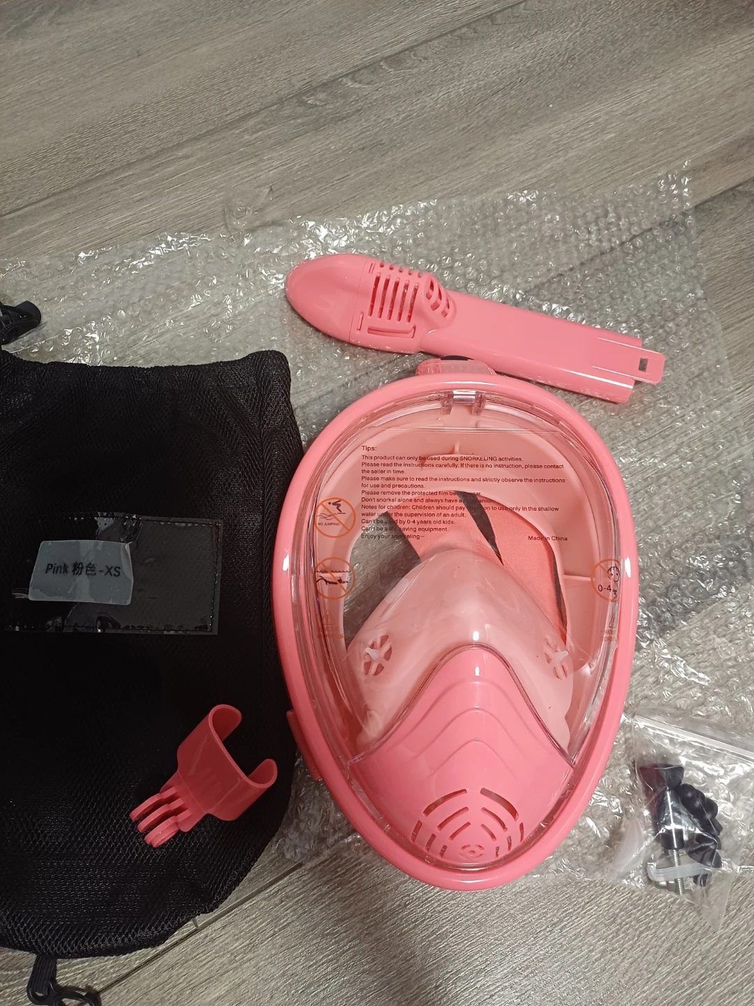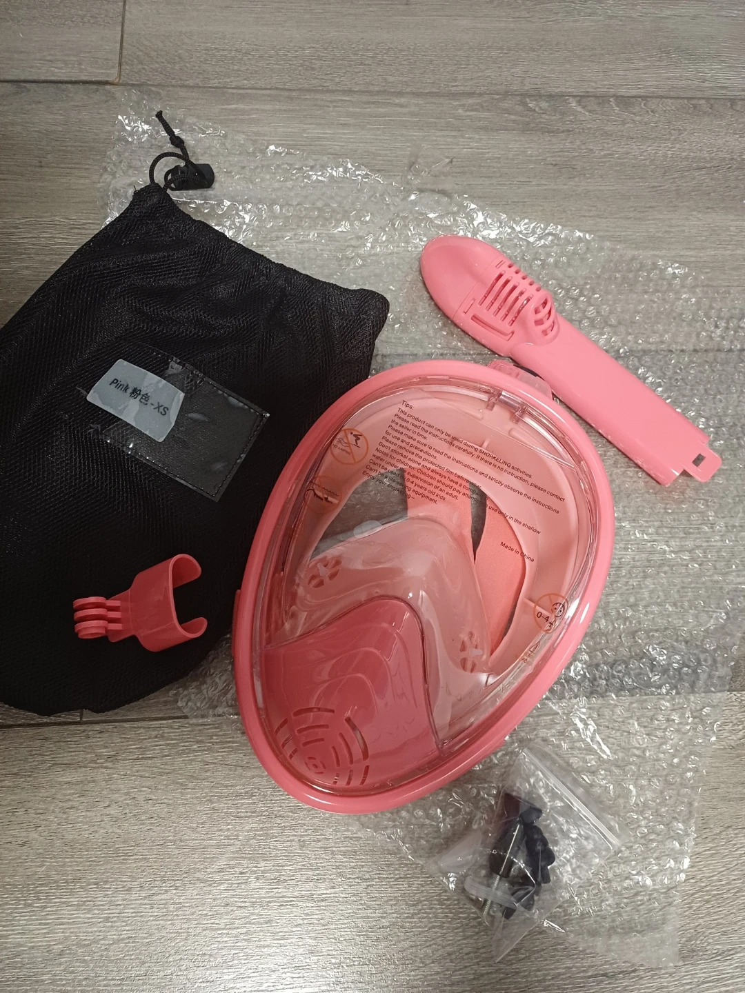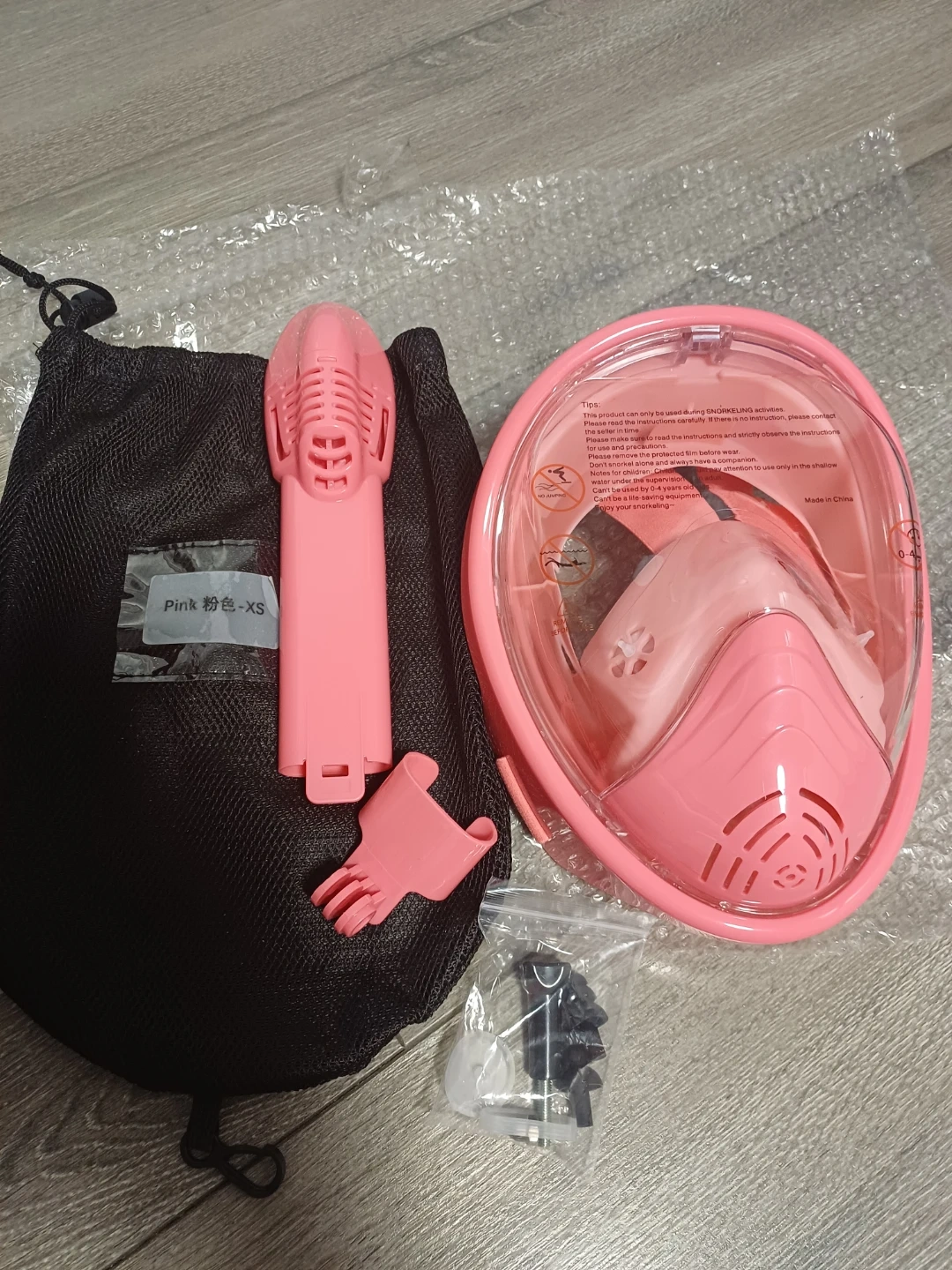 This is a pink, extra-small full-face snorkel mask. It comes with a storage bag and snorkel tube. Designed for water activities.