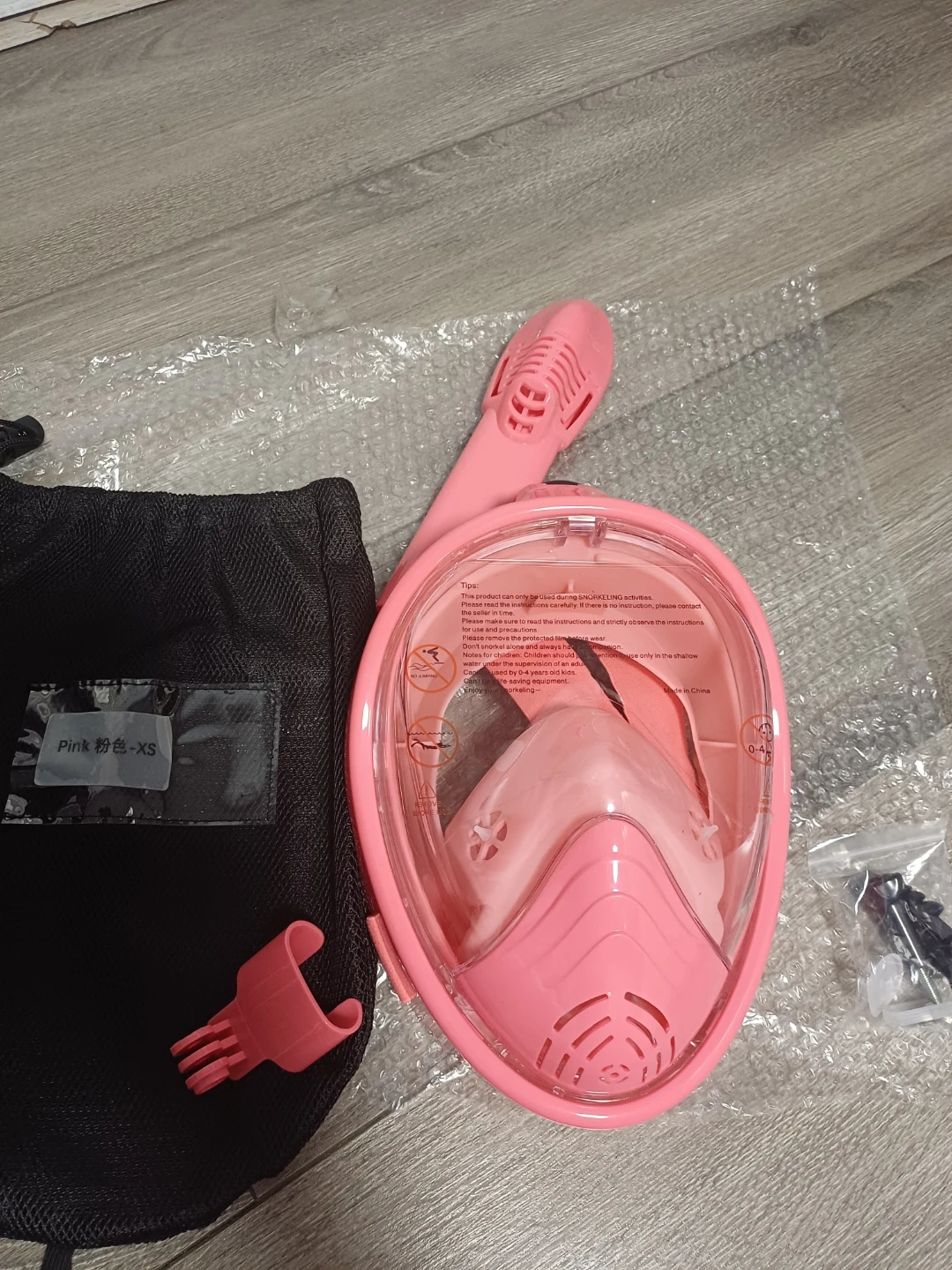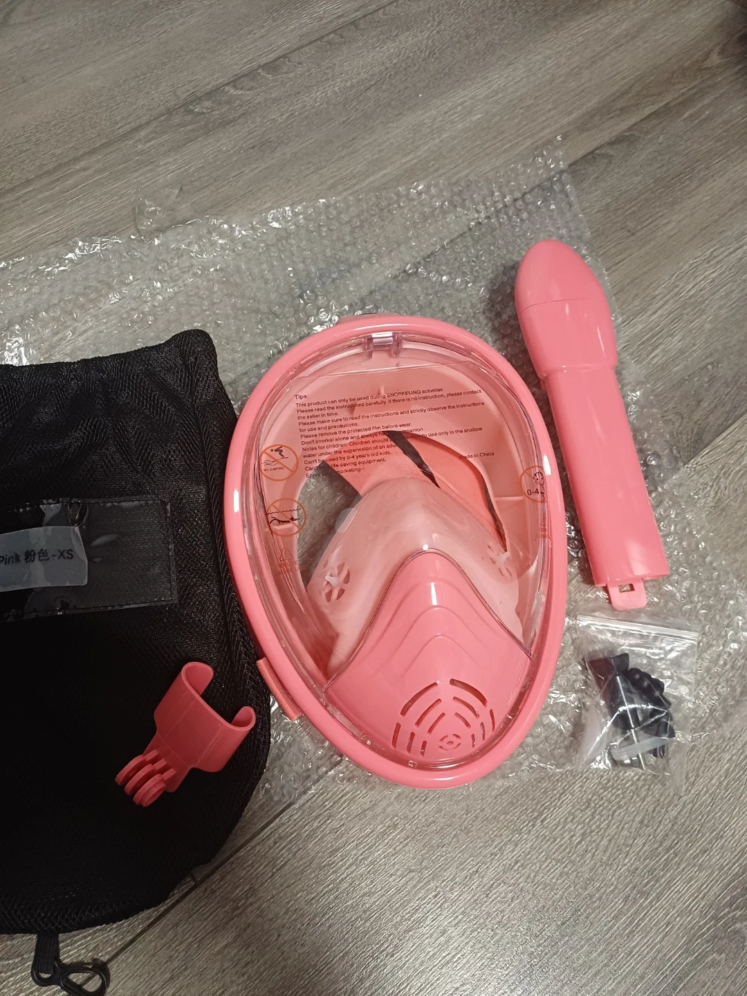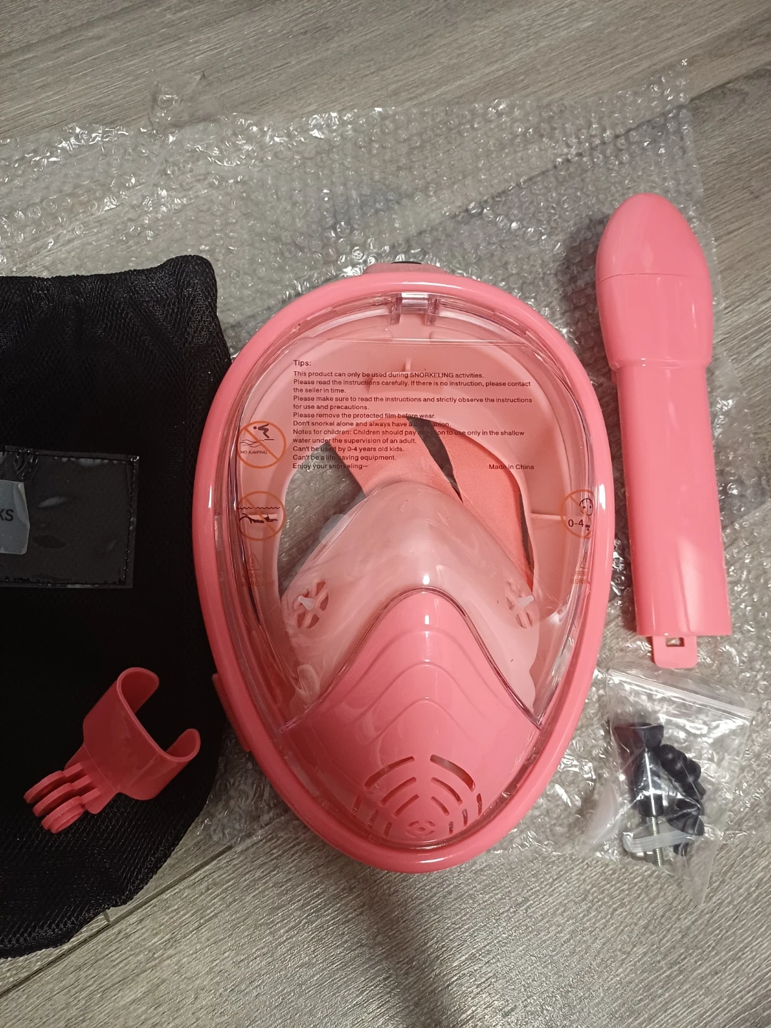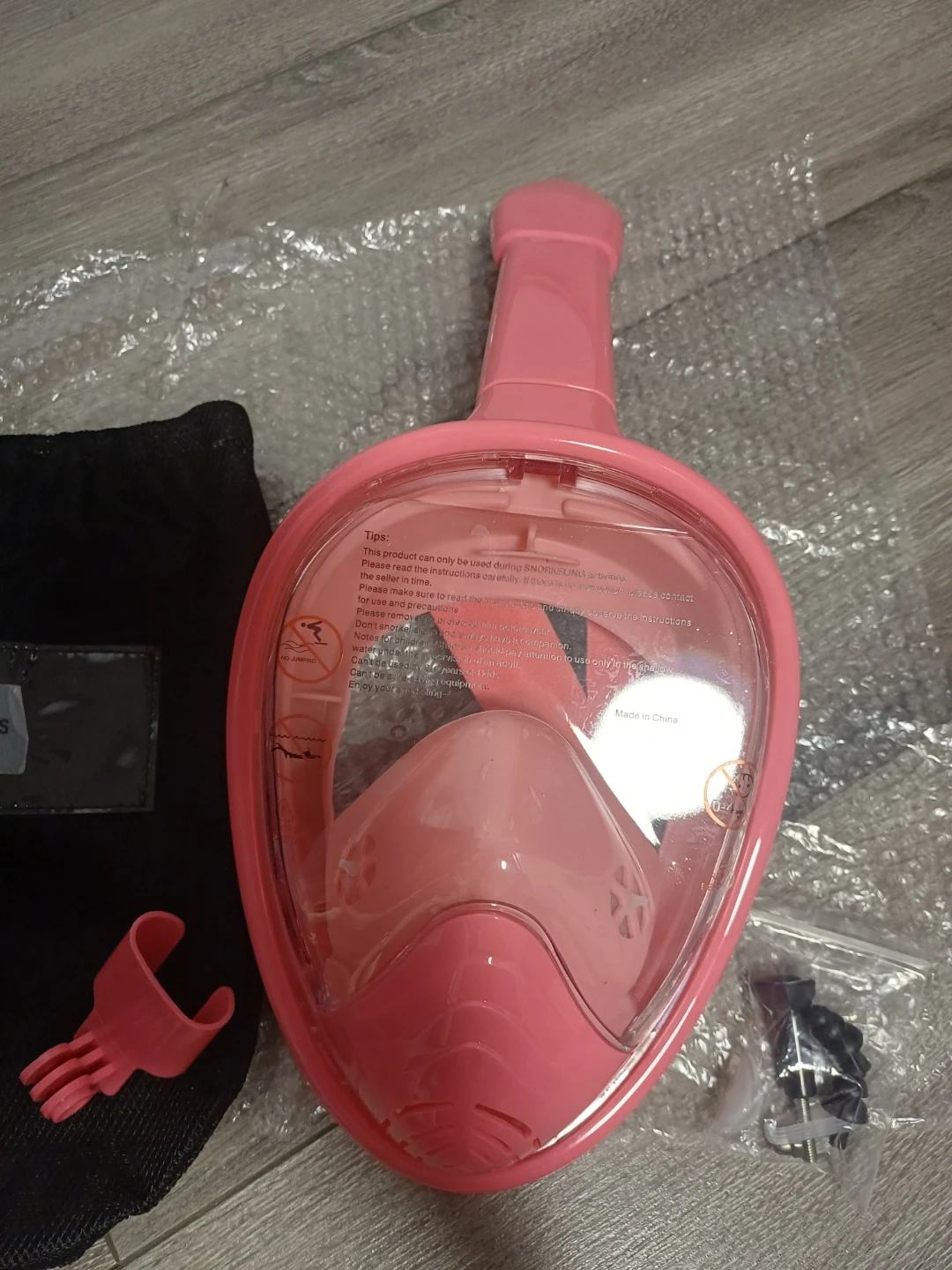 This is a pink, extra-small full-face snorkel mask. It comes with a storage bag and snorkel tube. Designed for water activities.