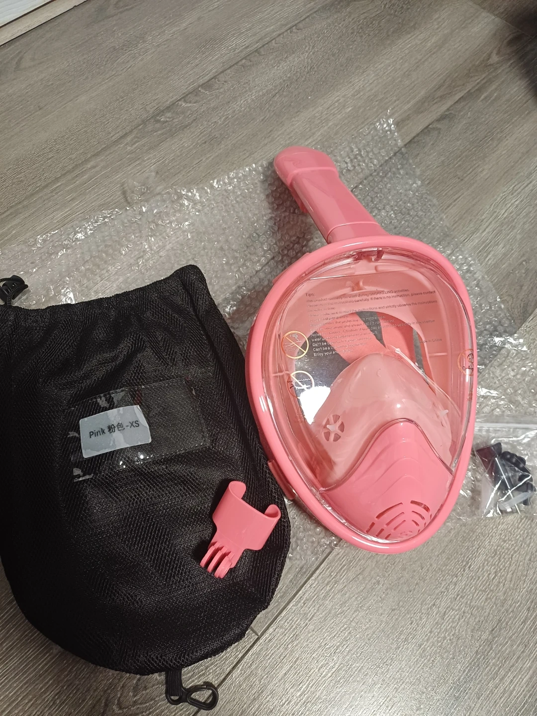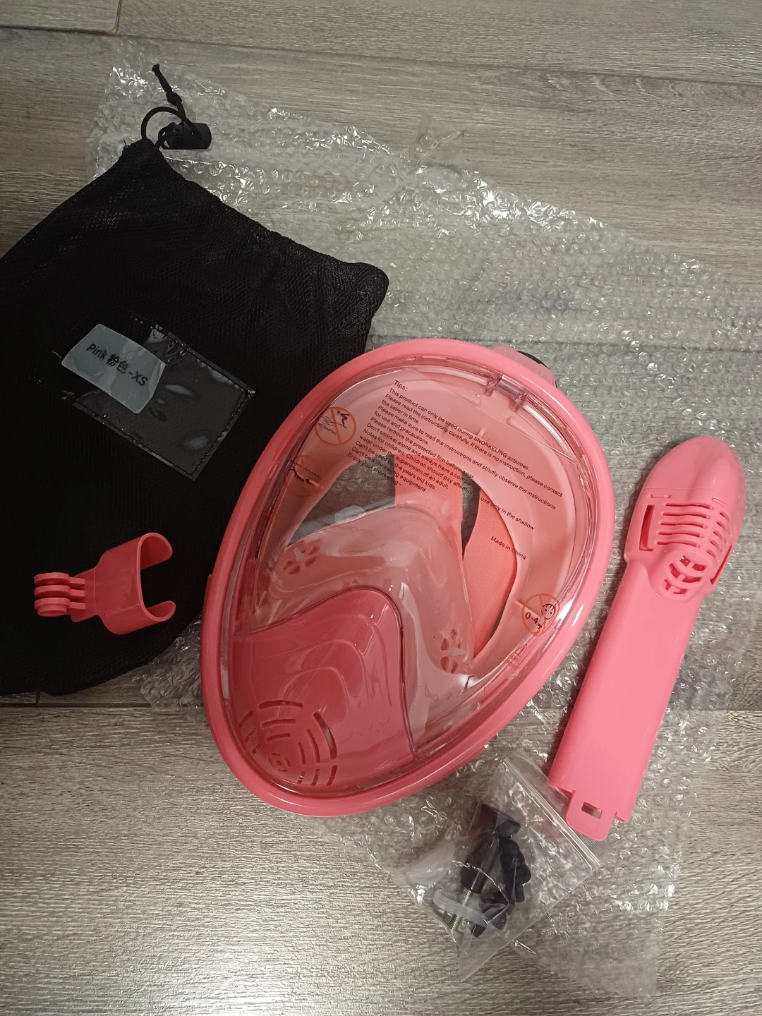This is a pink, extra-small full-face snorkel mask. It comes with a storage bag and snorkel tube. Designed for water activities.