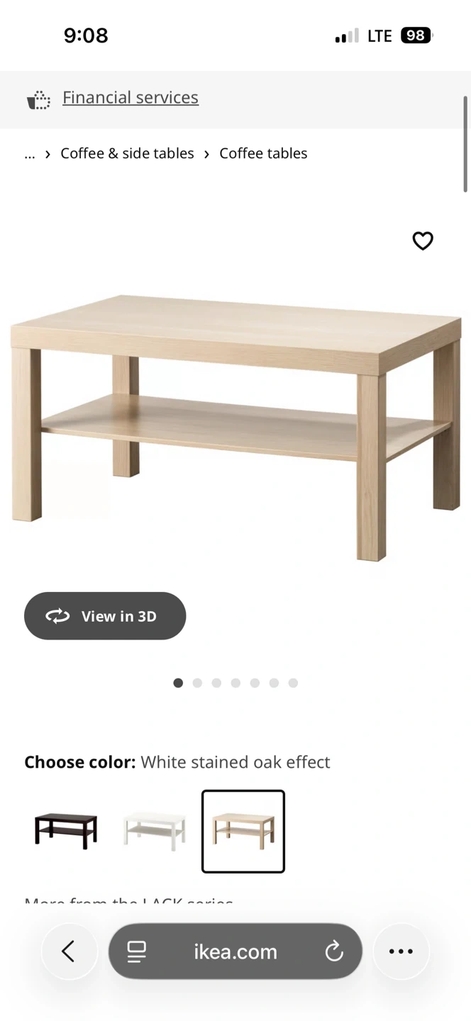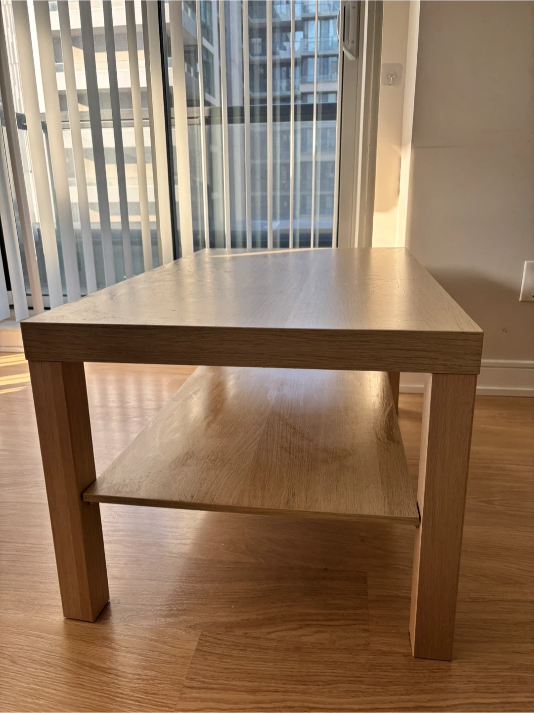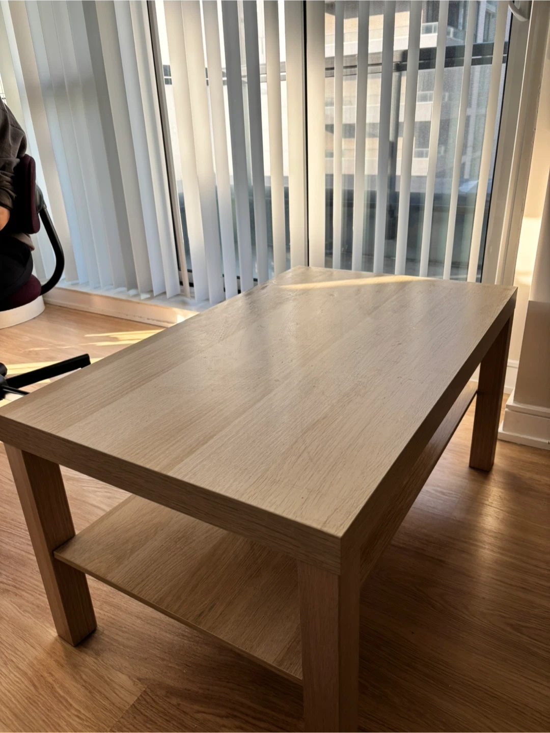 This is an IKEA LACK coffee table in a white stained oak effect finish. It measures 90x55 cm. It's a simple and practical addition to any living space. Will be fully cleaned and disinfected before transferring to new owner