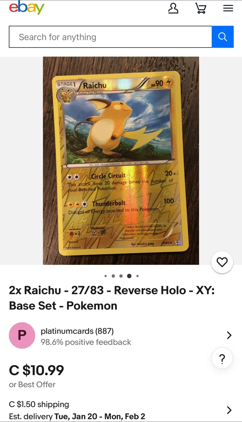 1 / 21 / 2Buy & SellRaichu 27/83 Reverse Holo - XY: Base SetRaichu 27/83 Reverse Holo - XY: Base Set$5Selling a Raichu 27/83 Reverse Holo card from the XY: Base Set Pokemon collectionWHERE TO MEETCheck LocationView MapSELLERverifiedMister LeoSpruce Village24216 reviews0 chats·0 favorites·6 viewsSEND CHAT TO SELLERHi Mister Leo! I’m interested in your listing.Hi Mister Leo! I’m interested in your listing.Get the Karrot app to chatSign In to chat