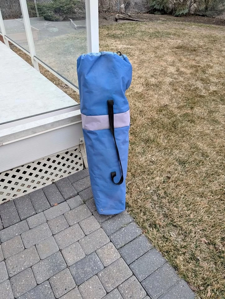 This foldable lawn chair is used but still in good condition. Comes with a carrying bag and multiple cupholders on the arm rests. Perfect for a deck or backyard or for the soccer field.
