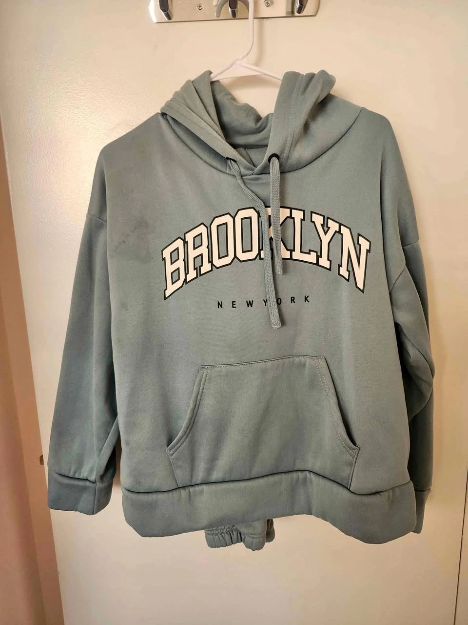 155Brooklyn New York Hoodie & Jogger Set – Unisex Casual Outfit 🩶 Stay comfy and stylish with this cozy Brooklyn New York tracksuit set! Perfect for casual wear, lounging, or running errands. ✨ Details: Includes: Hoodie + Jogger Pants set Color: Slate Blue / Greyish Blue Shirt size L and joggers size M Size: M (fits teens or adults depending on fit preference) Soft fleece interior for extra warmth Elastic waistband & cuffs for a comfy fit “Brooklyn New York” print on both hoodie and pants 🏡 Pick up: Brock Road & Pickering Parkway 🚭 Smoke-free, pet-free home 💵 Cash only Perfect cozy outfit for fall & winter! ❄️
