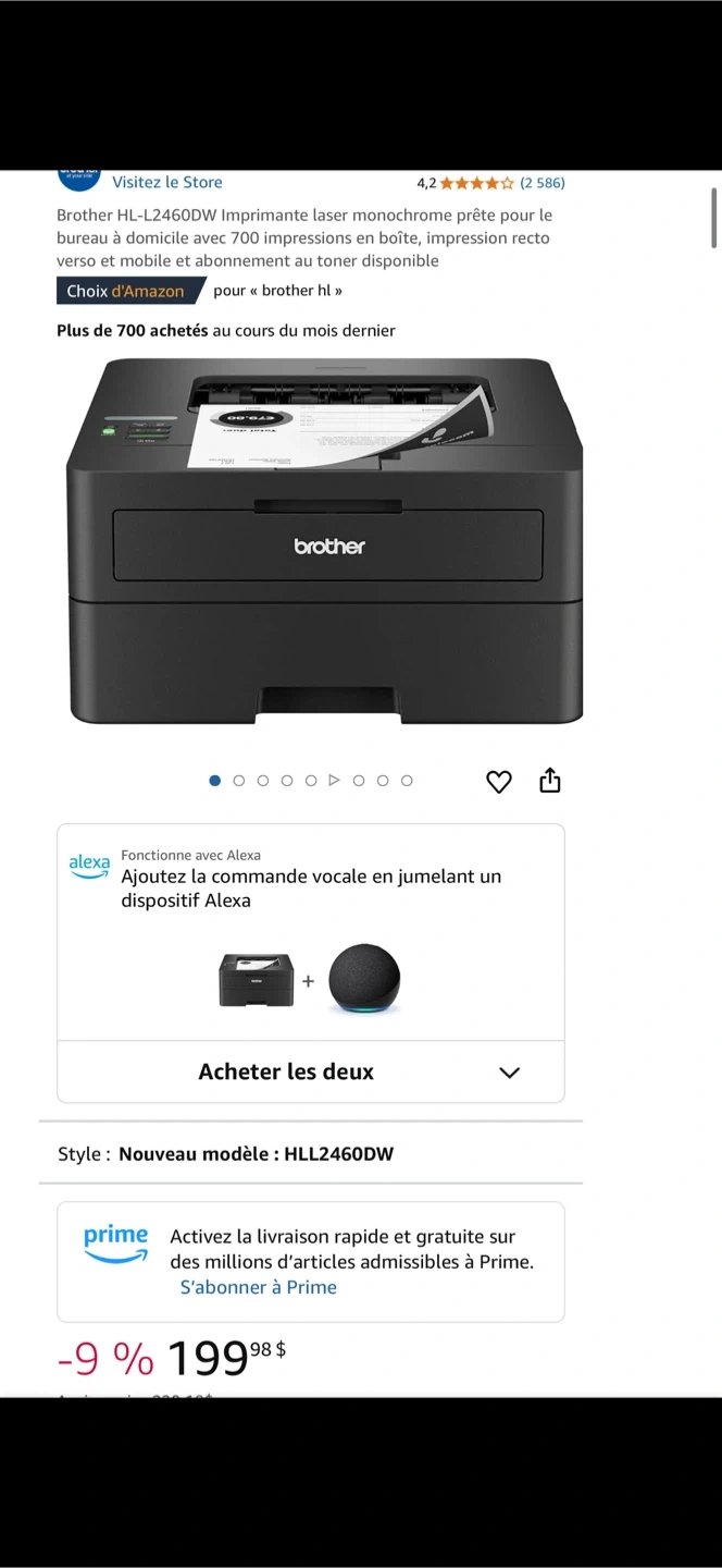 20Selling a Brother HL-L2460DW monochrome laser printer. It's perfect for home or office use, printing up to 700 impressions. It offers duplex printing and is compatible with Alexa. The original price was $199.98.