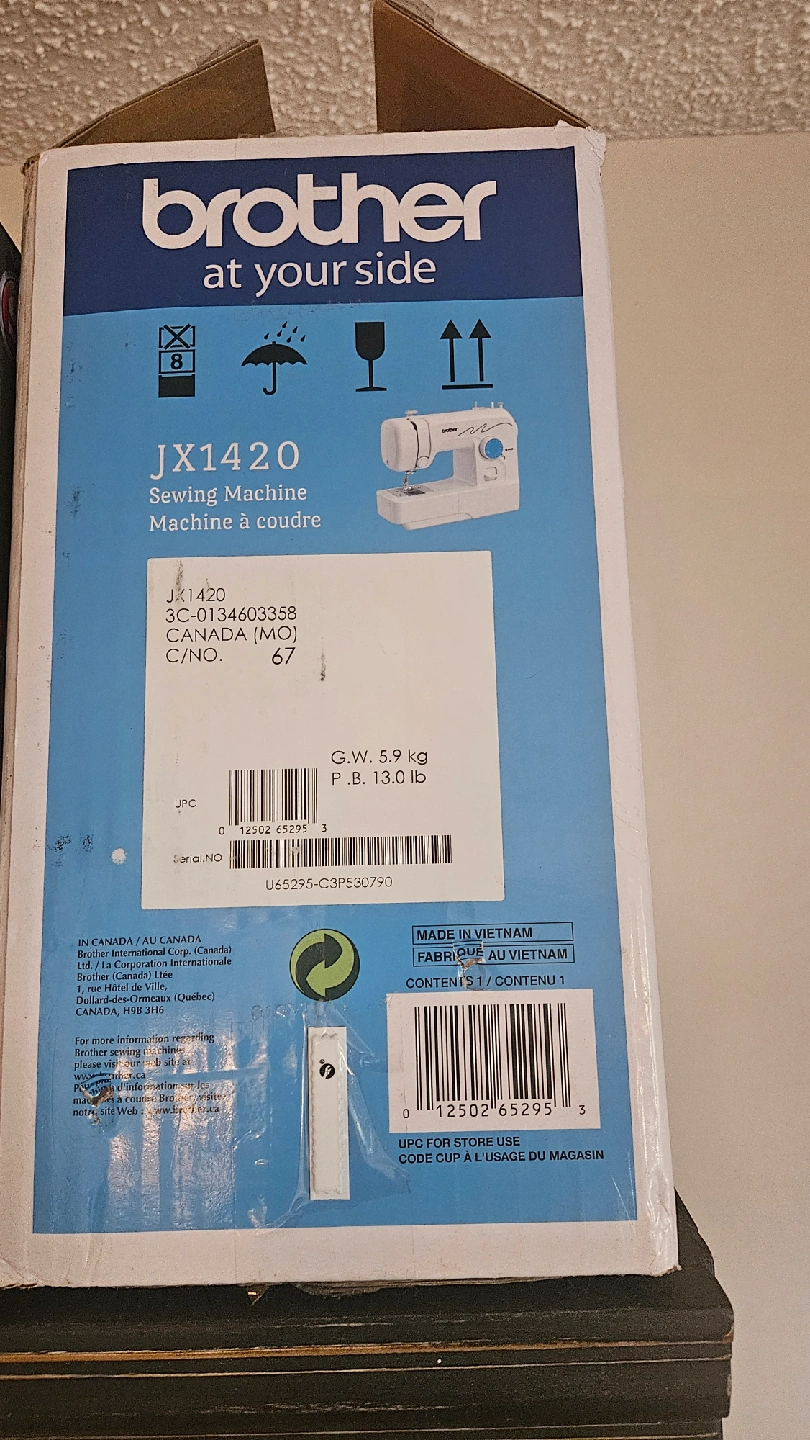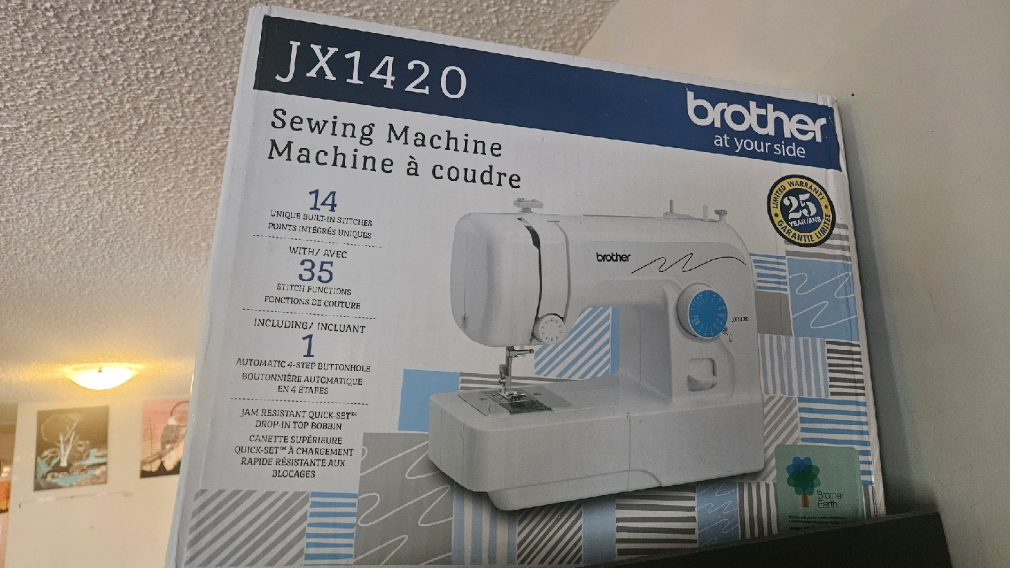 Selling a brand new Brother JX1420 sewing machine, still in its original box! It features 14 unique built-in stitches and 35 stitch functions. Includes an automatic 4-step buttonhole. The box has some wear but the machine is untouched