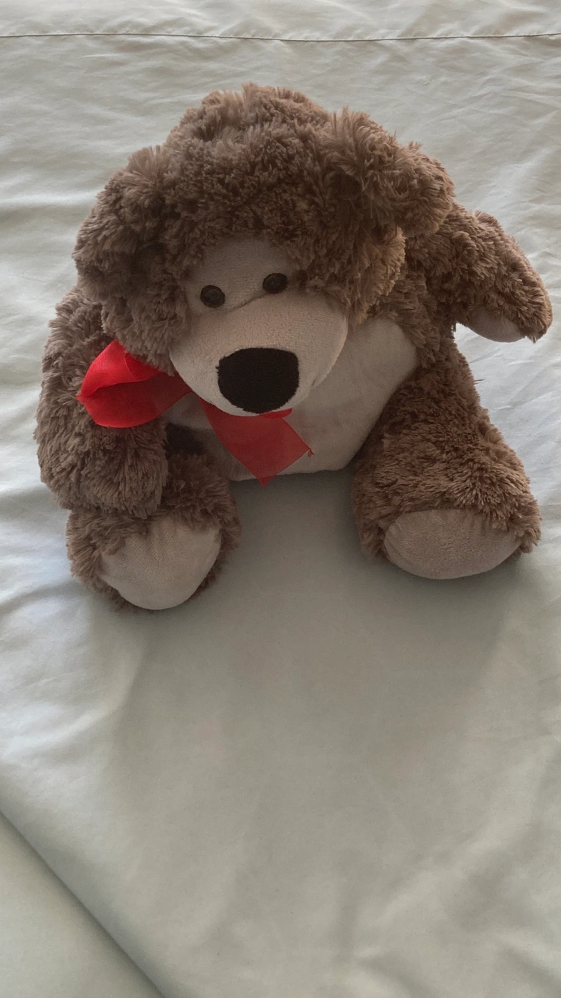 Adorable brown teddy bear. Soft plush material. Features a red ribbon around its neck.