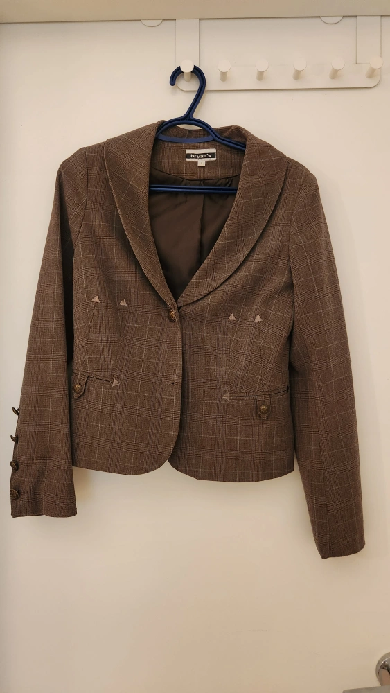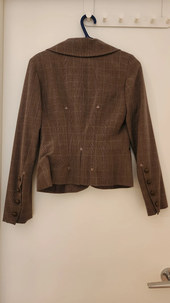 Brown plaid blazer with gold buttons and soft shoulder pads. Size small.