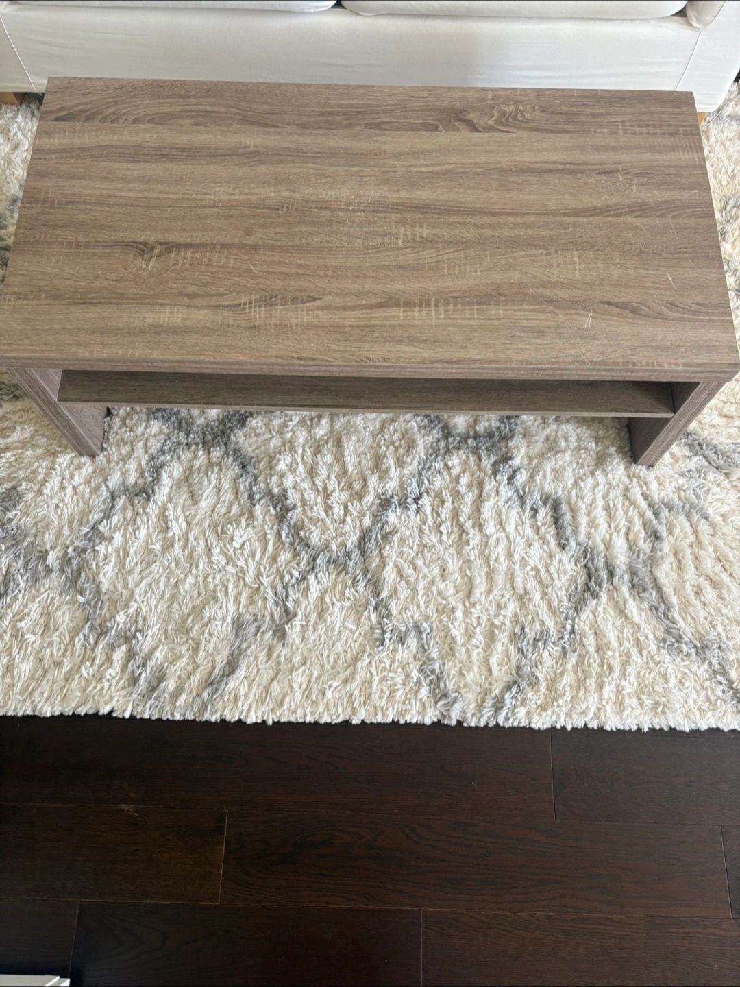 Selling a coffee table. It has a handy shelf underneath for extra storage or displaying items. The table is a neutral brown colour, so it will fit in with any decor. It has some wear but nothing that cannot be re-stained . Perfect for your living room or den!