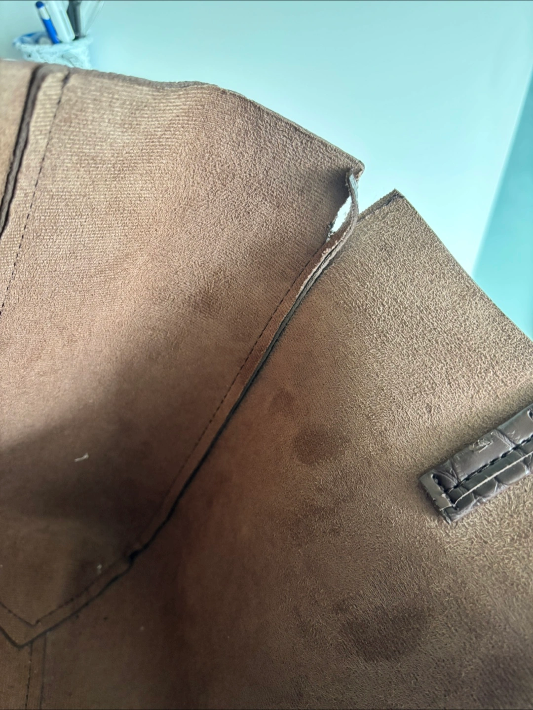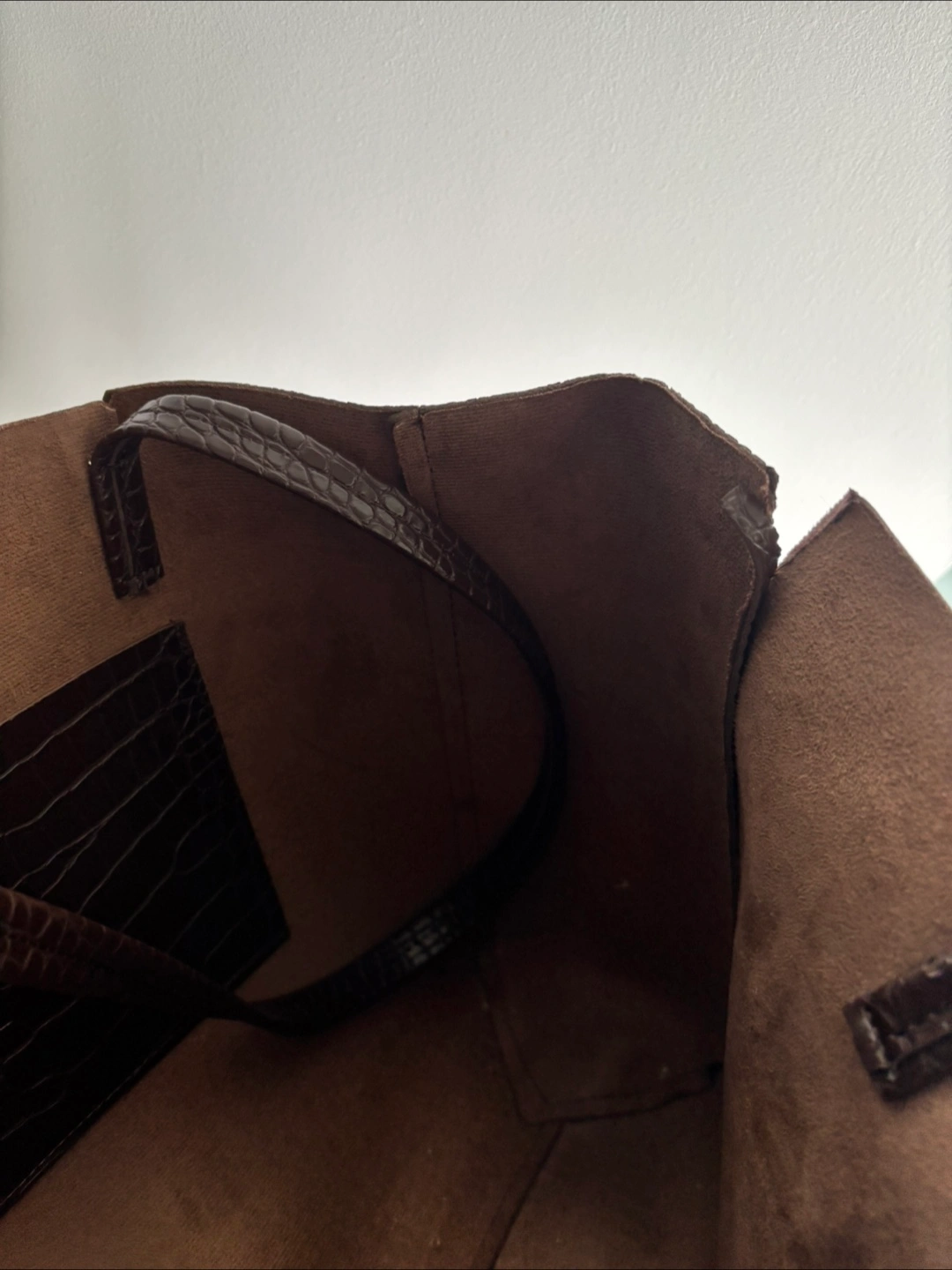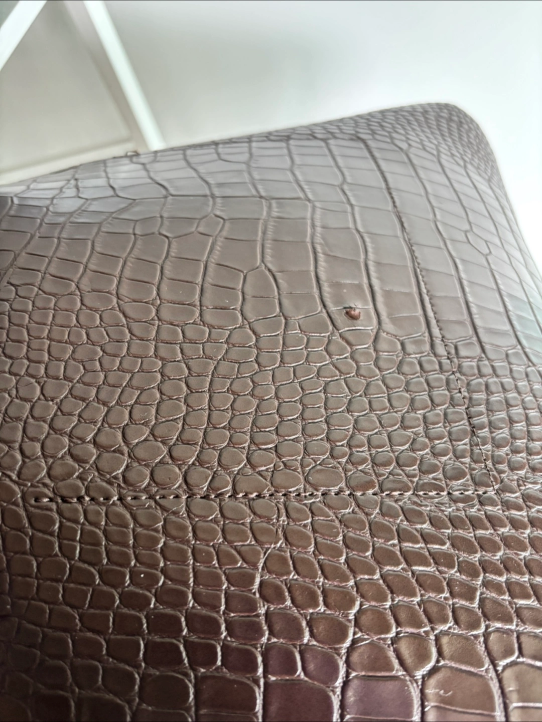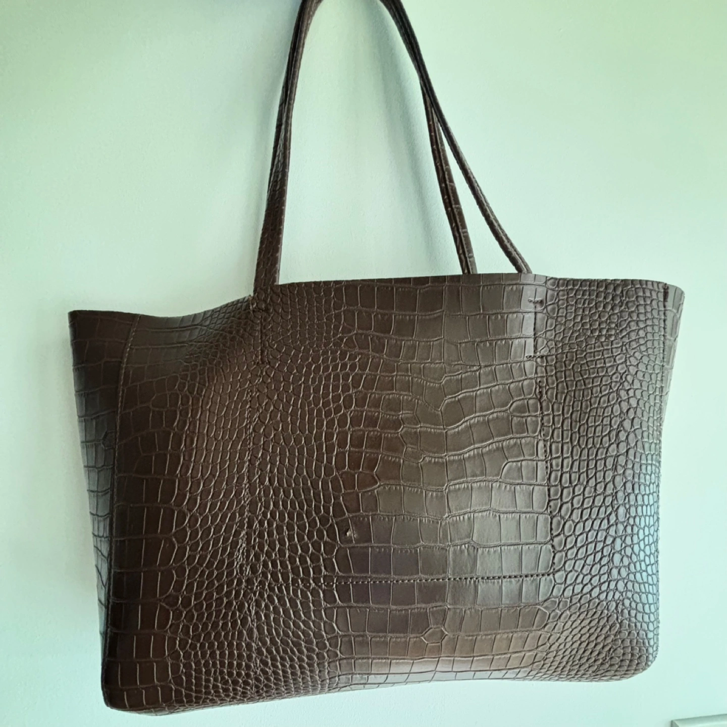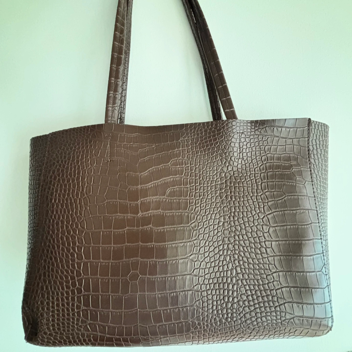 Here's a stylish brown tote bag with a croc-embossed texture. It's perfect for work or carrying your everyday essentials. Selling low due to wear and tear but the bag is still functional! Fits a 14-in MacBook Pro Available for pick up near Yonge-Eglinton Cash only