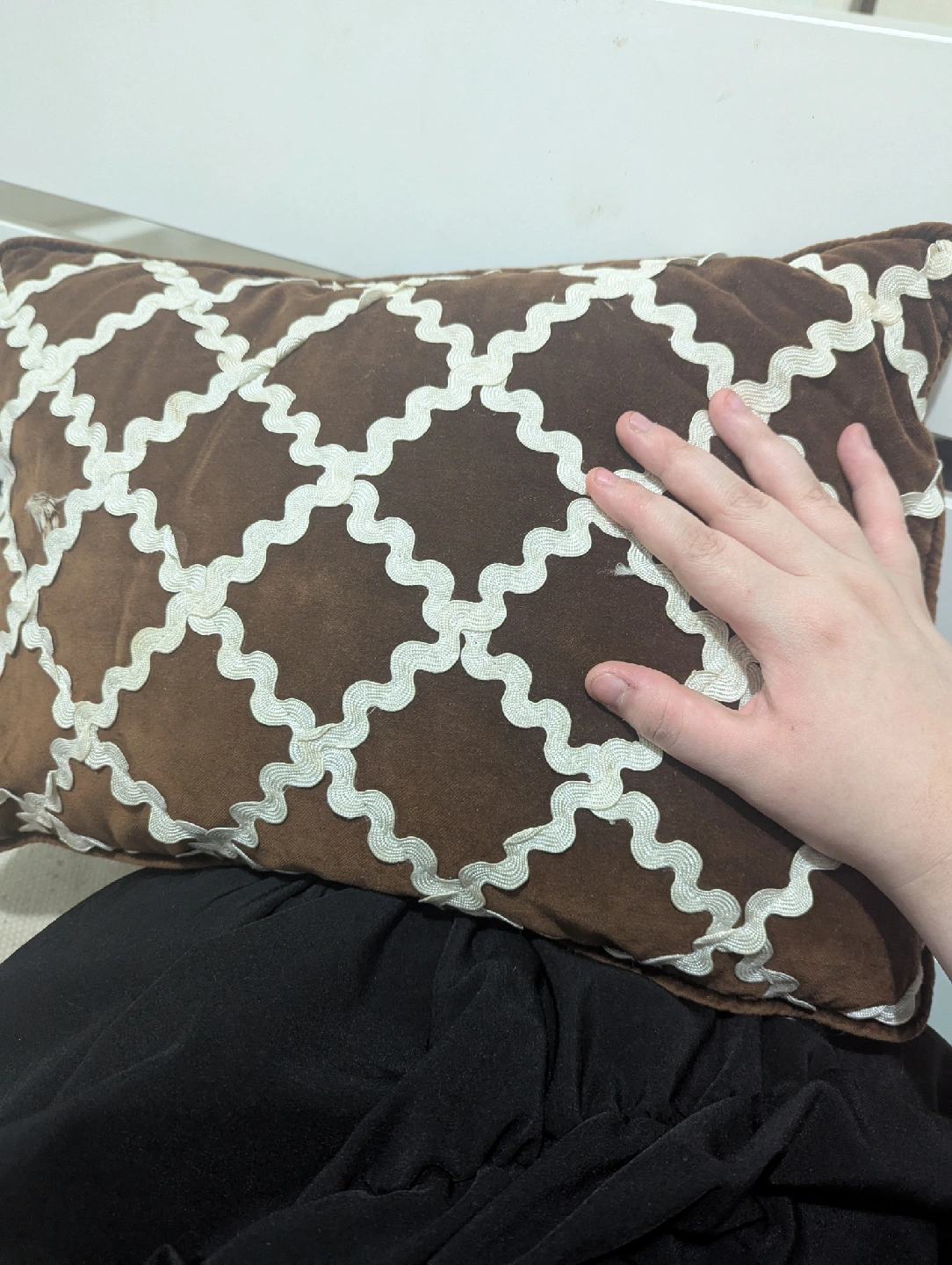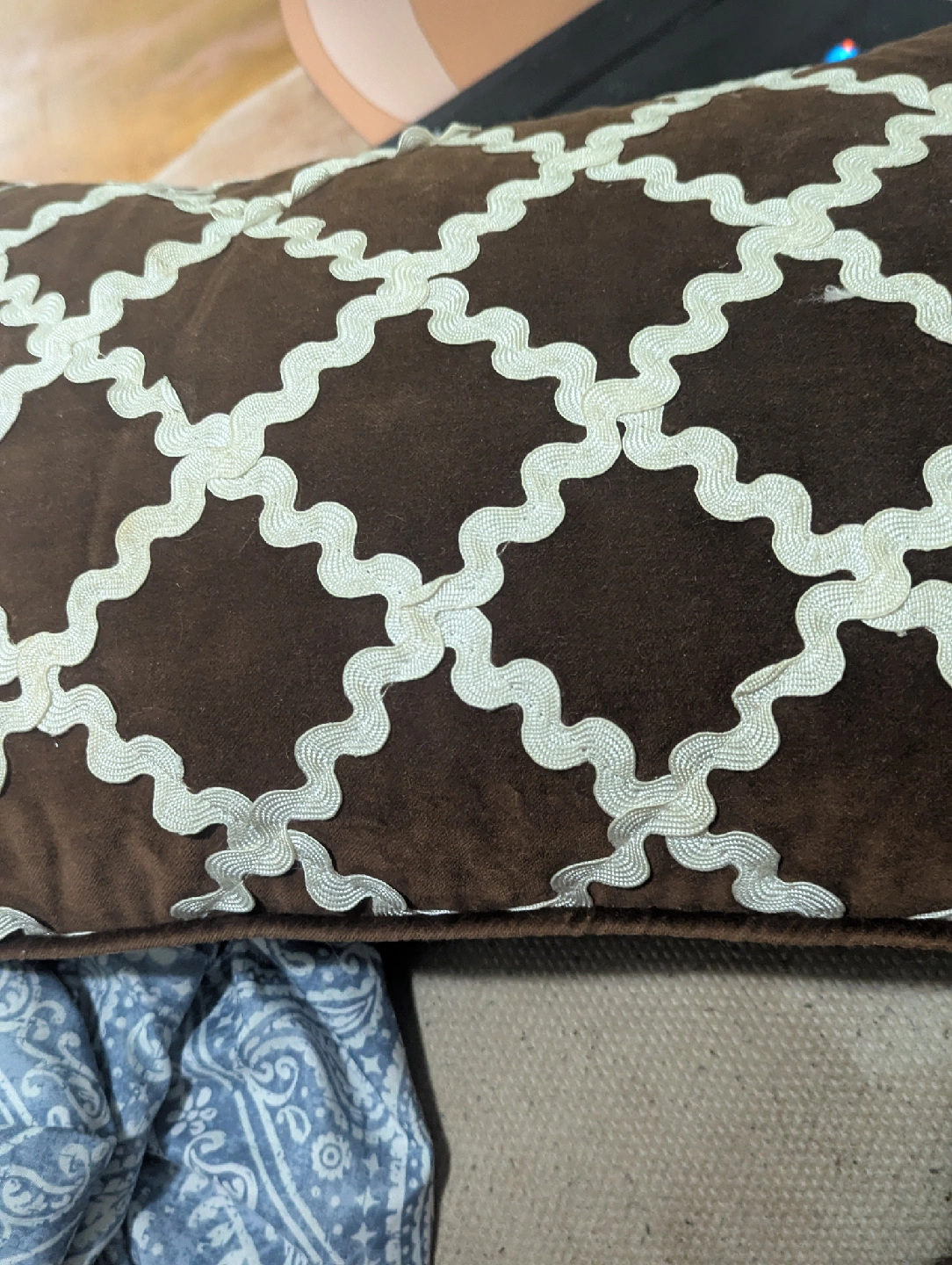10A decorative pillow with a brown and white ribbon pattern. It would look great on a couch or bed!