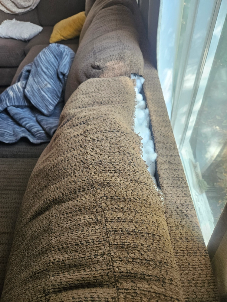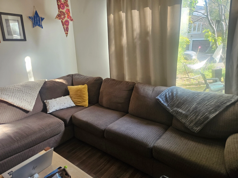 Selling a comfortable brown fabric sectional sofa. It has some wear and tear but fixable, great for a rec room or extra area. Not available for pick up until middle to end of October as we are moving into smaller space.