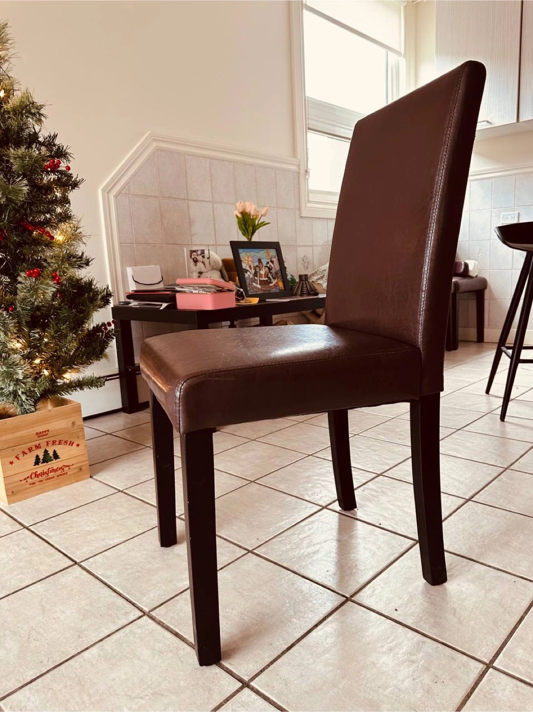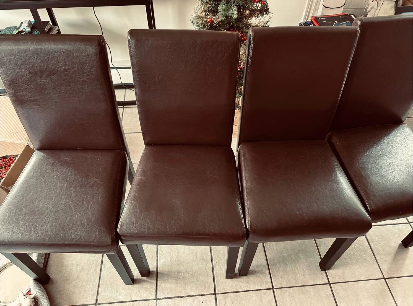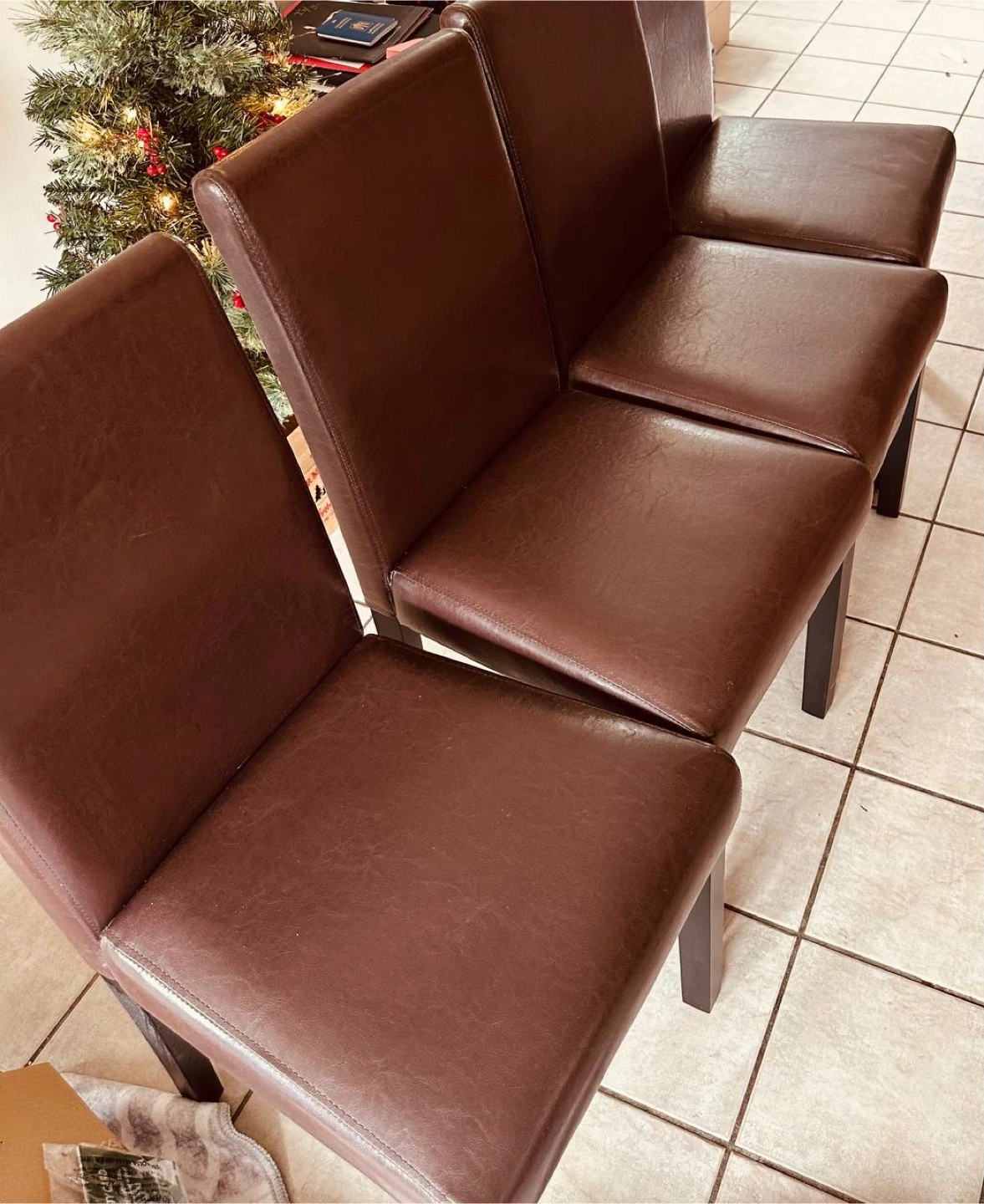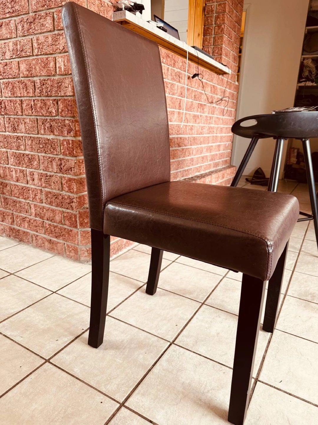 Selling a set of four dining chairs! They're a dark brown colour with faux leather upholstery and dark wooden legs. They're in great shape and would look great in any dining room. Barely used them