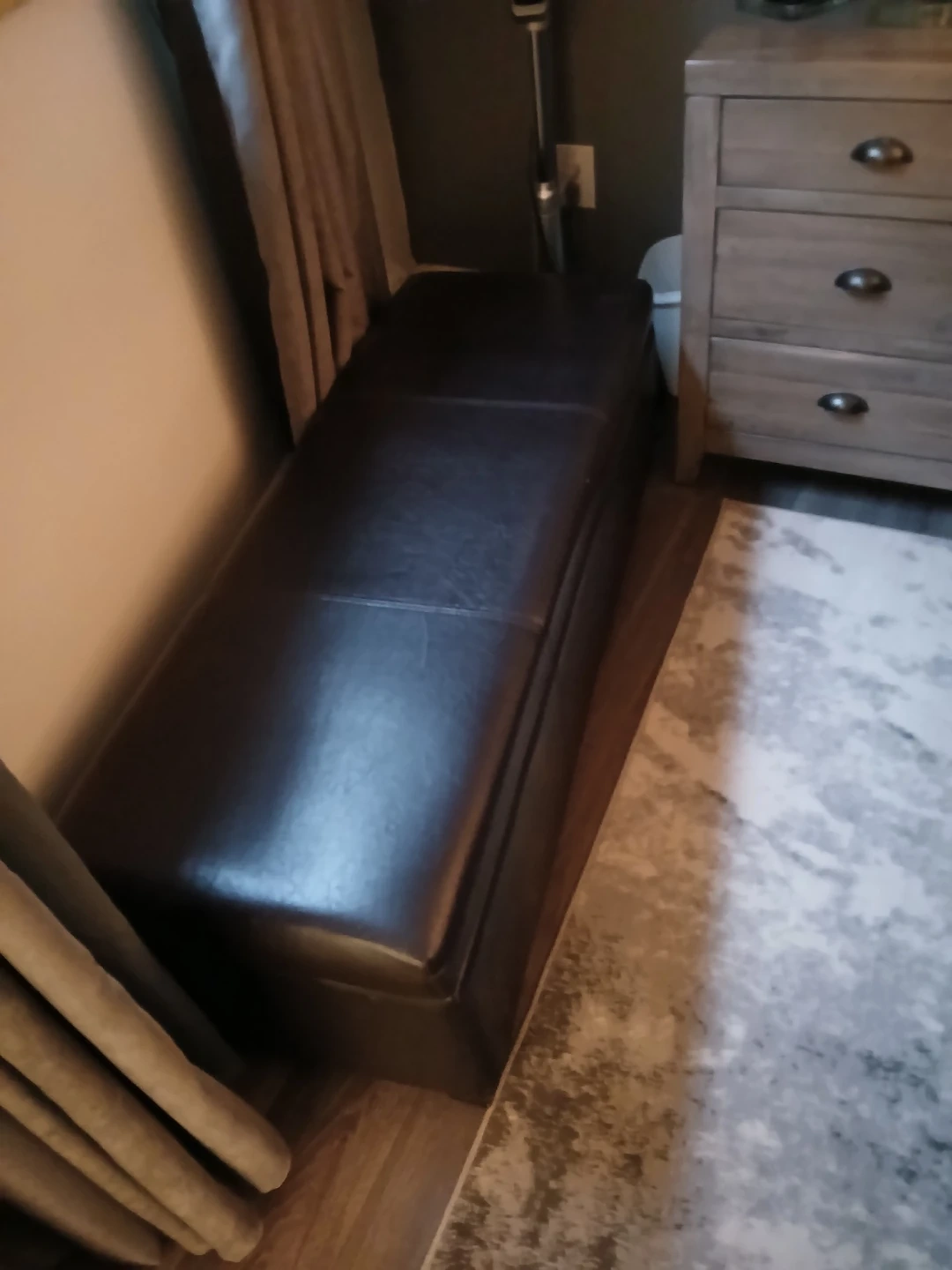 23Here's a brown faux leather ottoman bench. It's in good condition and would be perfect for extra seating or storage. This bench could work well in an entryway, living room, or bedroom