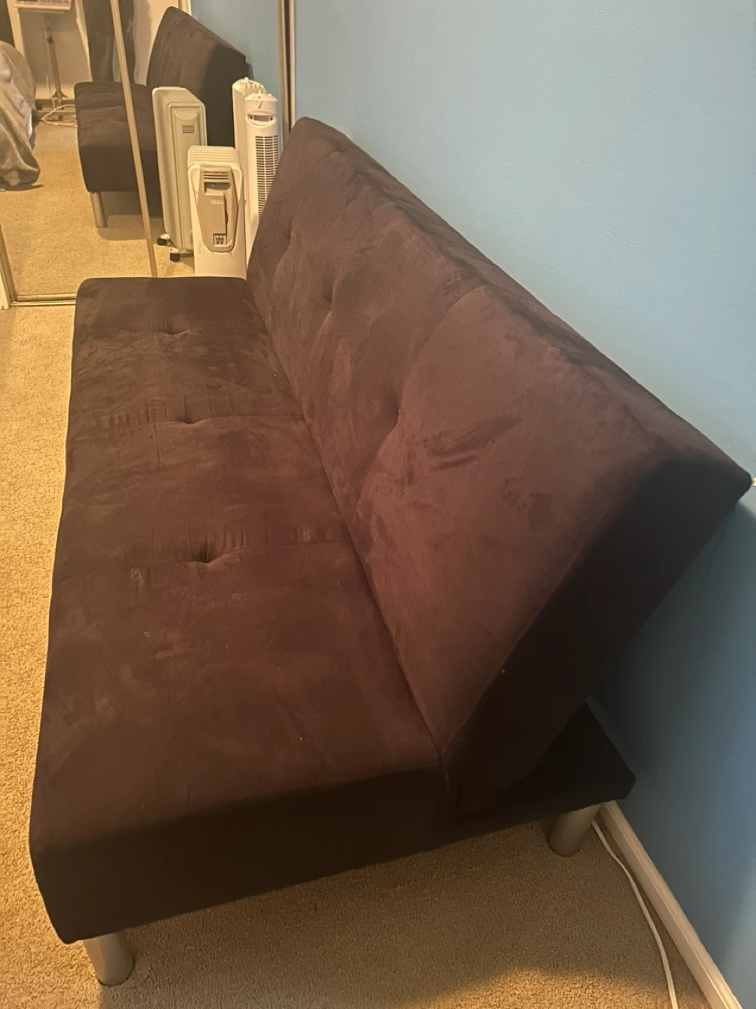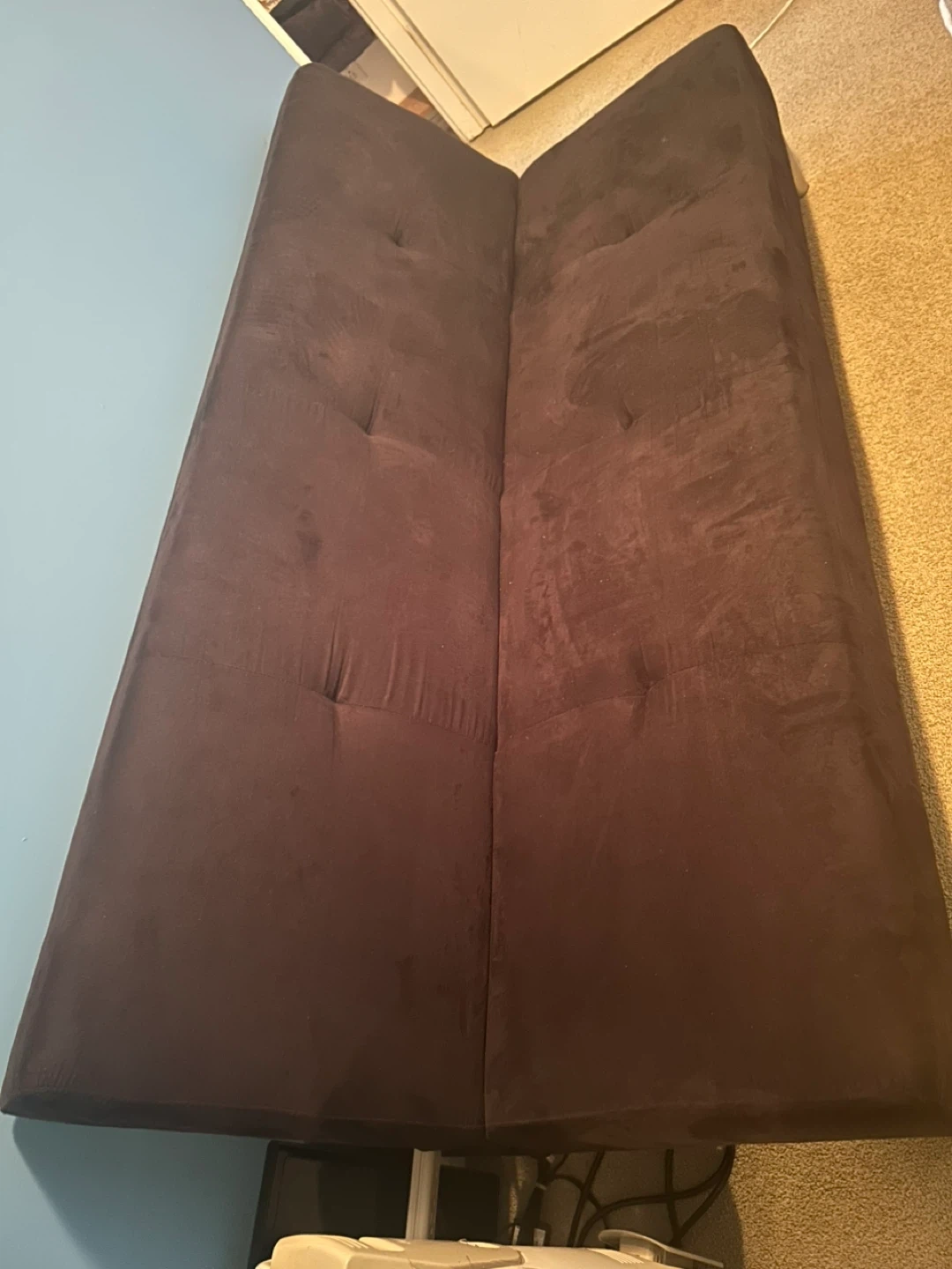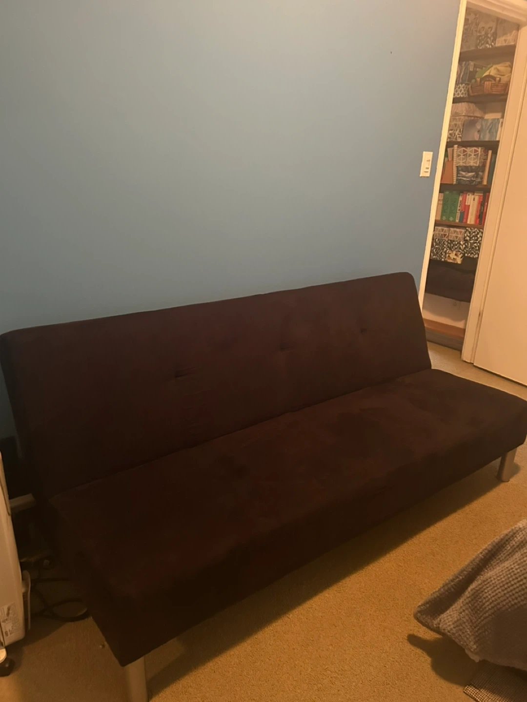 72Selling a comfy brown futon sofa bed! It's in great shape and perfect for a living room or spare room. It easily converts from a sofa to a bed, which is great for guests or extra sleeping space, folded out width is 45in.