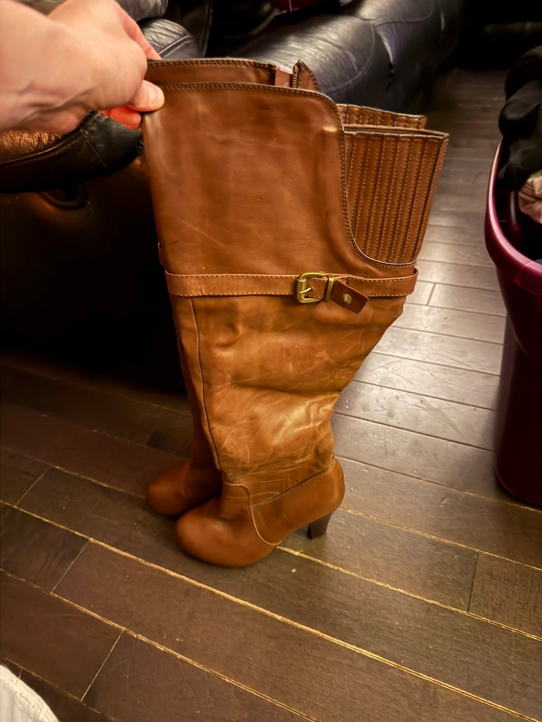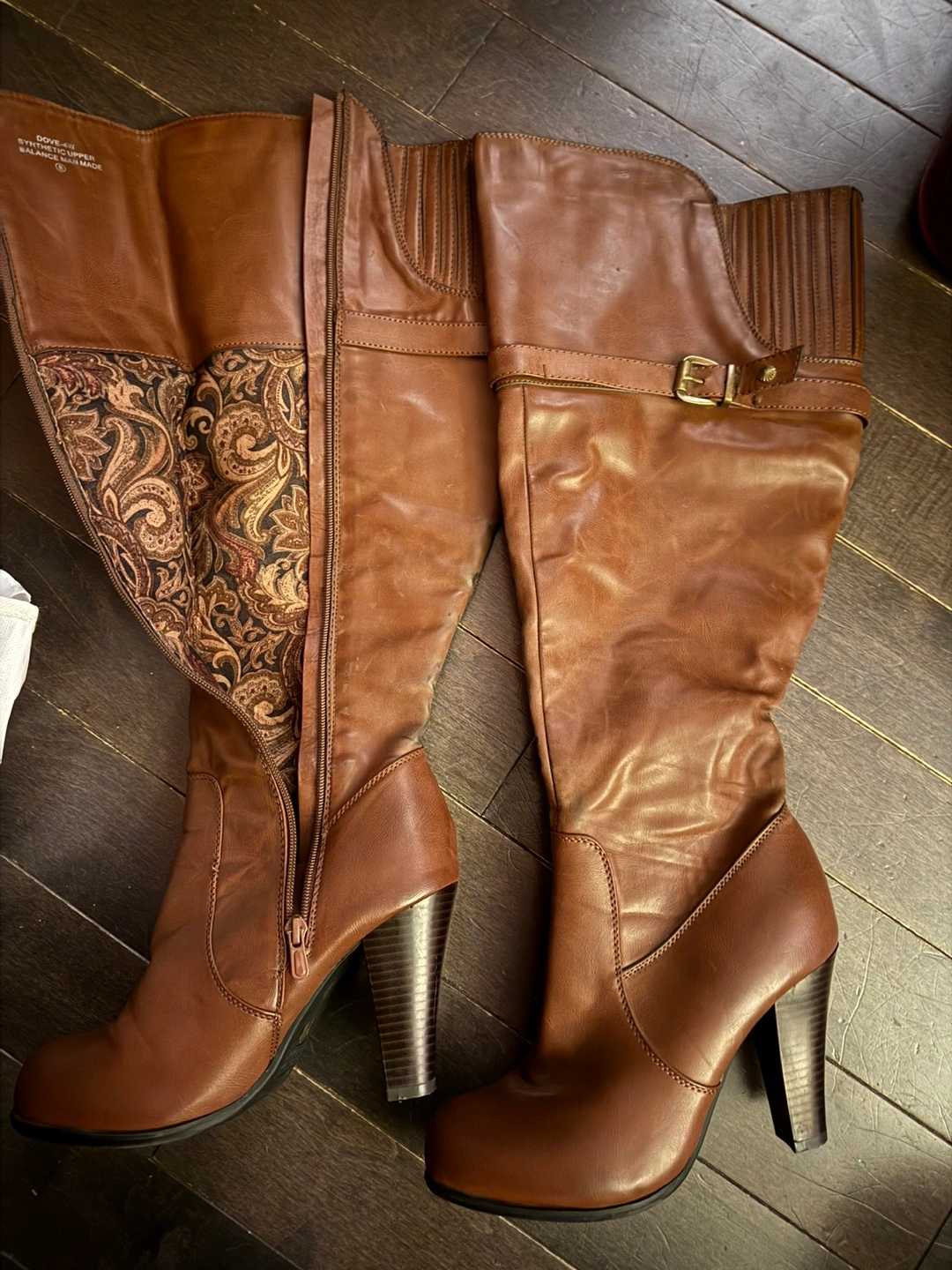 Here are a pair of knee-high brown boots! They have a heel and a buckle detail. The inside has a nice paisley pattern. They are in good condition!