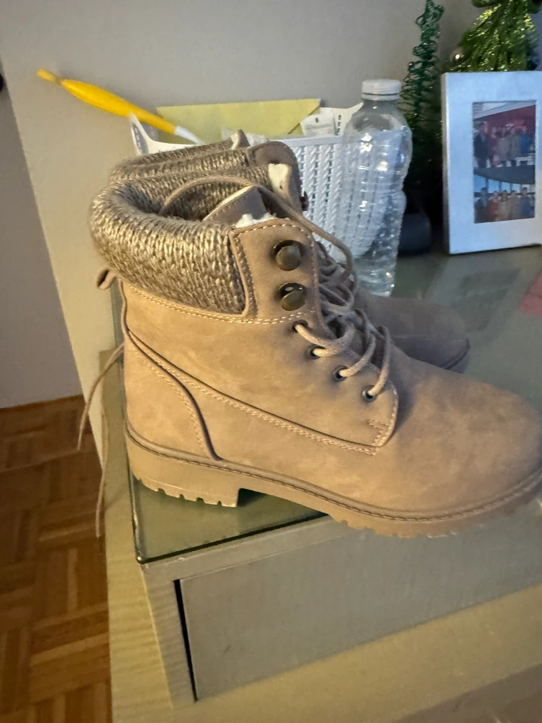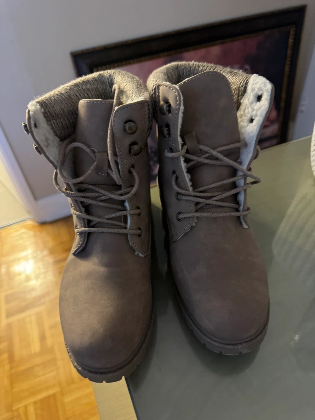 134These are a pair of brown lace-up ankle boots. They have a knit collar and a faux-fur lining. They appear to be in good condition and ready for a new home