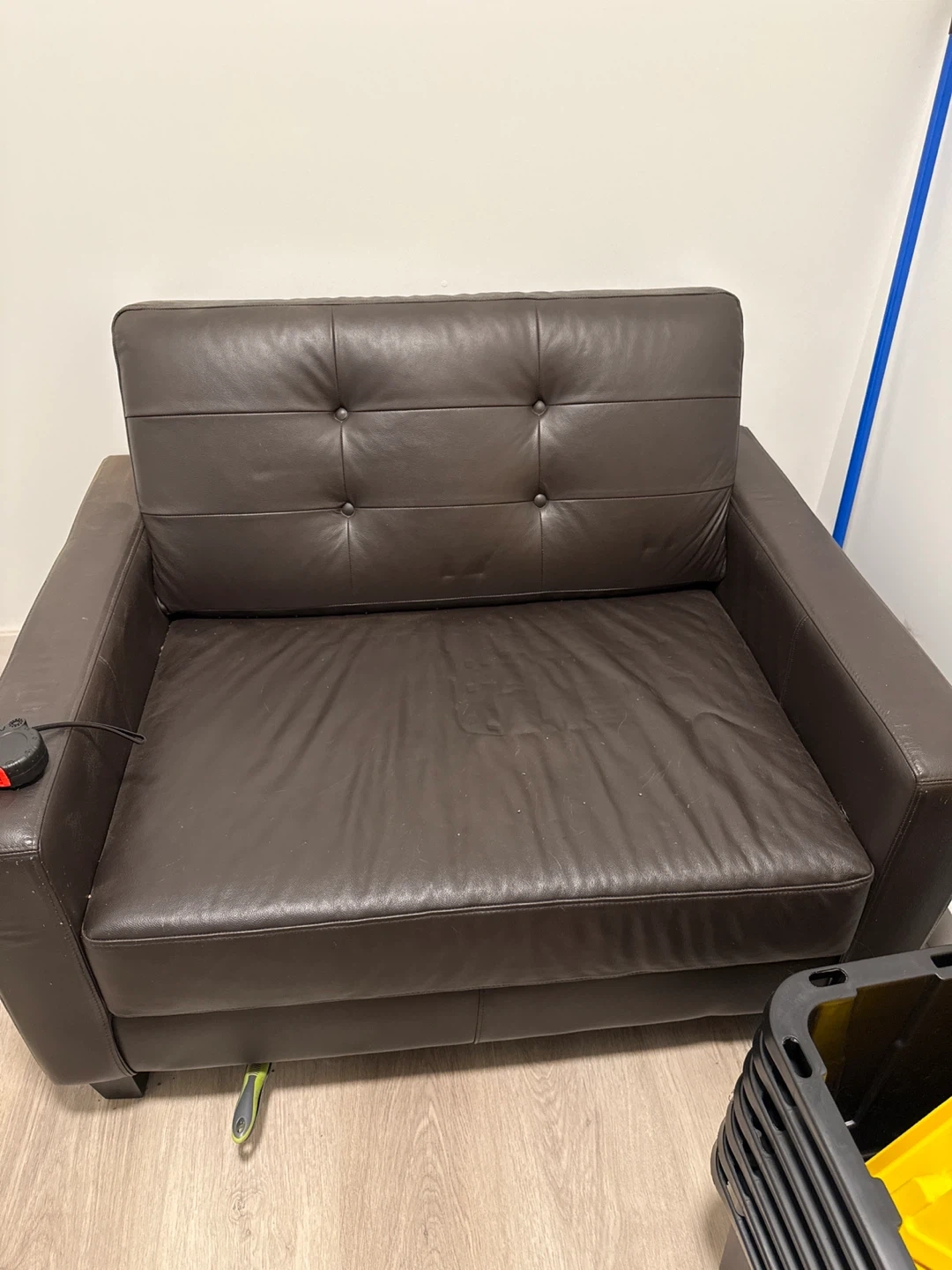 Selling a comfy brown leather armchair. It is a one plus, so little wider than just for one. It's in great condition and the leather has a nice, soft feel. Moving into very small condo and this just will not fit. 45” x 34” x 36” in height.