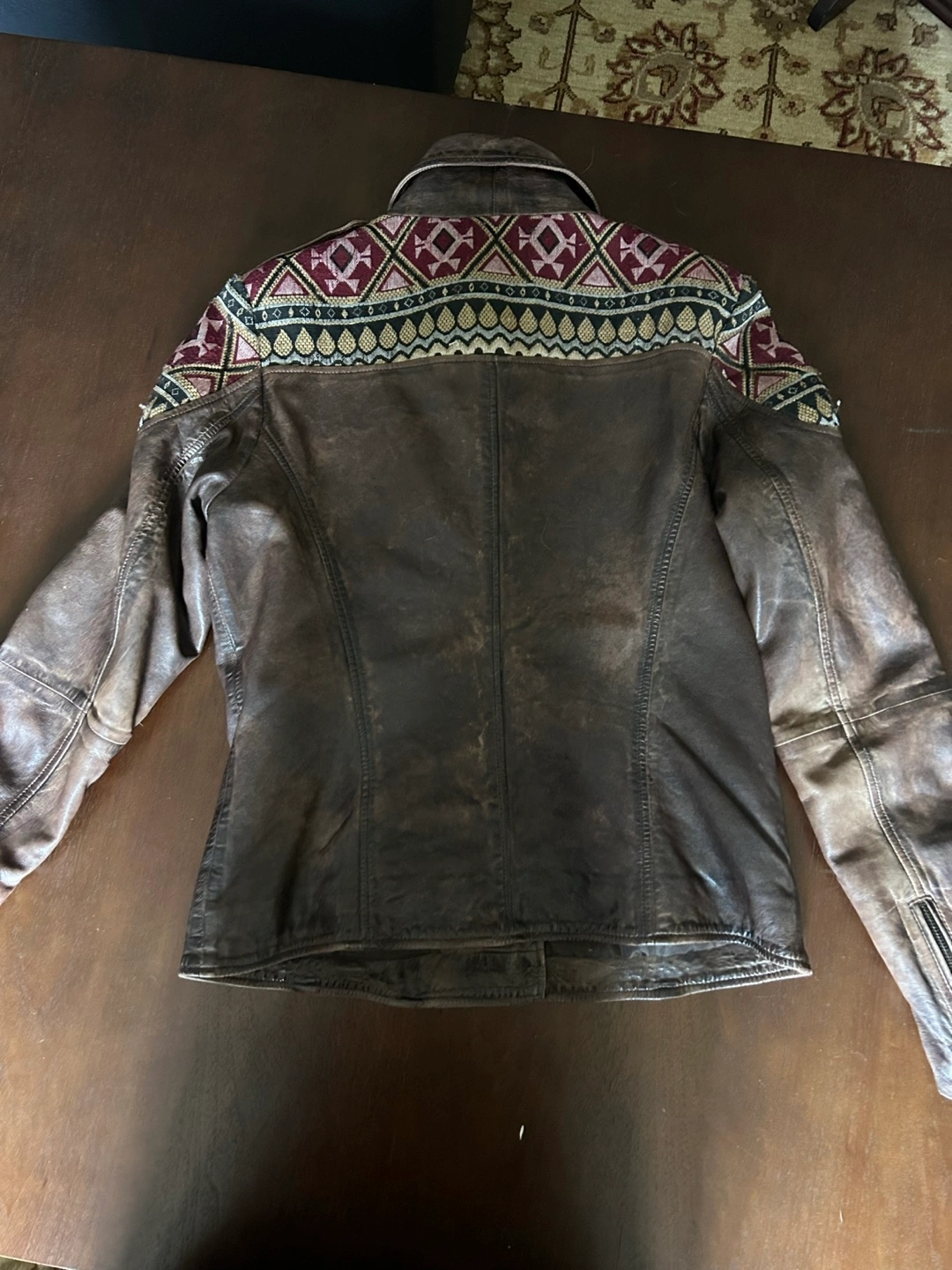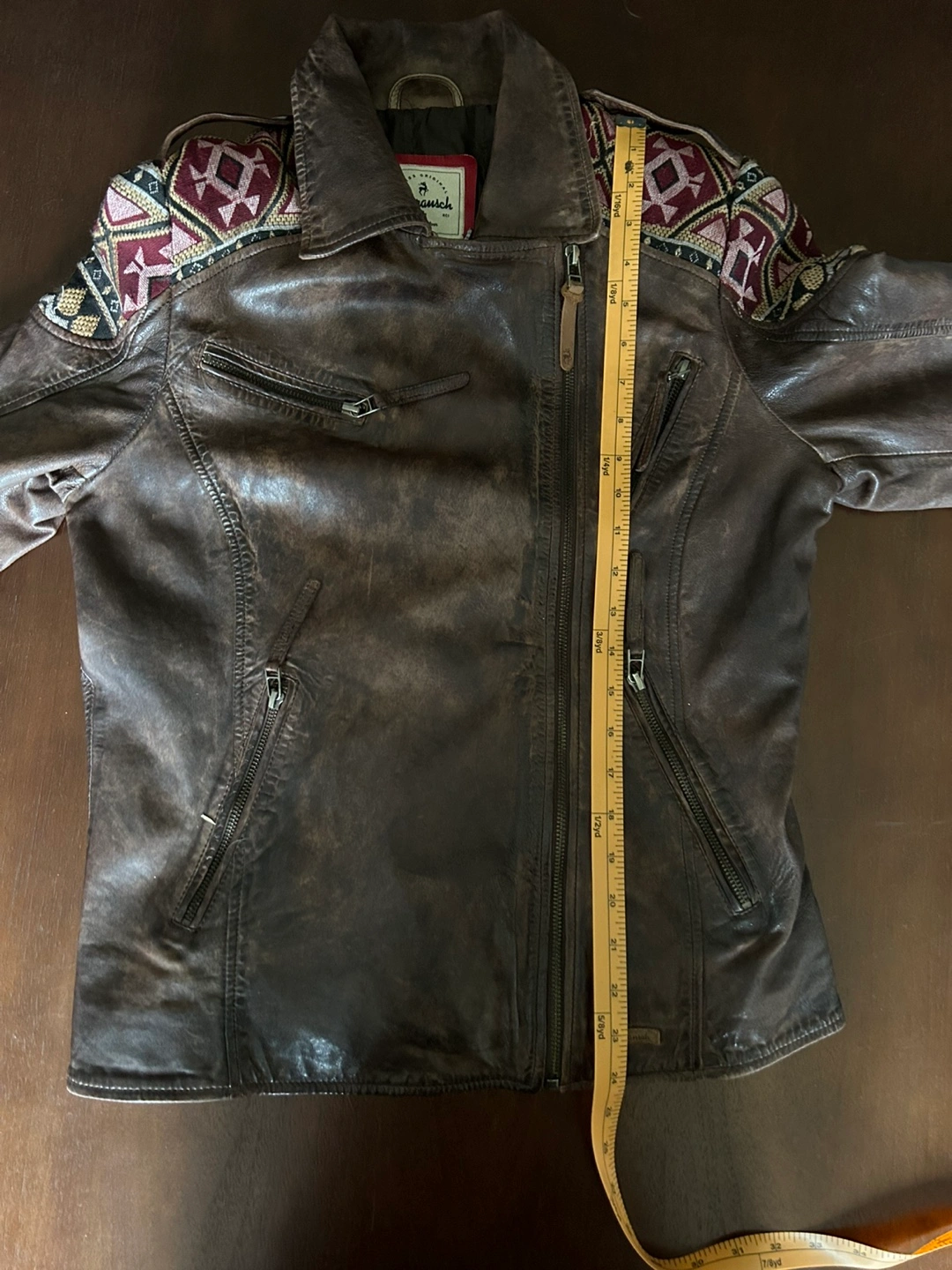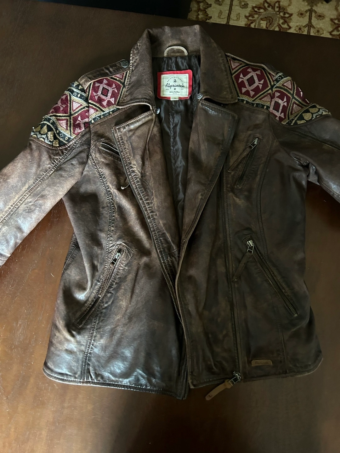 Women's brown leather jacket. Features embroidered detailing on shoulders and back. Zipper closure. Multiple pockets. Good condition.bought from Sport Life for $340.