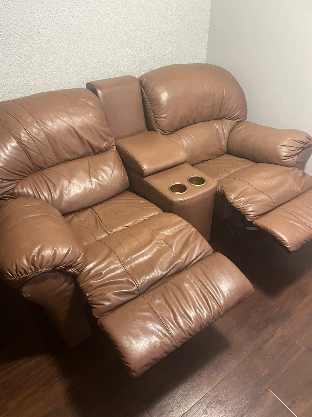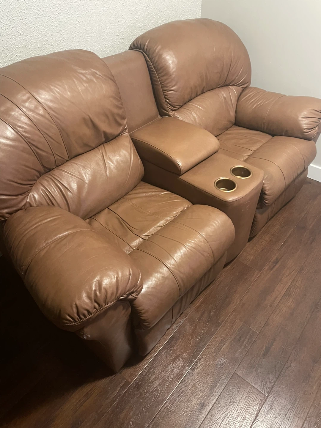 10Cozy up with this comfy brown leather loveseat recliner! It features a convenient centre console with cupholders, perfect for movie nights or relaxing with a friend. The recliner function works great, and the leather is in good condition. It's a great addition to any living room or entertainment space This is a zero clearance model so can sit almost right against the wall.