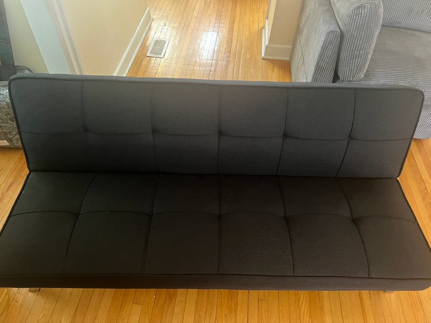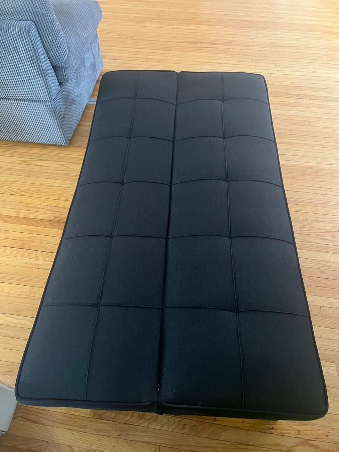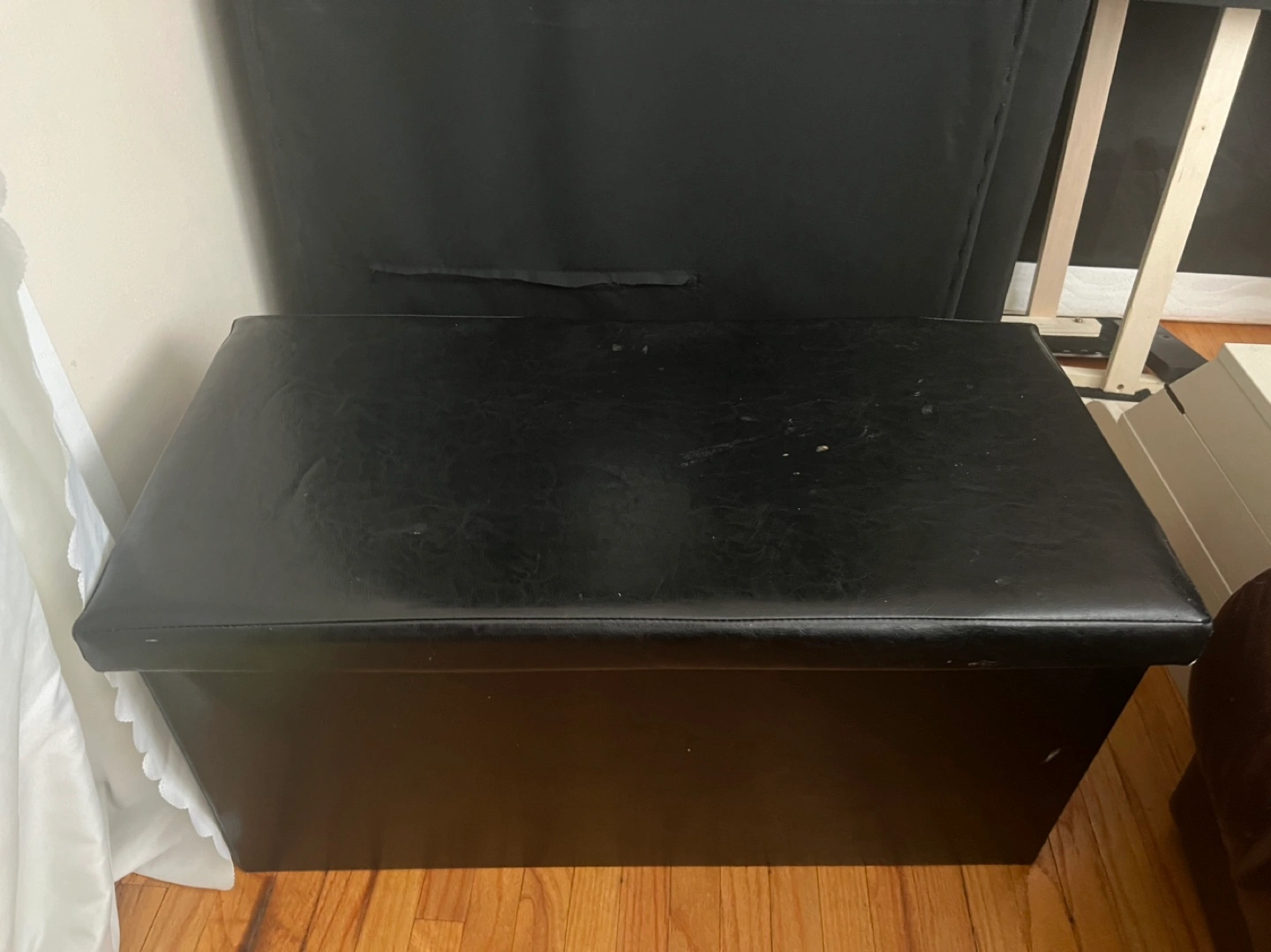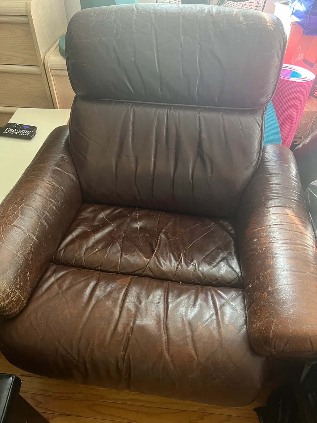 20Well-loved brown leather recliner shows wear. Black fabric storage ottoman. Black futon couch converts to bed. Pick up only. Items sold together. Can be purchased separately.