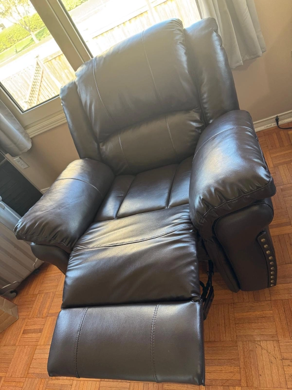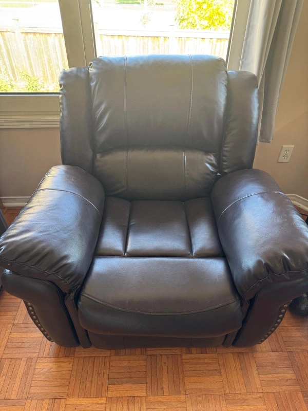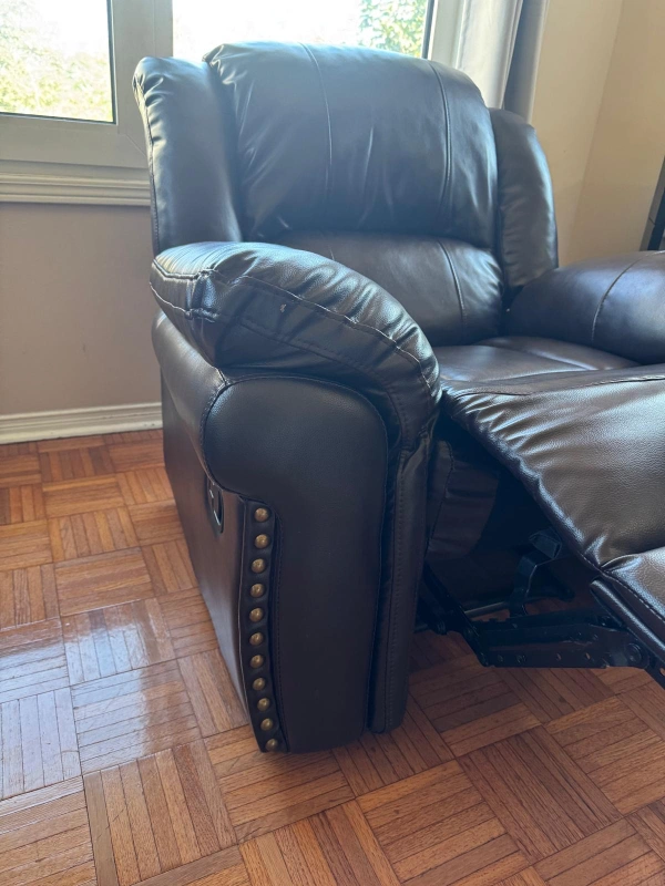 Selling a comfy brown leather recliner. It's in great shape and perfect for relaxing after a long day. It has a classic design with studded detailing on the arms. It's a great addition to any living room or den!