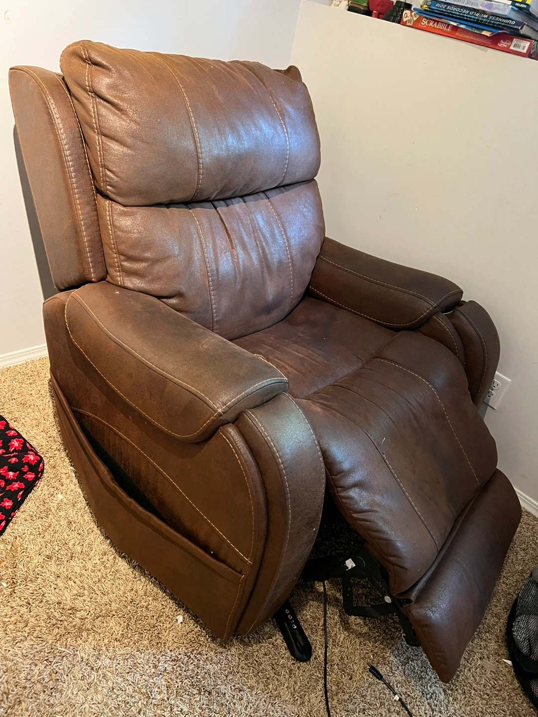 10Selling a comfy brown leather recliner chair. The chair has a side pocket for storing magazines or the remote. It shows some signs of use but is still in good condition. Everything works well.