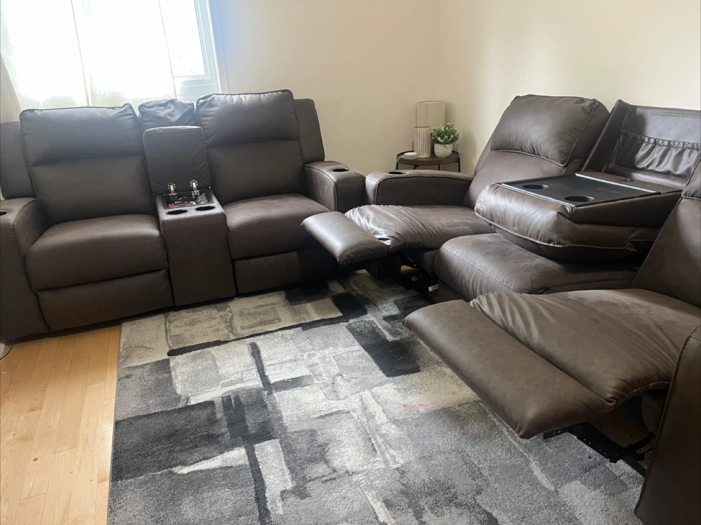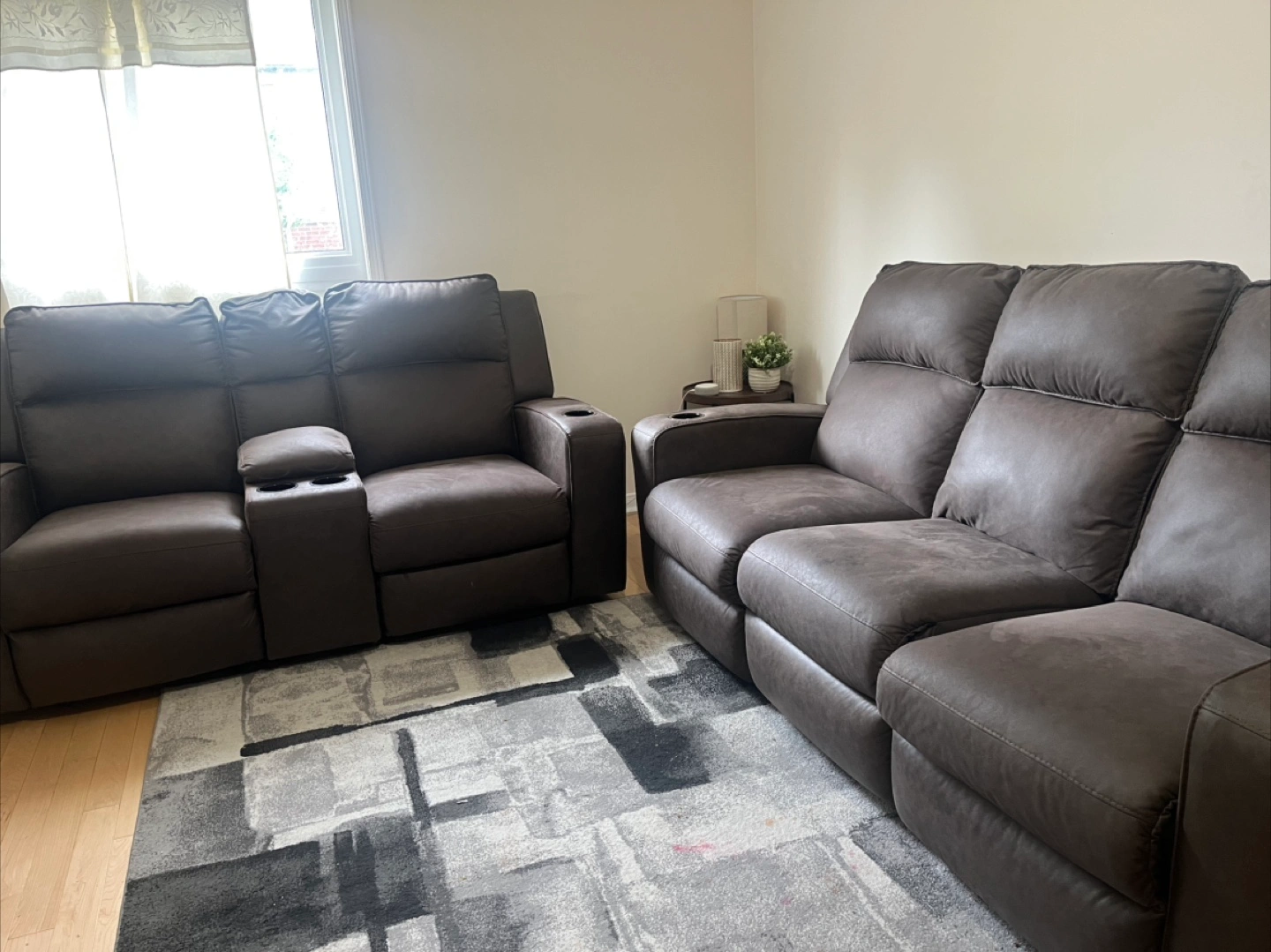 Selling a comfy brown leather reclining sofa set! It's in great condition and ready for a new home. Perfect for movie nights or just relaxing after a long day. It features built-in cup holders for added convenience