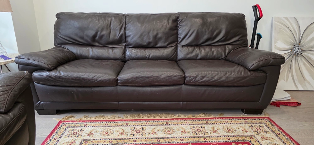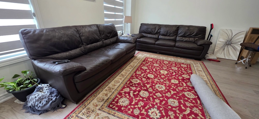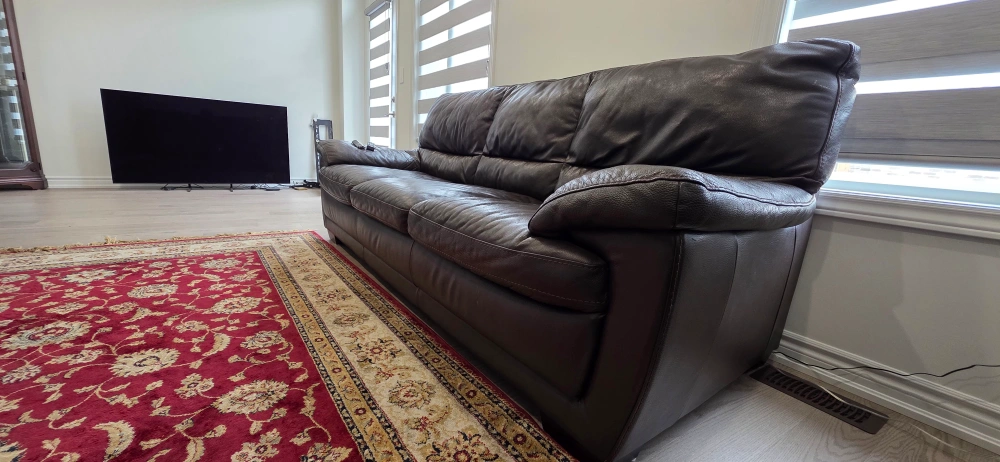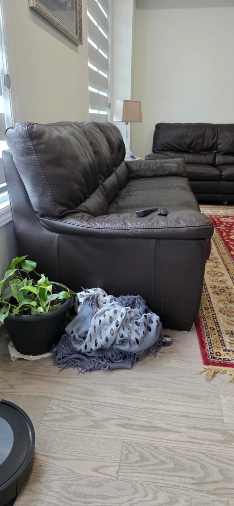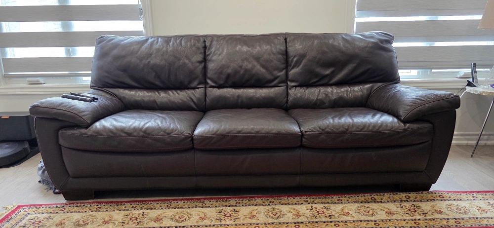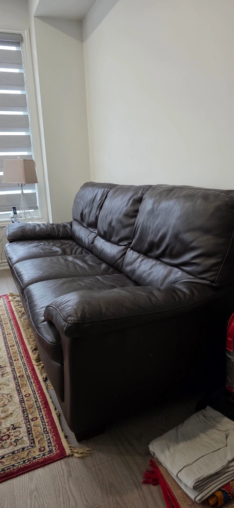 Selling a gently used brown leather sofa set. It has a classic design and is in good condition. Perfect for a living room or family room! Very sturdy Dark brown genuine leather sofas/couch both in set. Big size sits 8 people. Perfect for living room family room arrangements. These sofas are bought 3 years back from Ashley. Don't have receipt else still has warranty for sure. Since cannot find receipt I have lowered the price to $749 for each selling for over $1000. Measurements : Both Sofas are same size set as below. 90" Length 36" Depth 36" Height