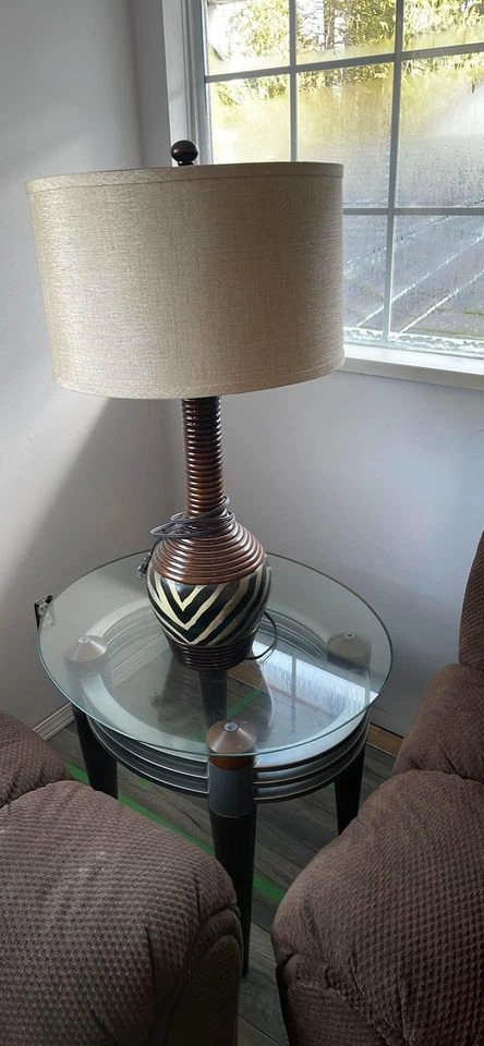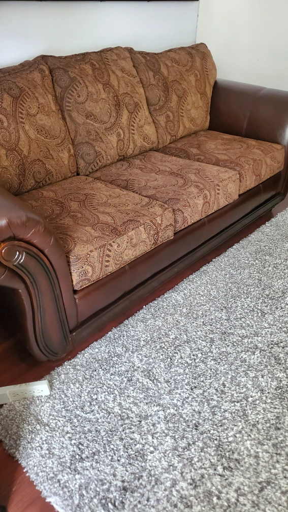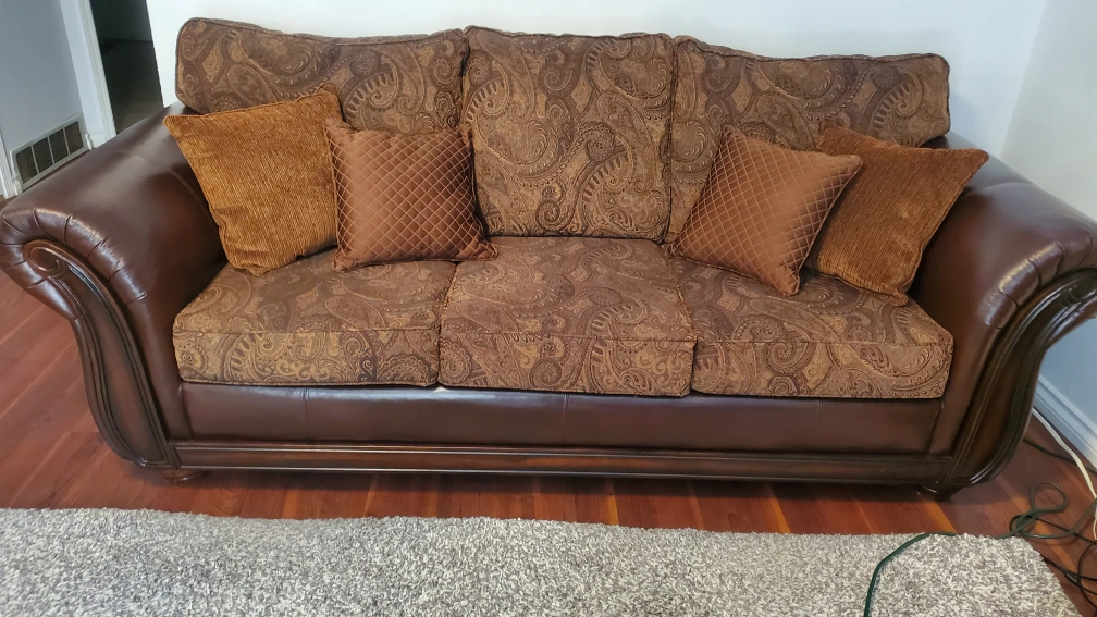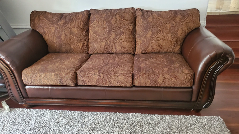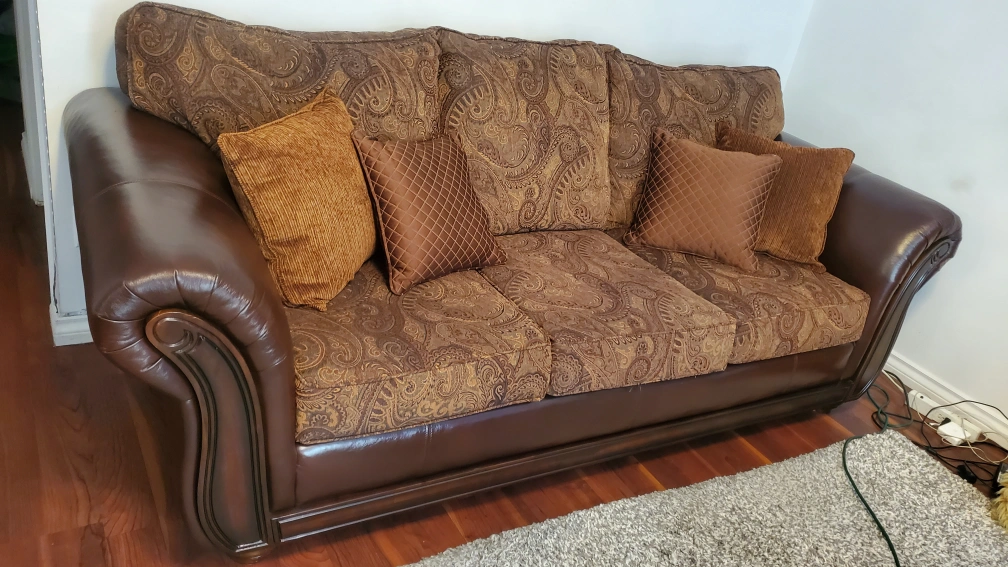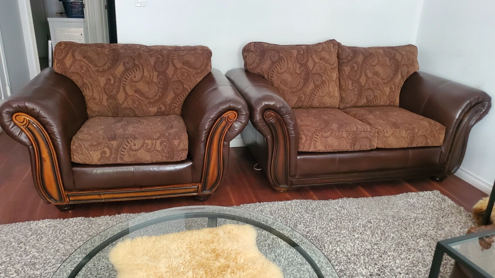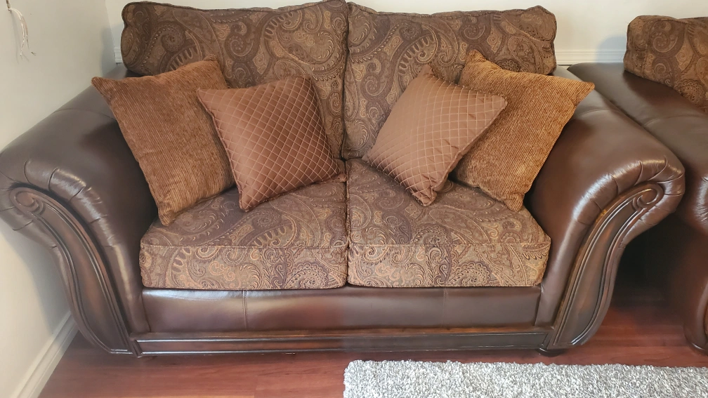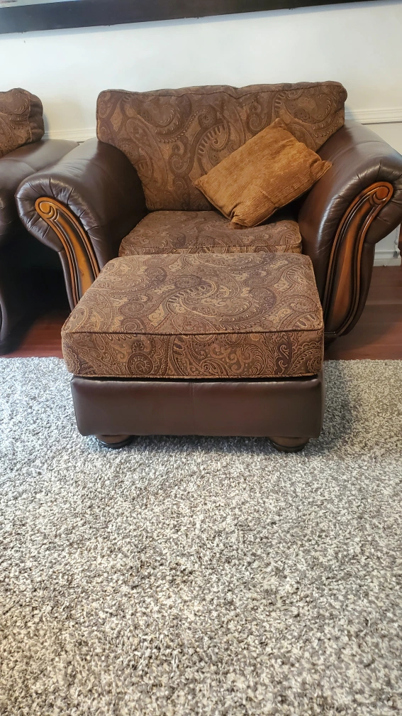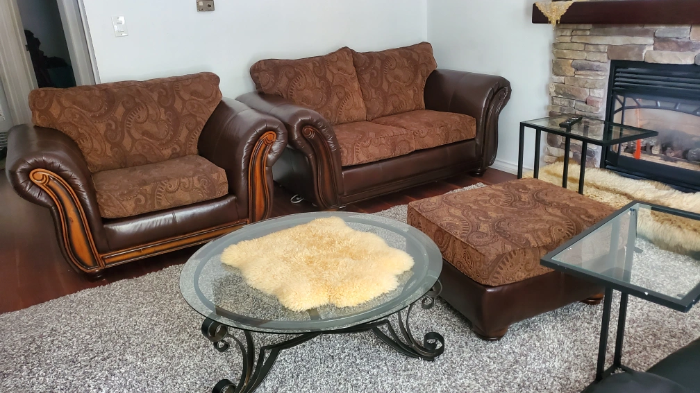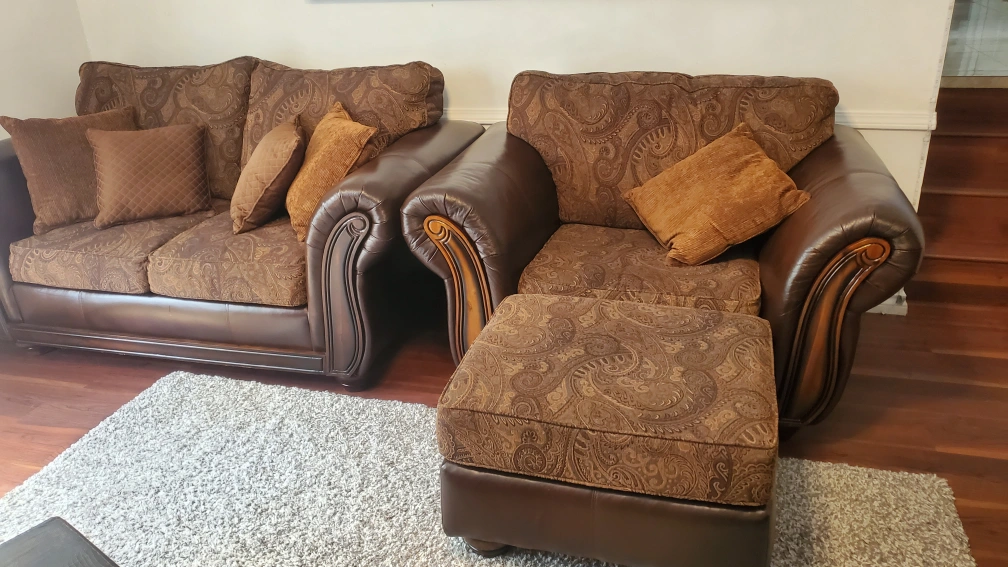 7 piece Selling a comfy brown leather sofa set, including a three-seater sofa, a two-seater sofa, a chair, and an ottoman. It's in good condition and perfect for a living room or family room. The set features a patterned fabric on the cushions and a dark brown leather trim. 7 pieces Coffee table and 2 lamp including