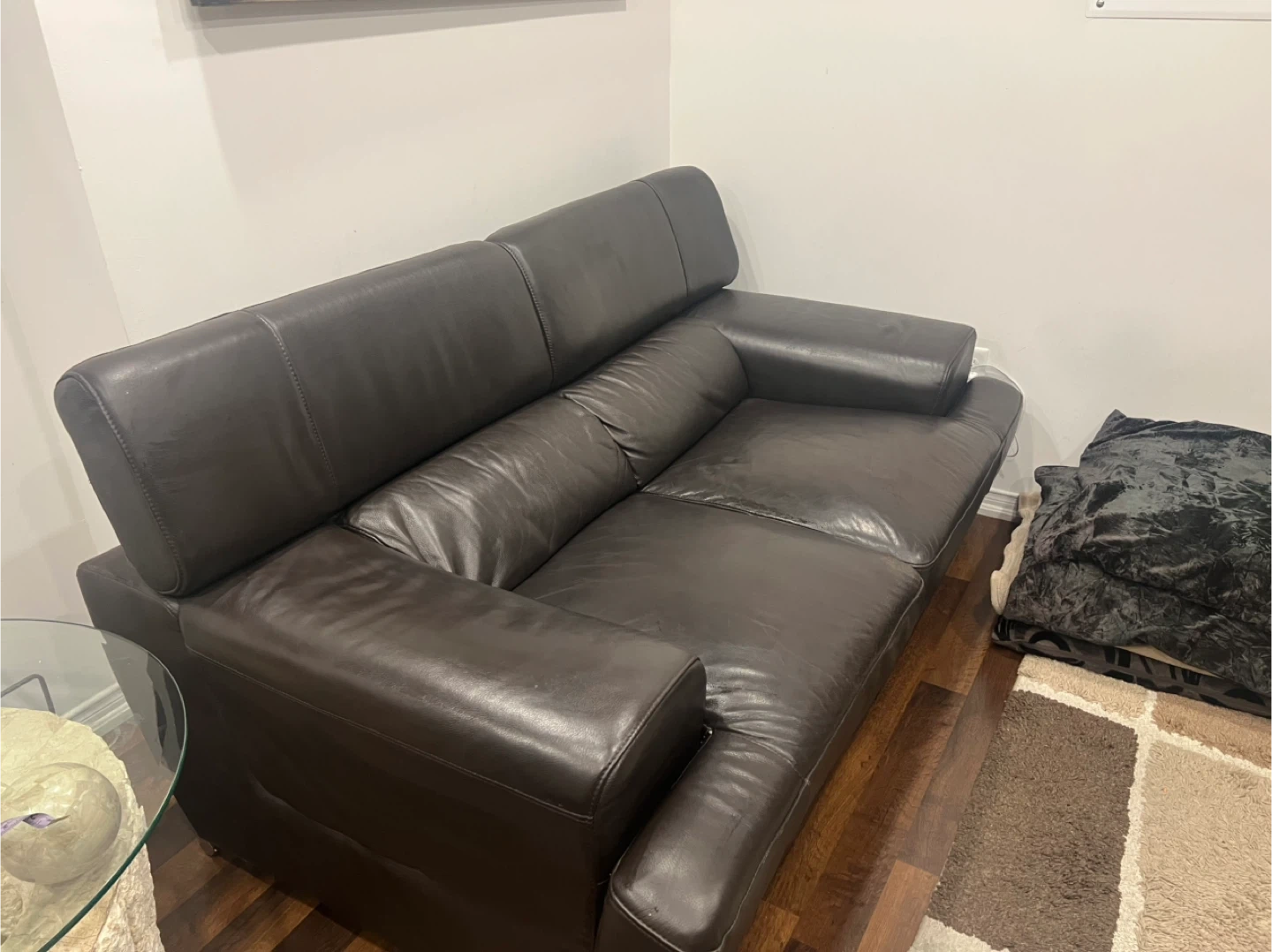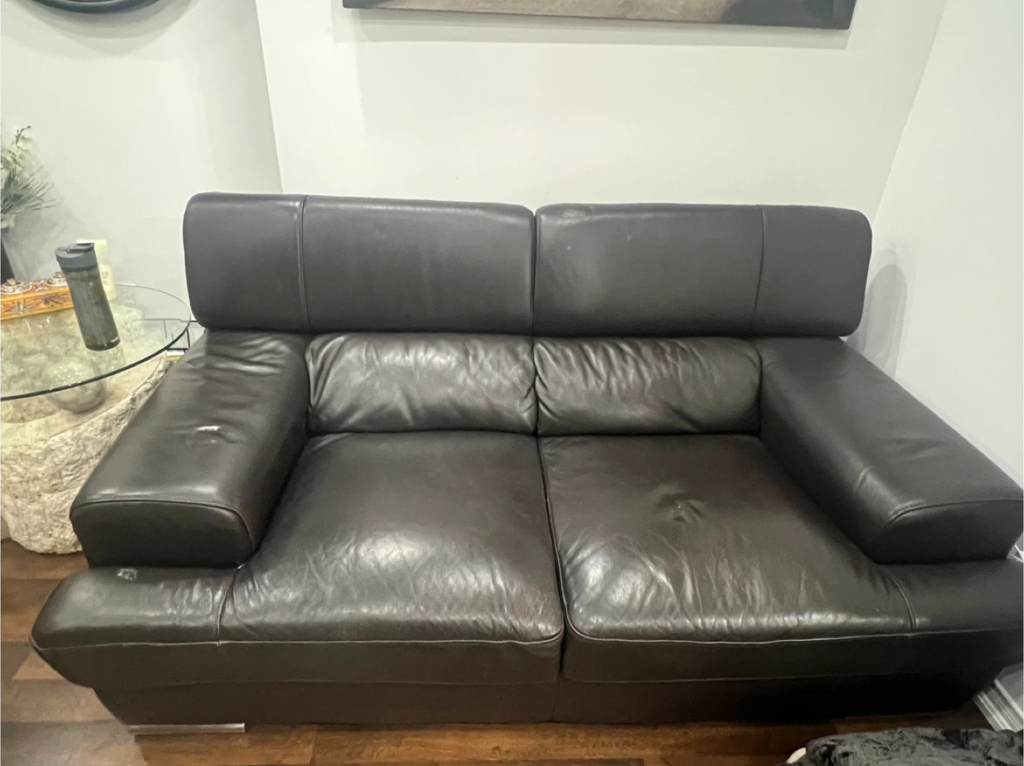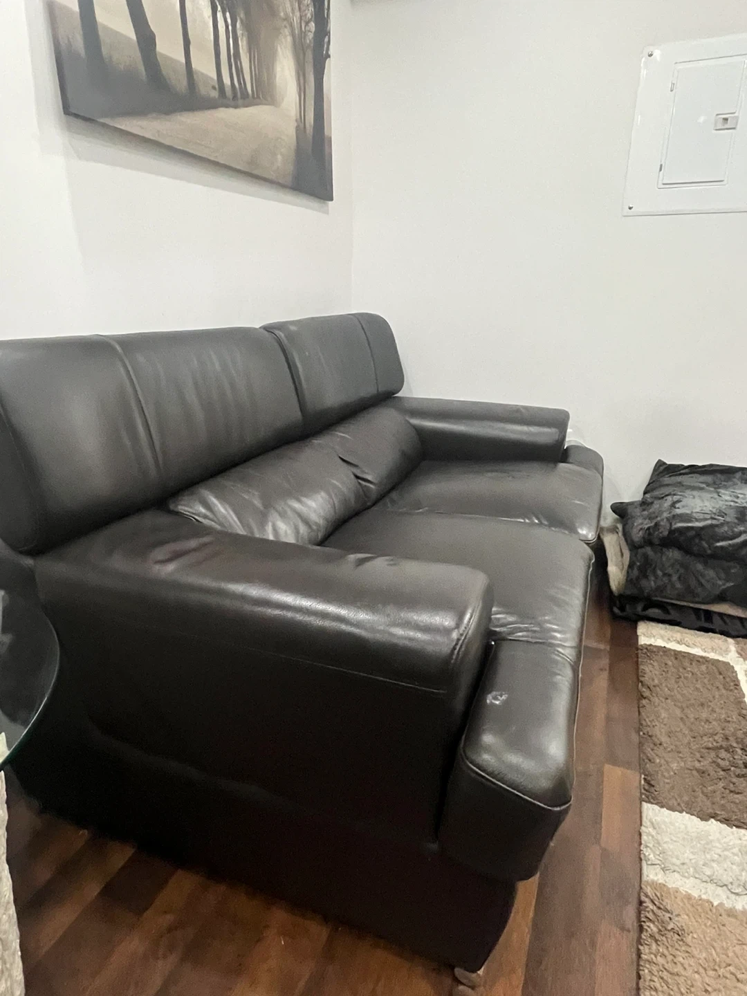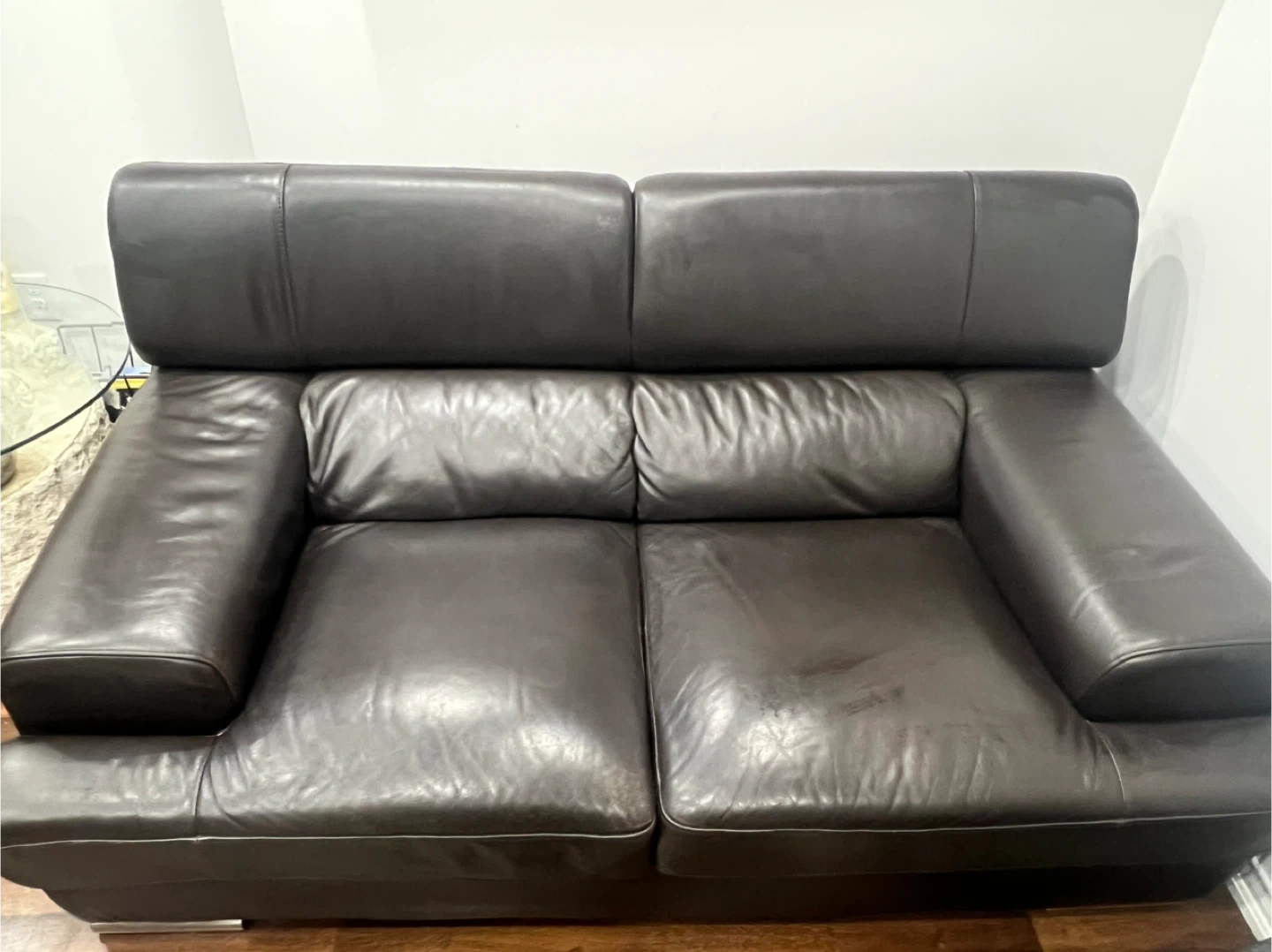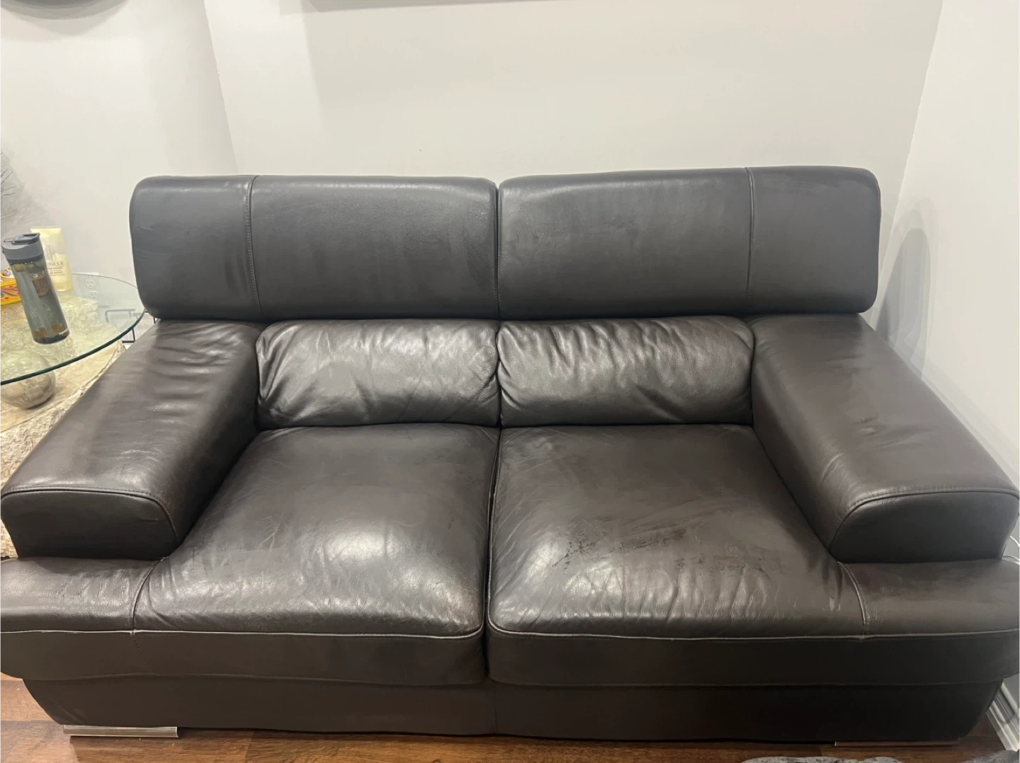 Dining Table with 6 Chairs - Dark Wood & Black Leather