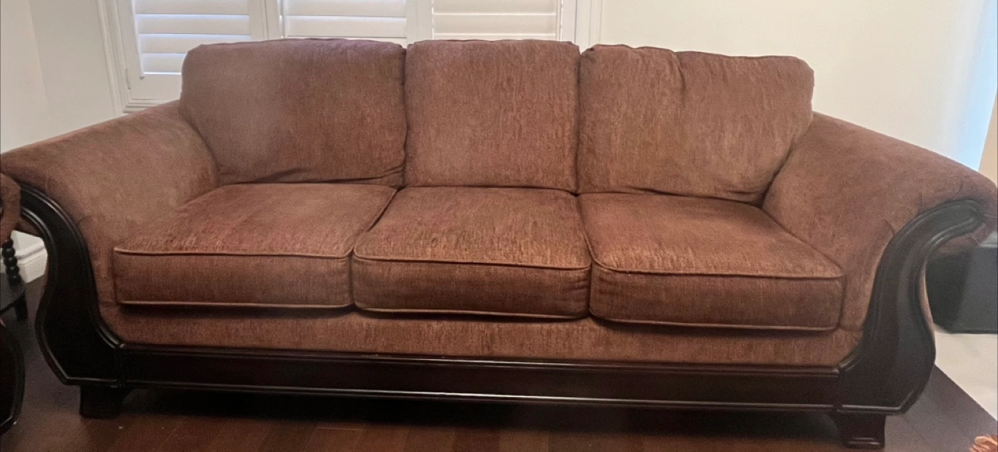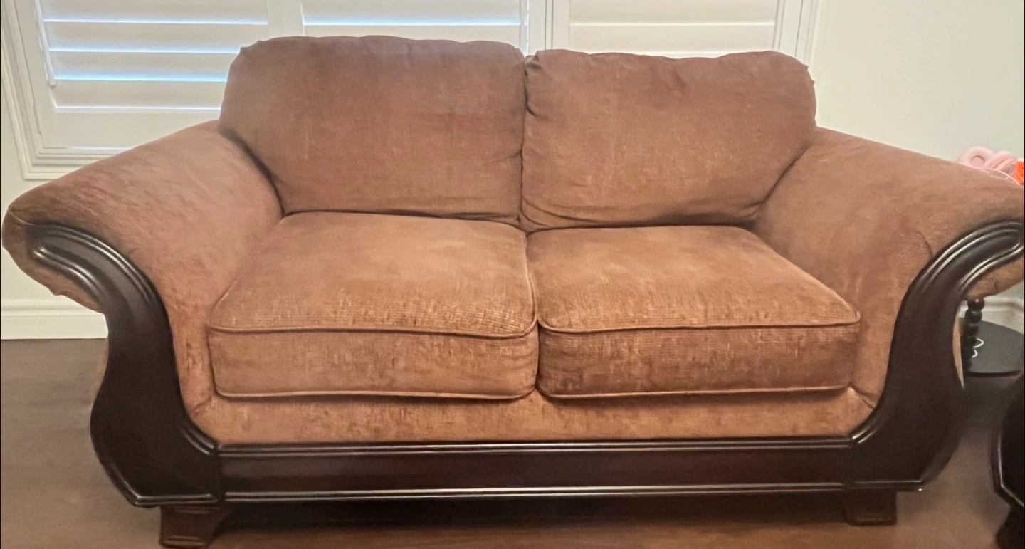10Moving sale…Selling a comfy brown loveseat and sofa set. Both pieces are in good condition and would be perfect for a living room or den. The set features a classic design with dark wood trim. A great way to add seating to your home!