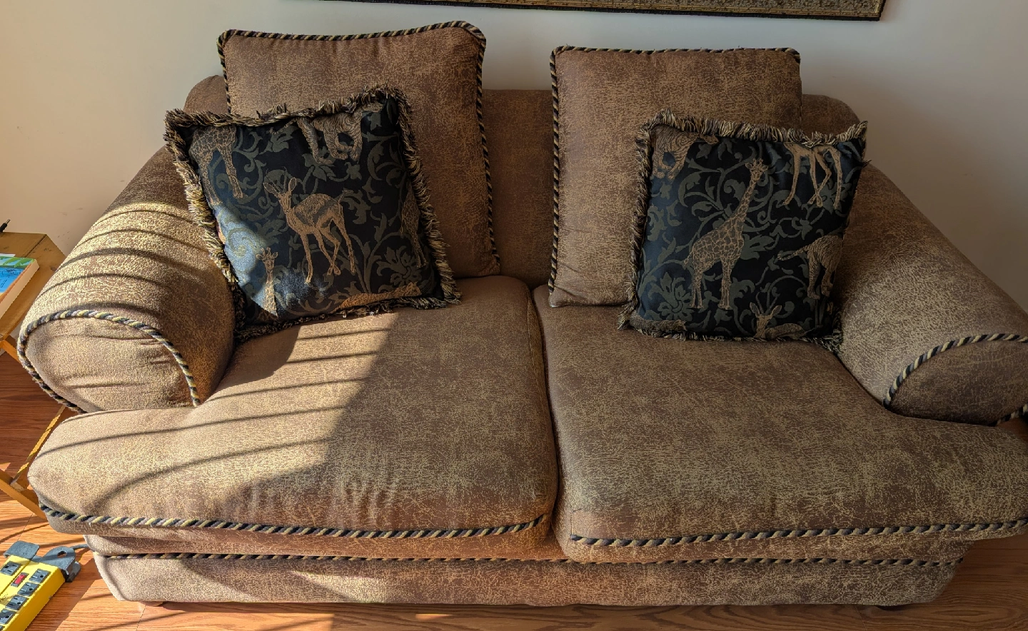 Selling a comfy brown loveseat sofa! It comes with two decorative pillows featuring animal designs. The sofa has a unique textured finish and rope detailing around the edges. Great for a cozy living room or den!