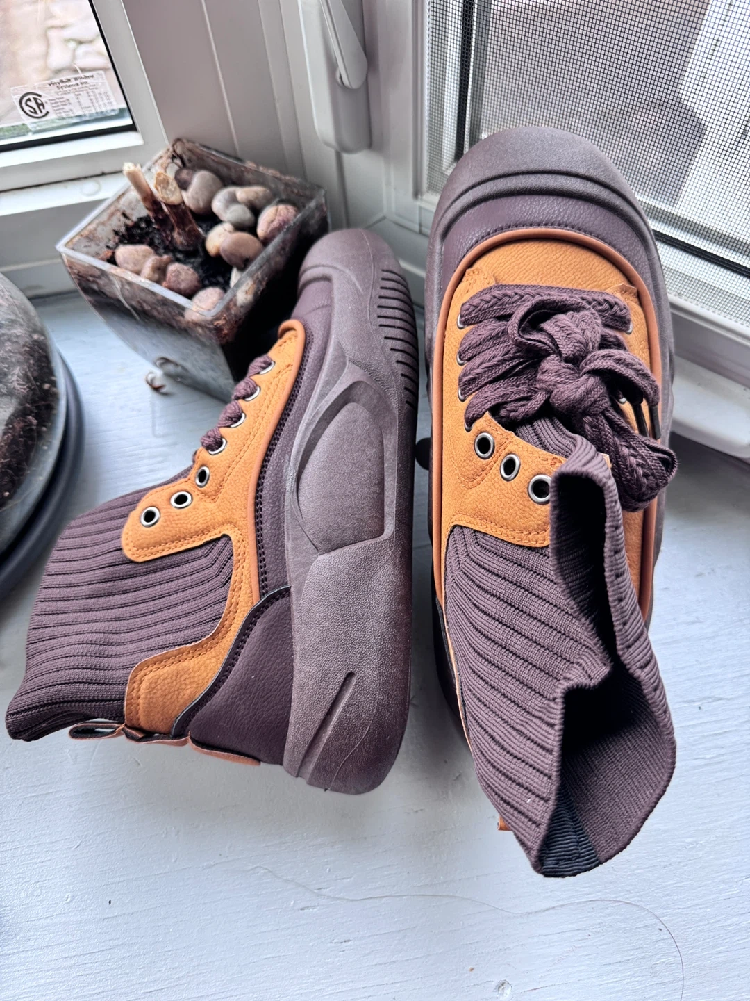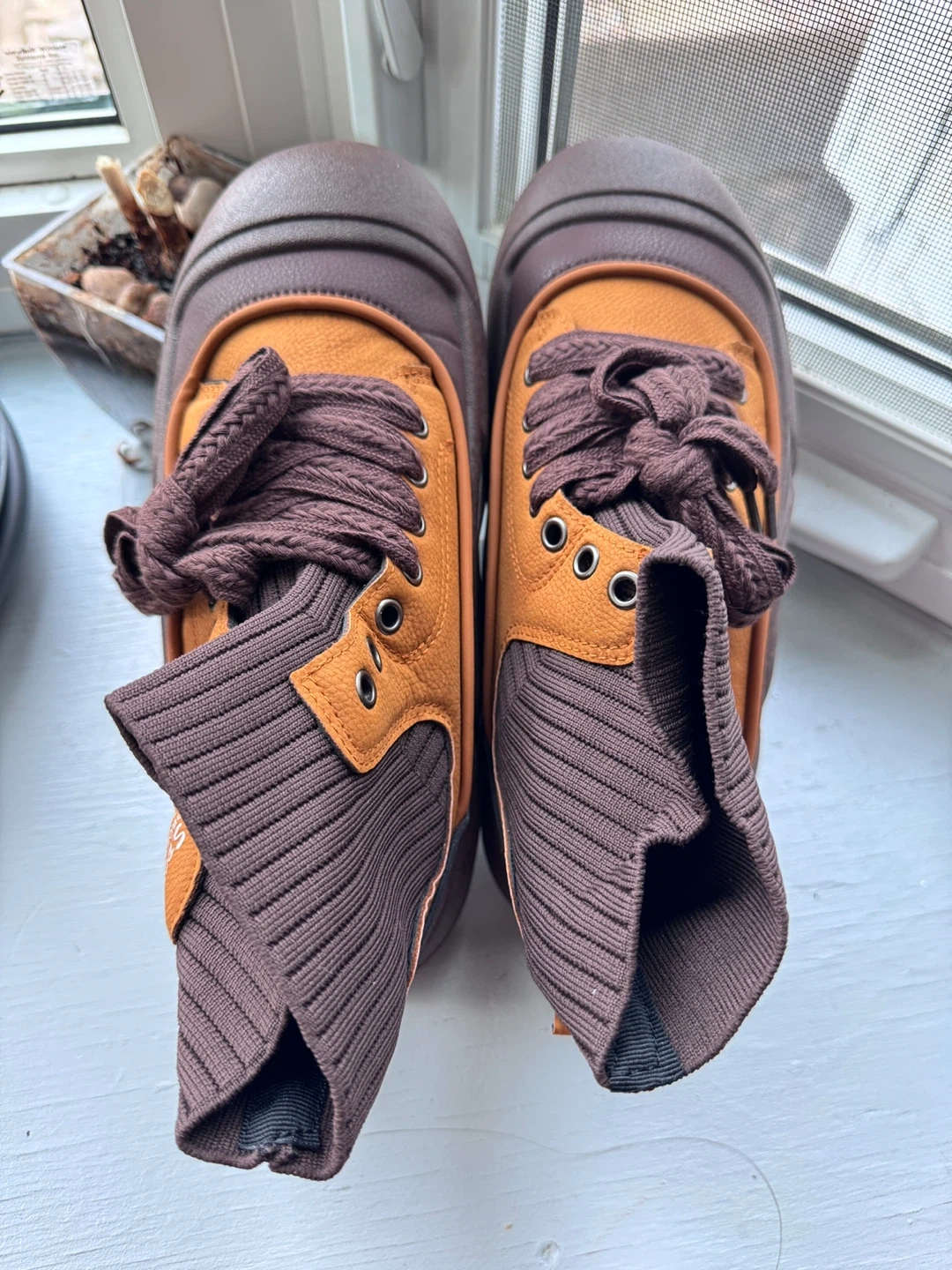 18Selling a pair of brown and orange lace-up boots! They are in great condition and ready for a new home.