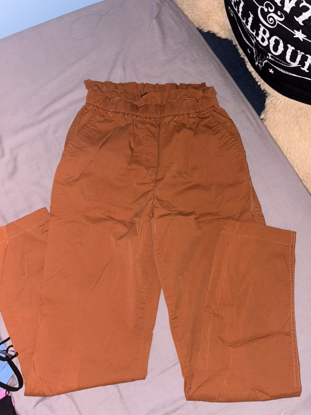 These brown pants feature a paper bag waist style! They are in good condition and ready for a new home. Perfect for a casual or dressed-up look
