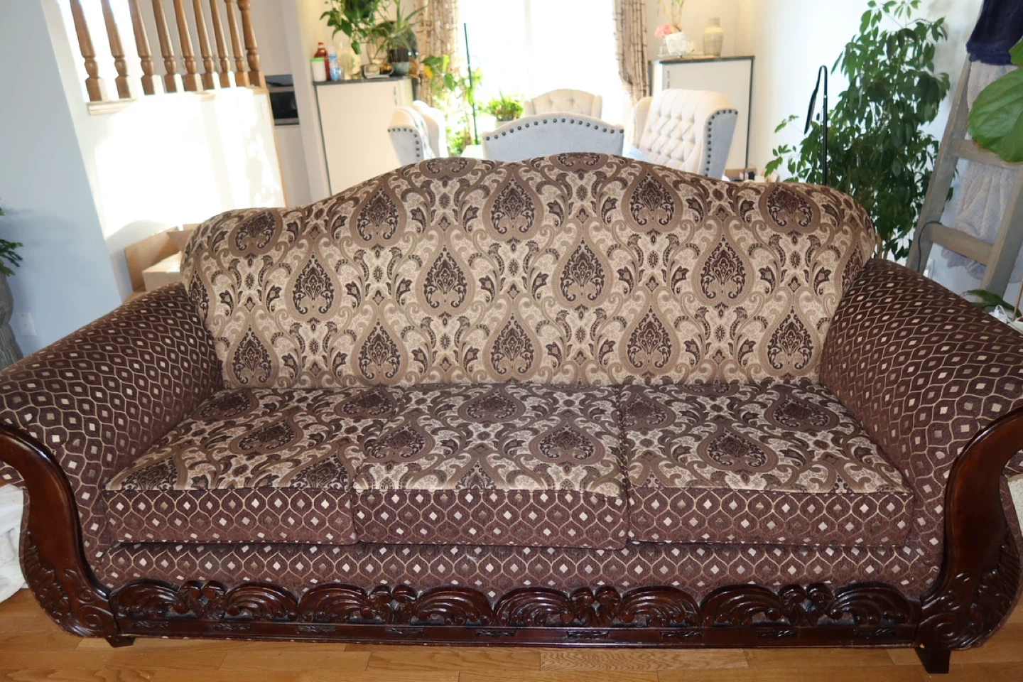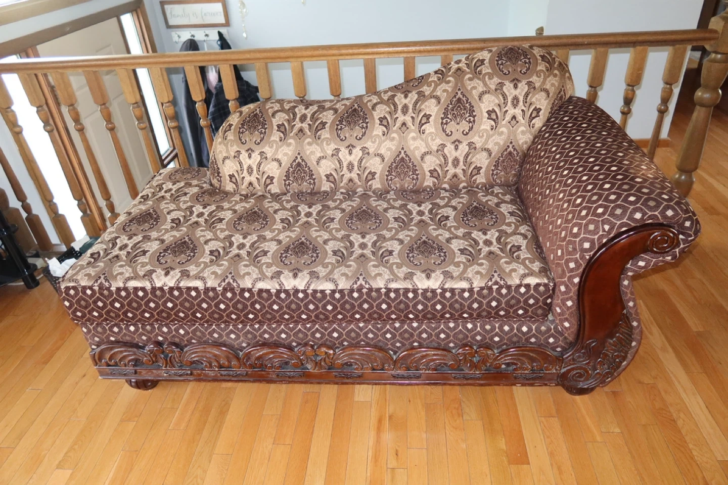 10Selling a matching sofa and chaise lounge set. Both pieces feature a brown patterned fabric and dark wood trim. They would make a great addition to any living room! Included 2 sofas, a chaise, and a ottoman