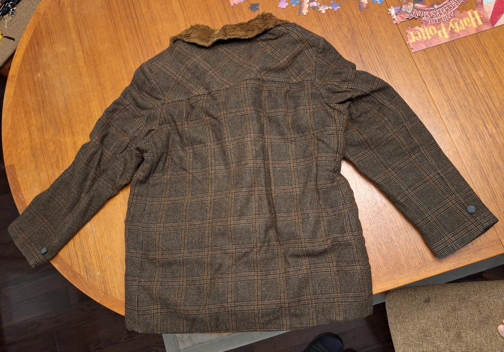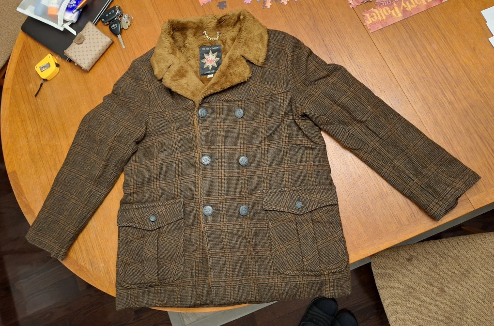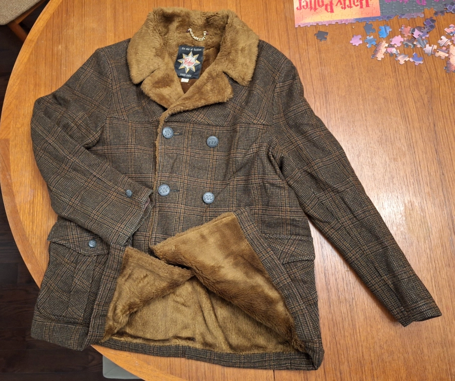 Here's a stylish brown plaid jacket. It features a faux fur collar and lining. The jacket is in great condition and ready for a new home!