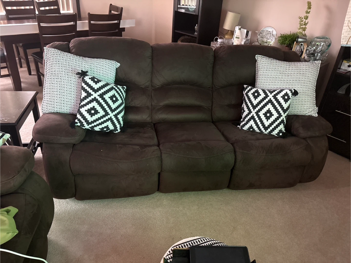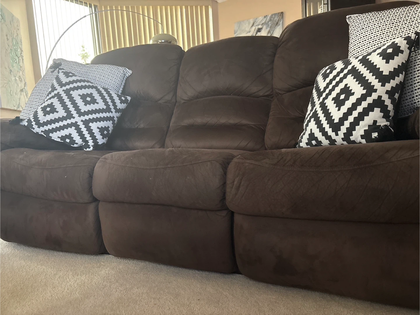 Selling a comfy brown reclining sofa! It's perfect for relaxing after a long day. The sofa is in good condition and has three seats.