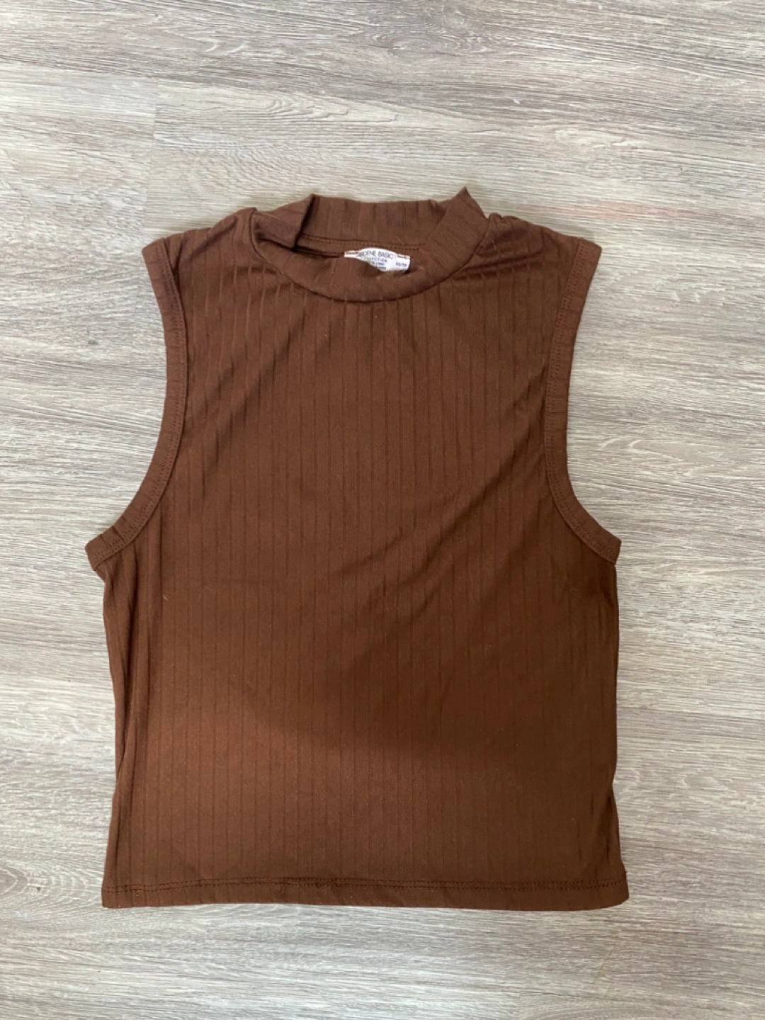 Chocolate brown sleeveless crop top. Mock neck. Ribbed material. Great for layering or wearing alone.