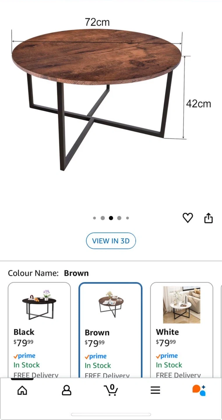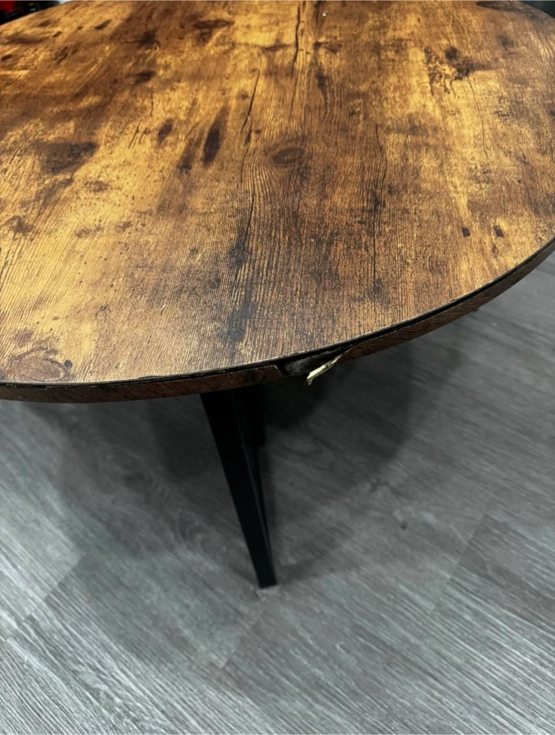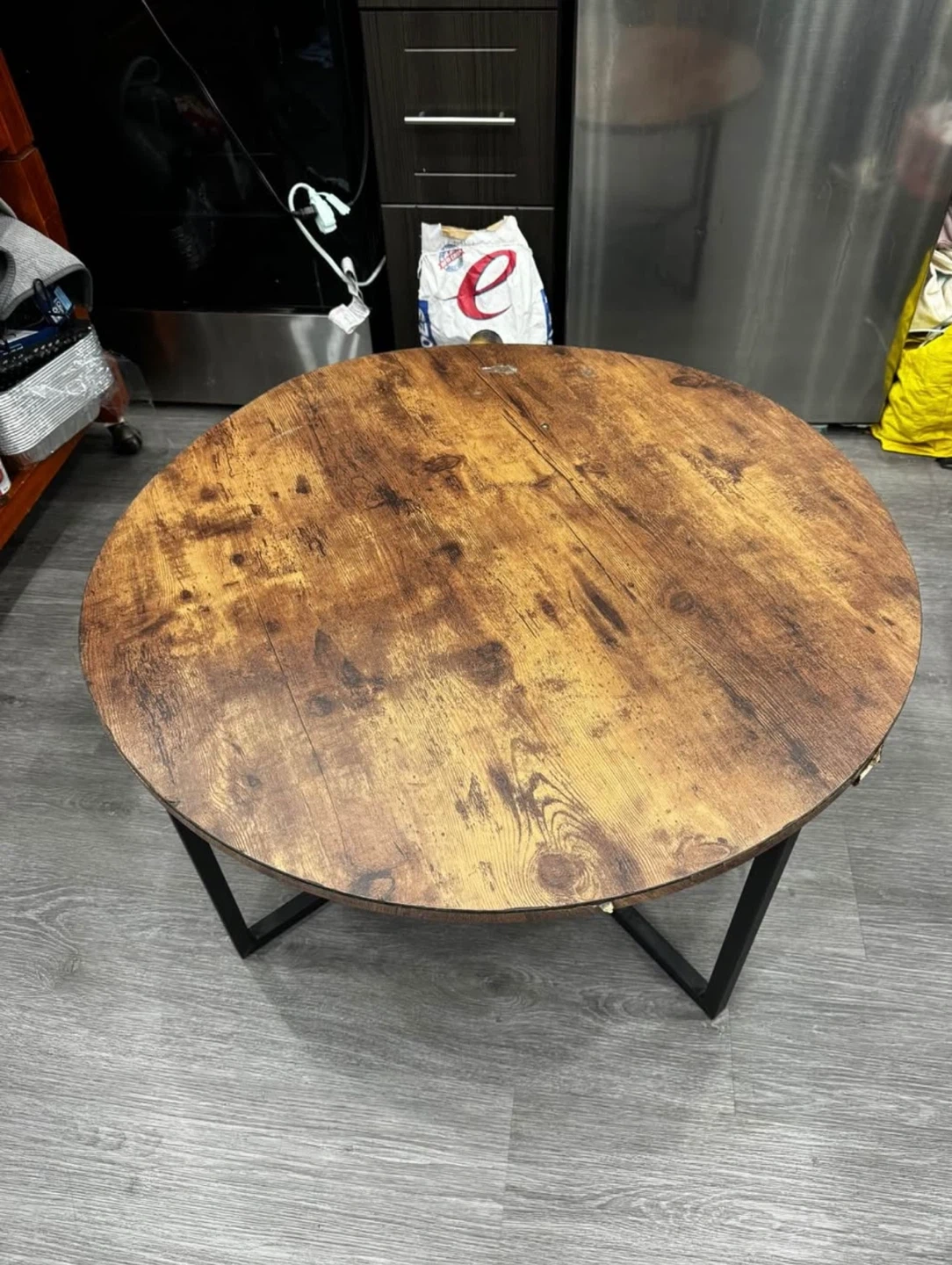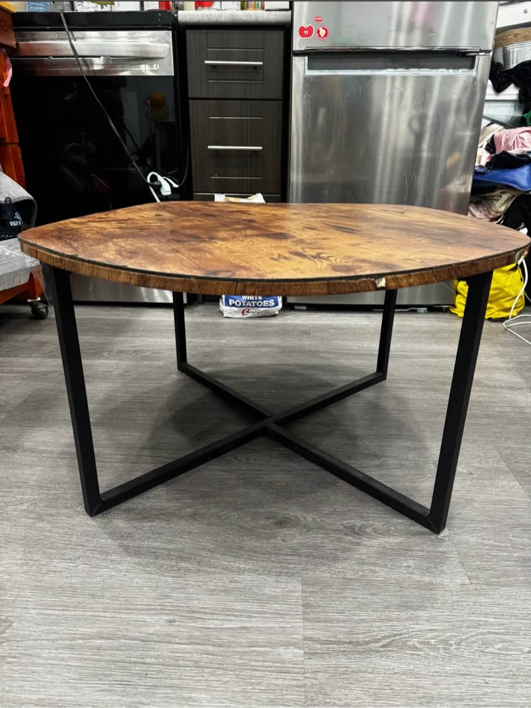 150Selling a brown round coffee table! It has a rustic wood grain top and black metal legs. The table is 72cm in diameter and 42cm high. There is some slight damage on the side, as shown in the photos Pick up only