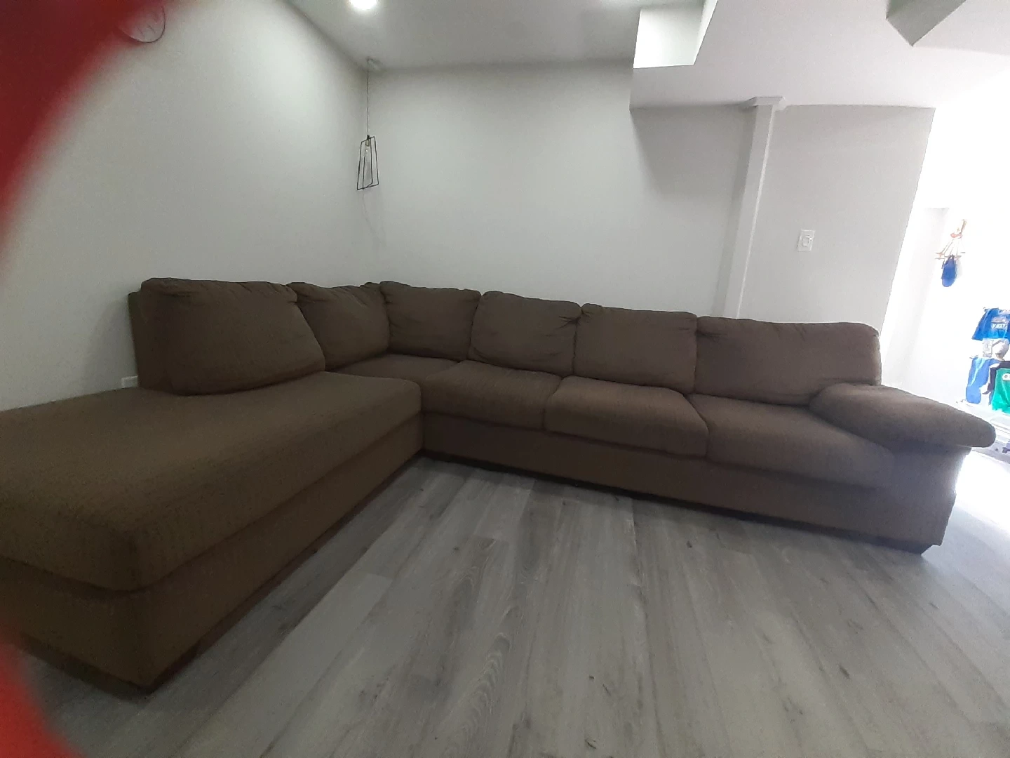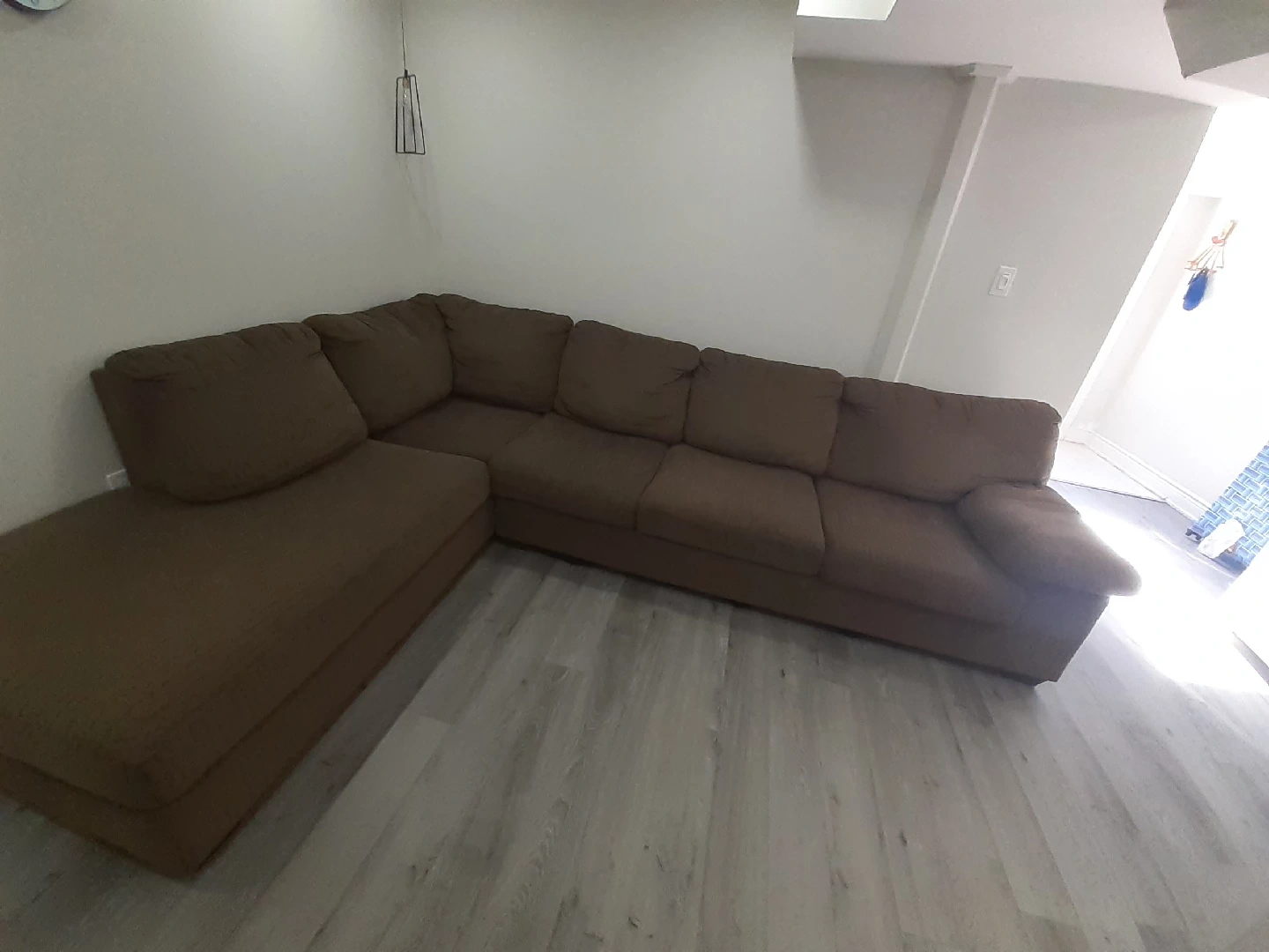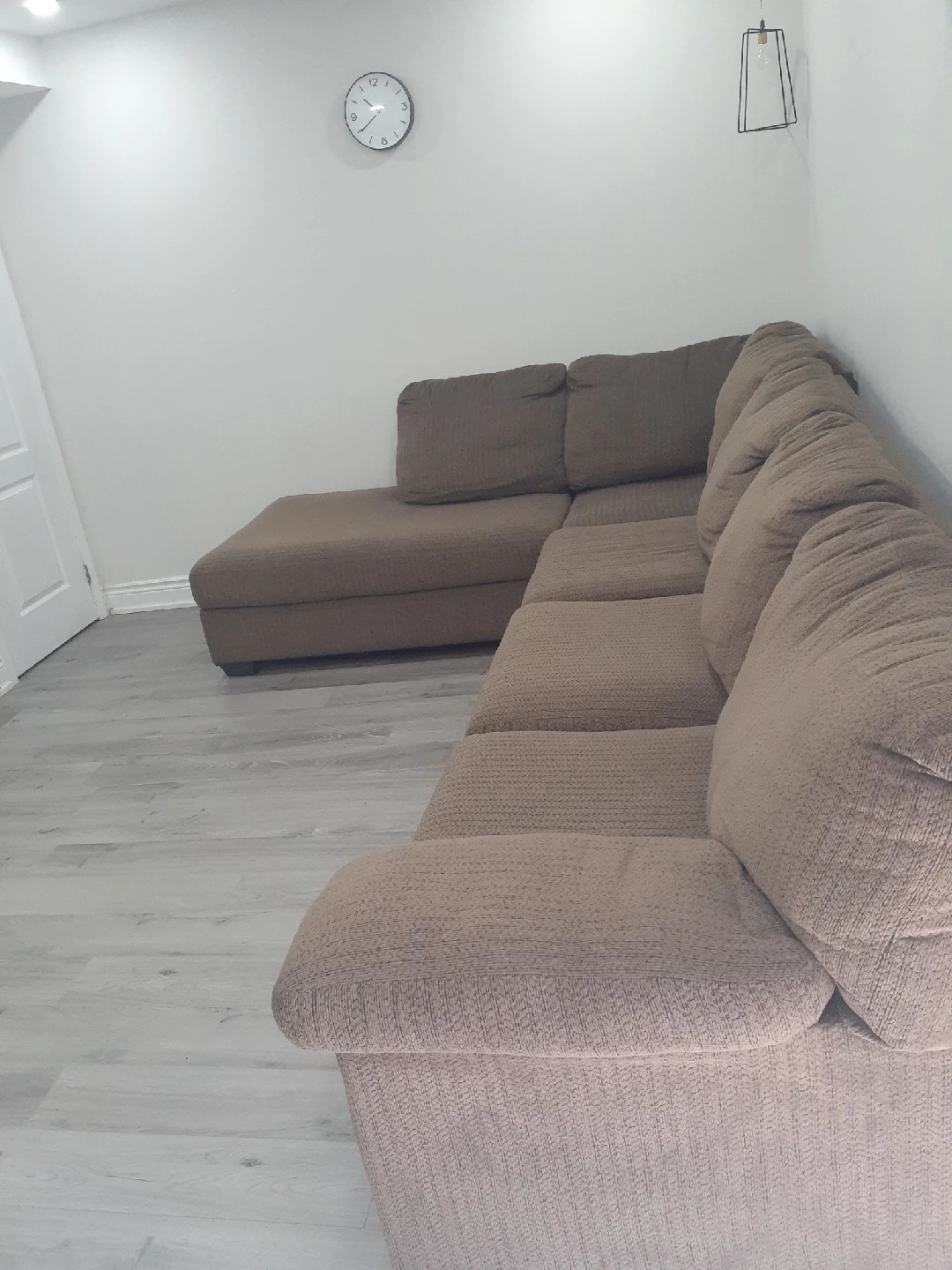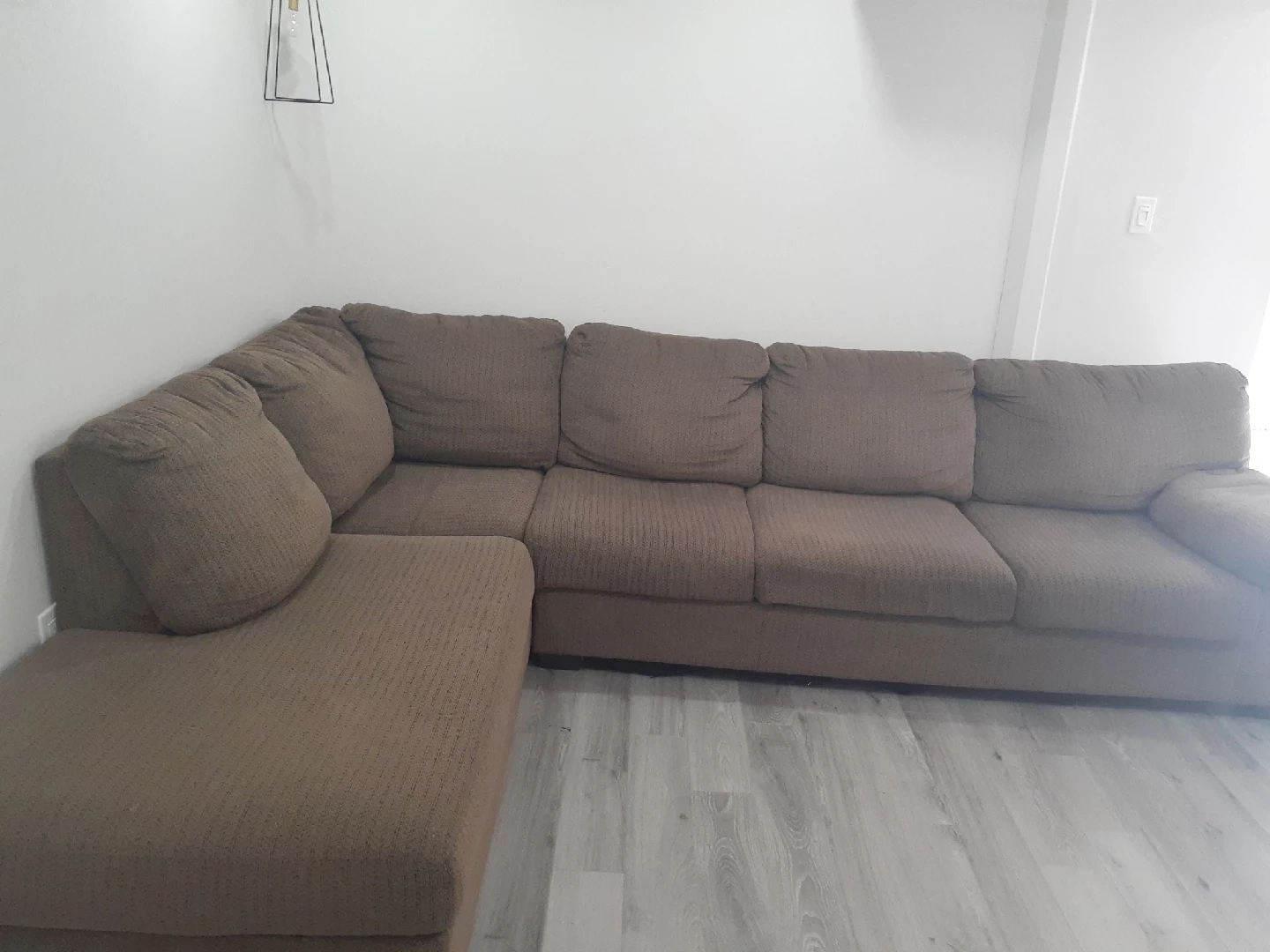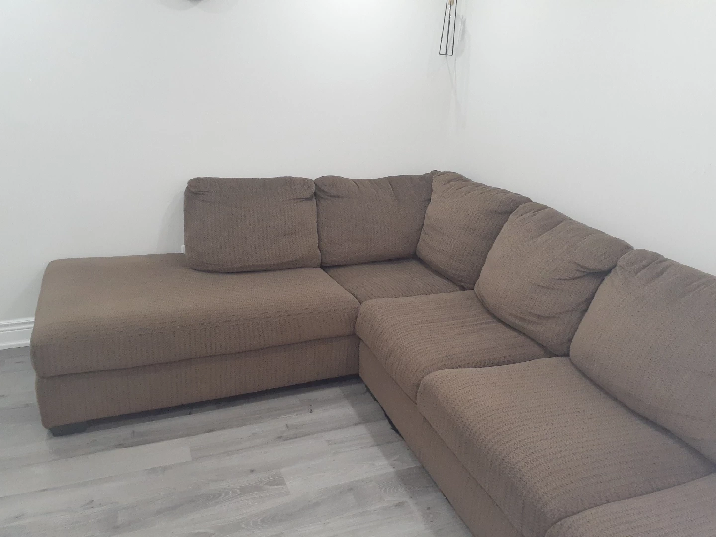 Selling a comfortable brown sectional sofa with a chaise lounge! It's in great condition and perfect for a living room or family room. It features a neutral brown colour that would fit in with many different styles of decor. Great for lounging and relaxing!