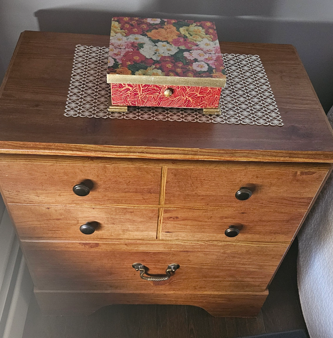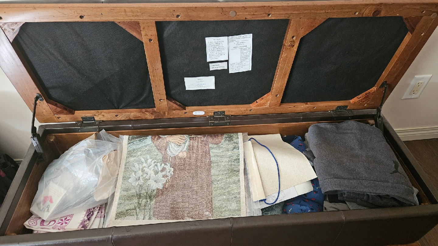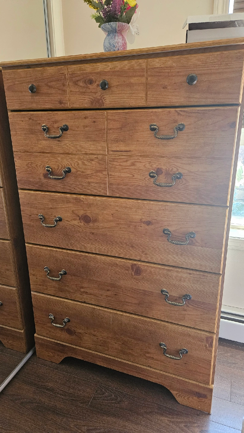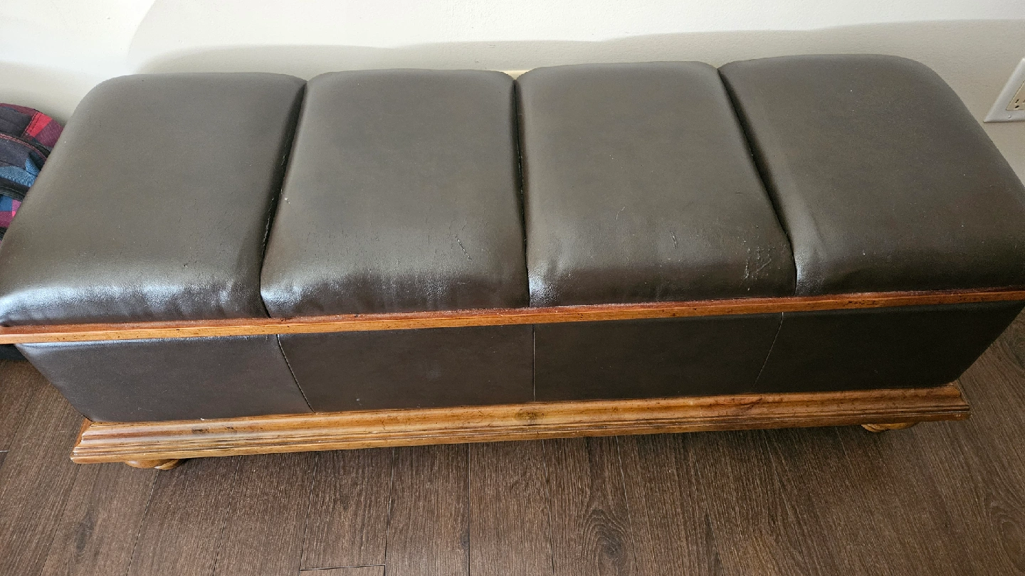 I'm selling a brown storage ottoman with a wooden frame. It's great for storing blankets or other items. Also included is a wooden dresser with multiple drawers. Both pieces show some signs of wear but are still functional and useful