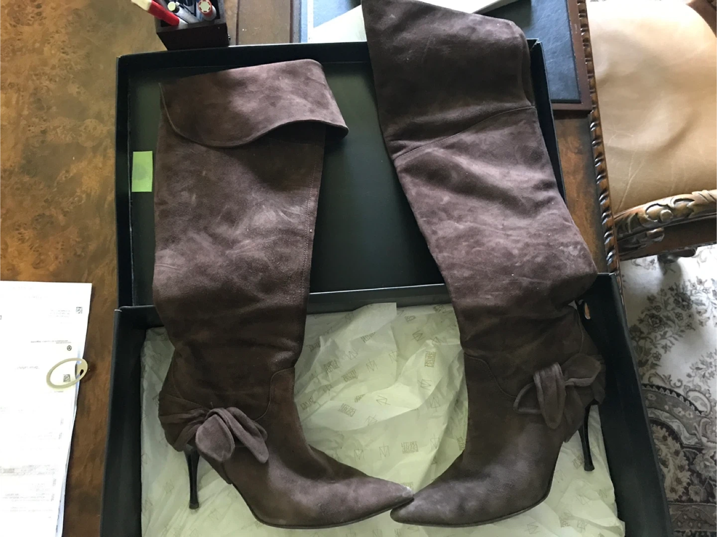 10Selling a pair of “Browns” brown suede over-the-knee boots. They come with a stylish bow detail and a stiletto heel. Perfect for adding a touch of elegance to any outfit! They come in the original box.