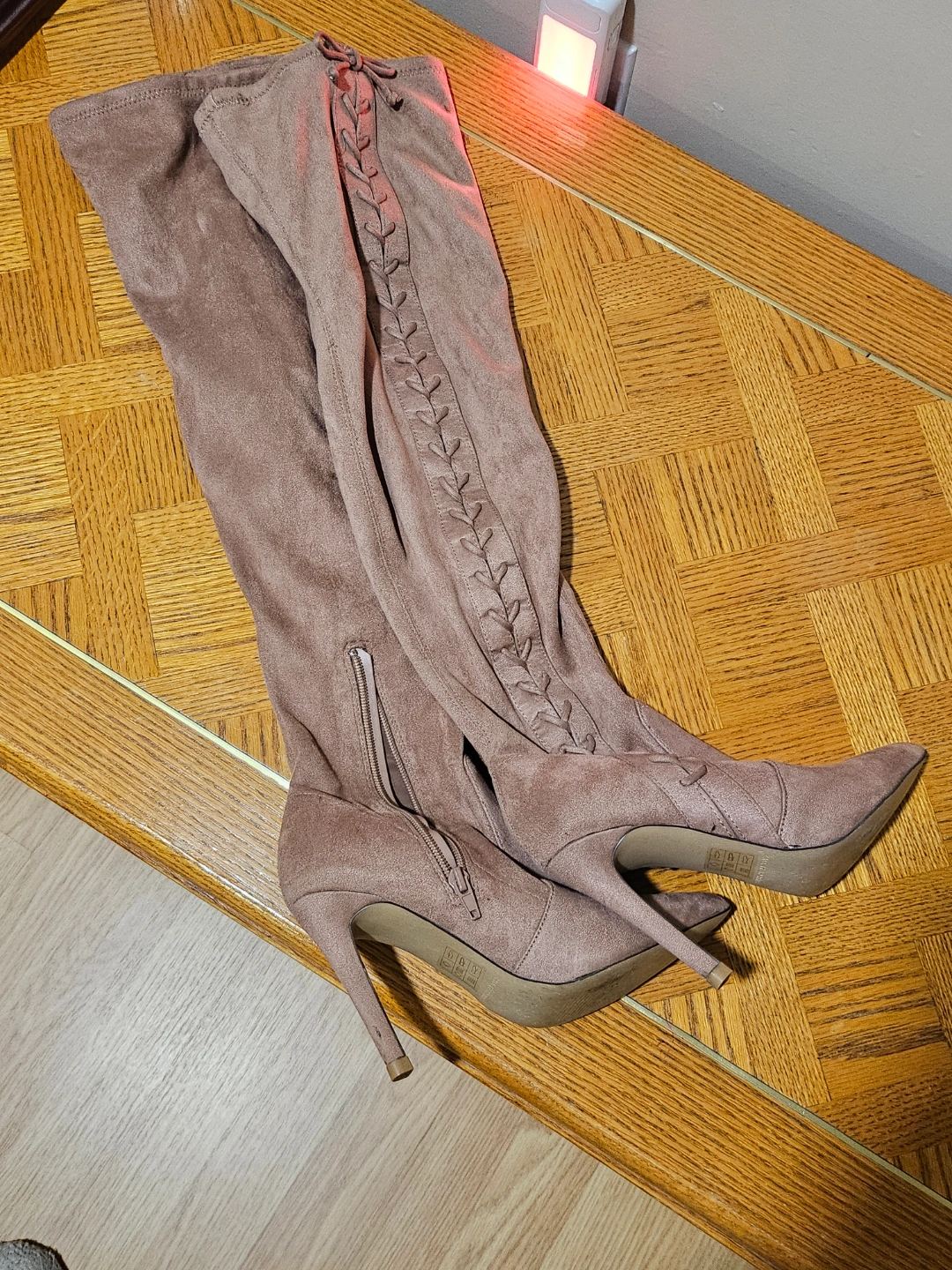 Pair of mauve suede over-the-knee boots. Features a stiletto heel and lace-up detail on the side. Zipper closure.