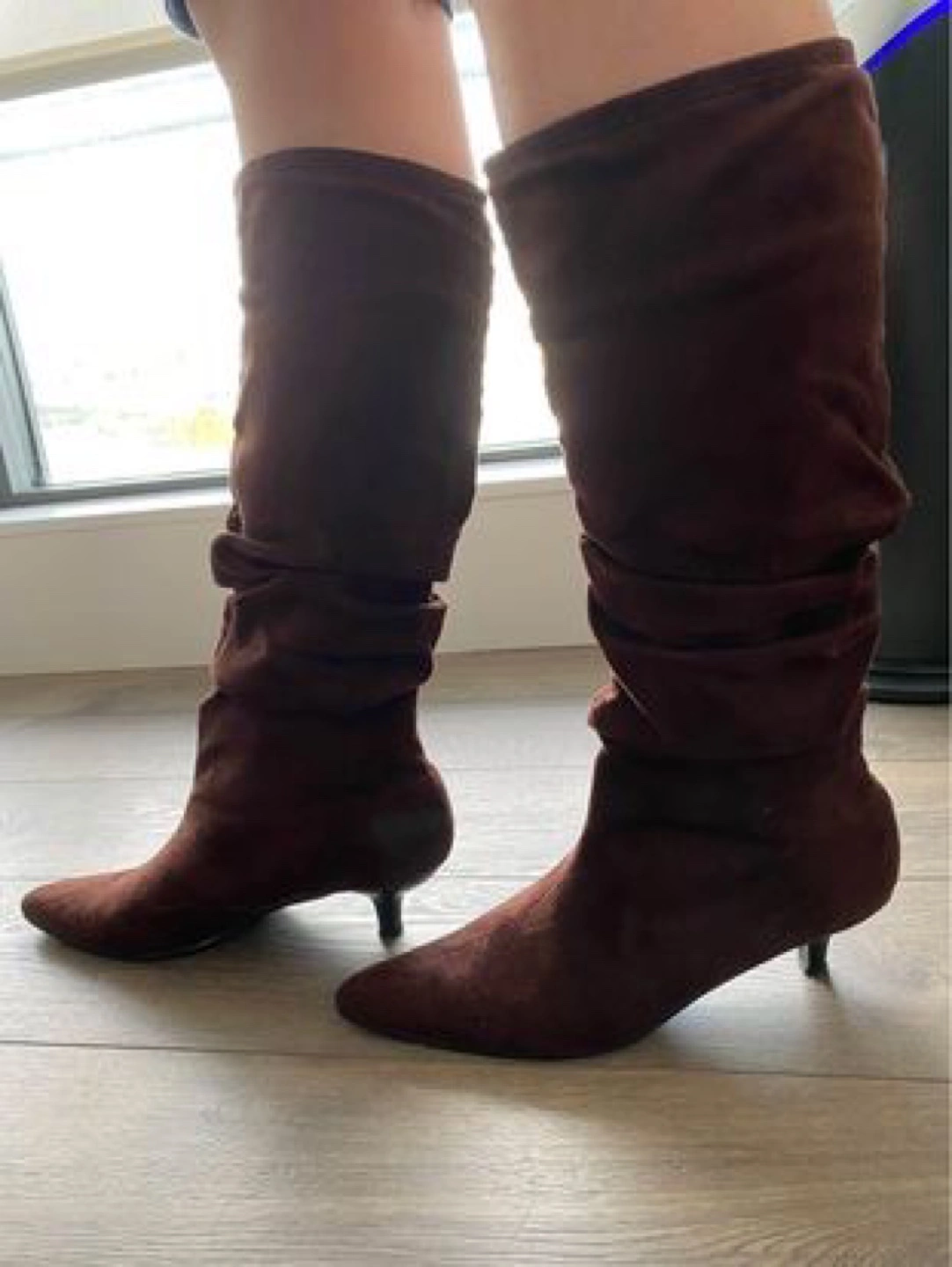 Pair of brown suede slouch boots. Pointed toe. Low kitten heel. Knee-high.
