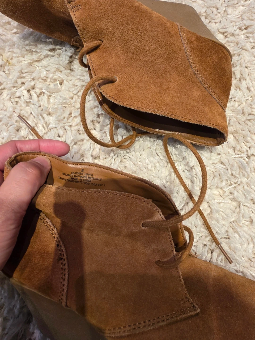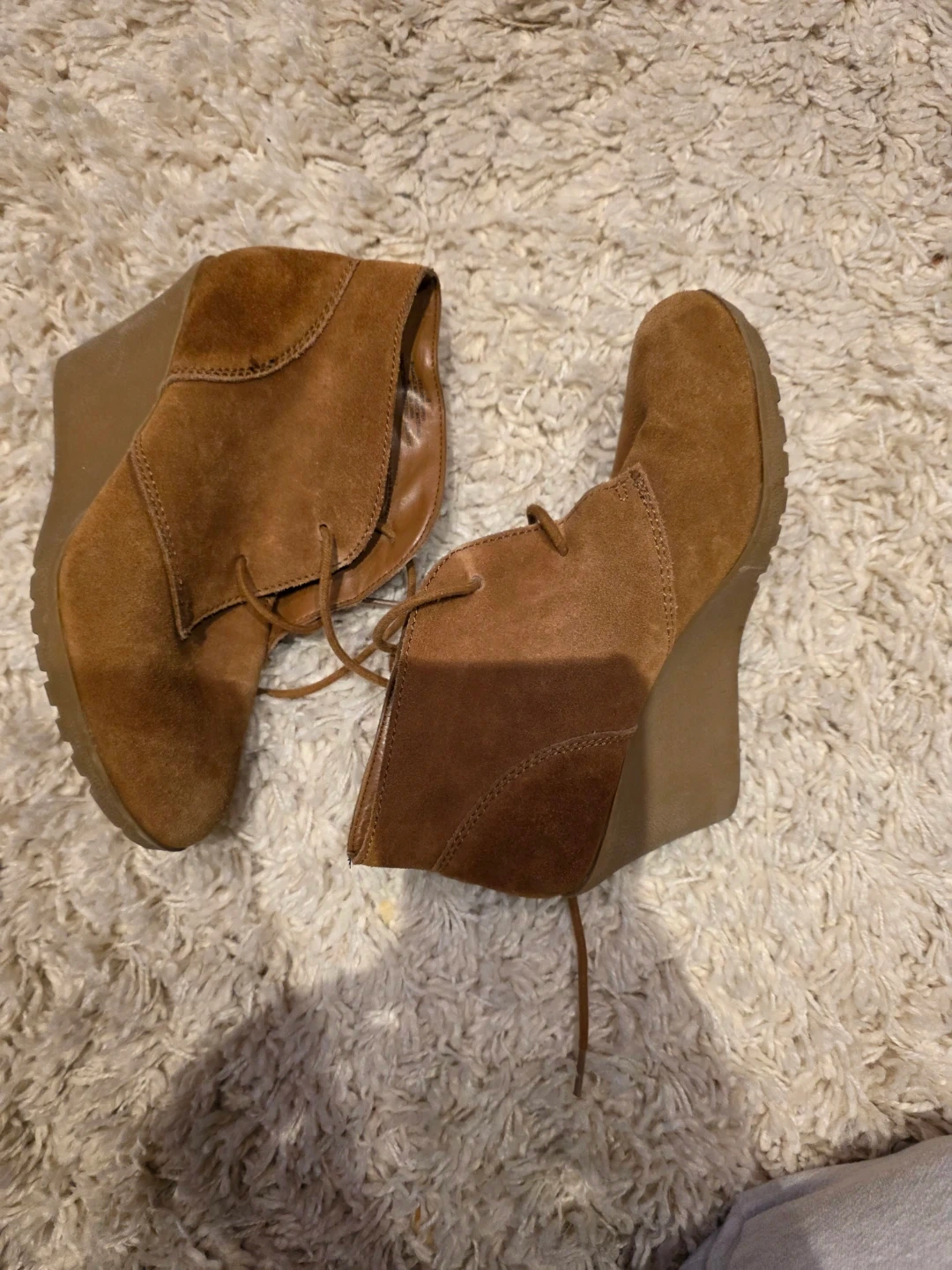 66Selling a pair of brown suede wedge booties in size 8. They're in good condition and ready for a new home! The upper material is leather.