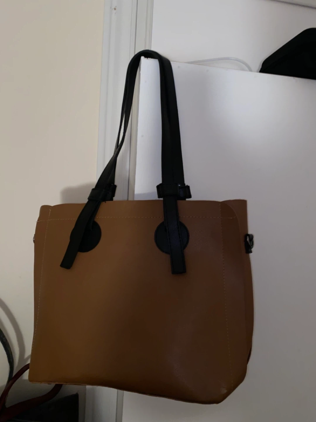 10A simple brown tote bag, perfect for everyday use! It features black straps and accents. It's in good condition.